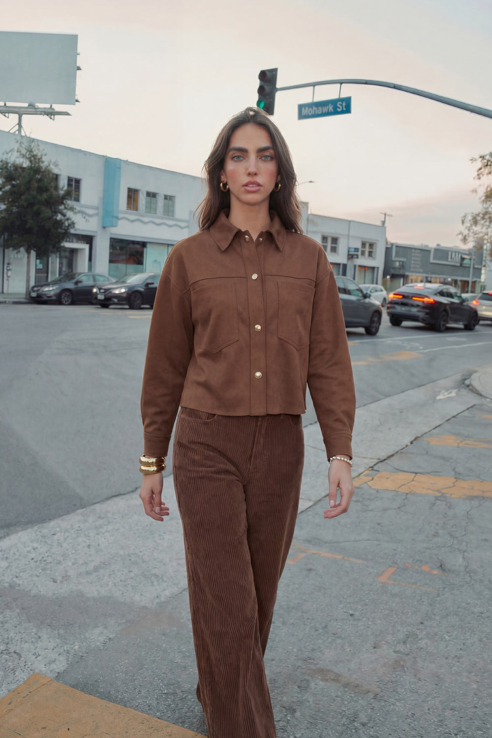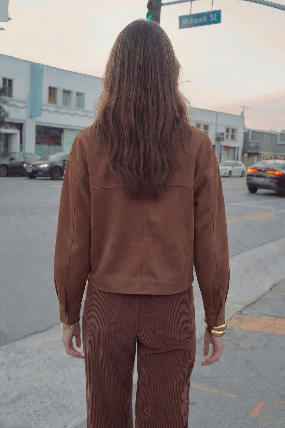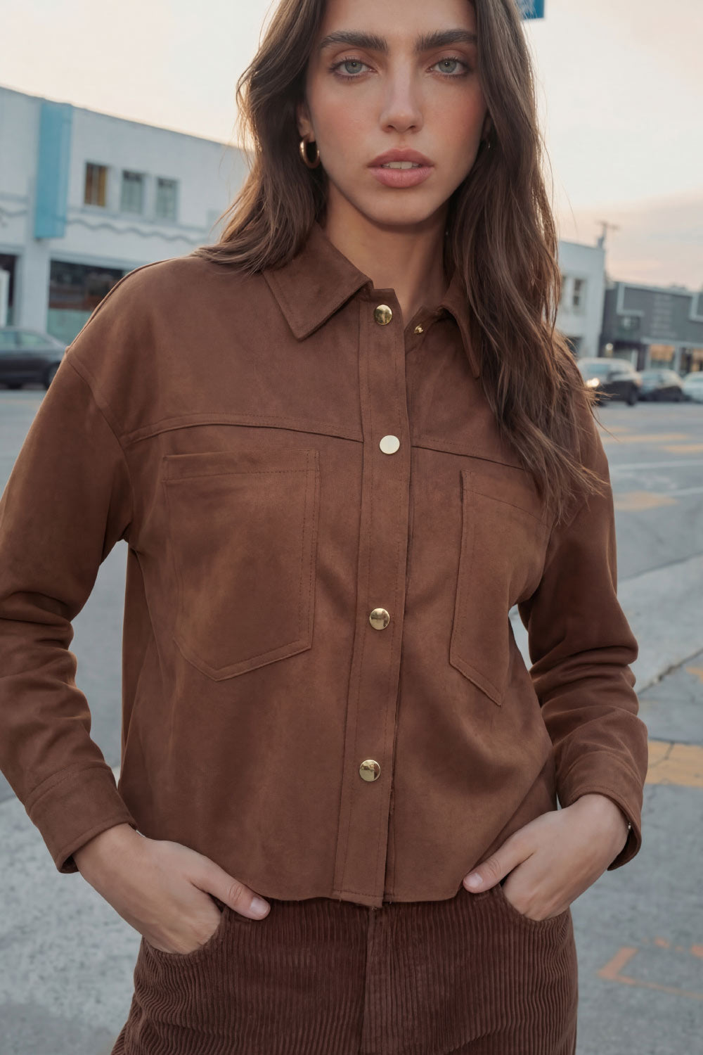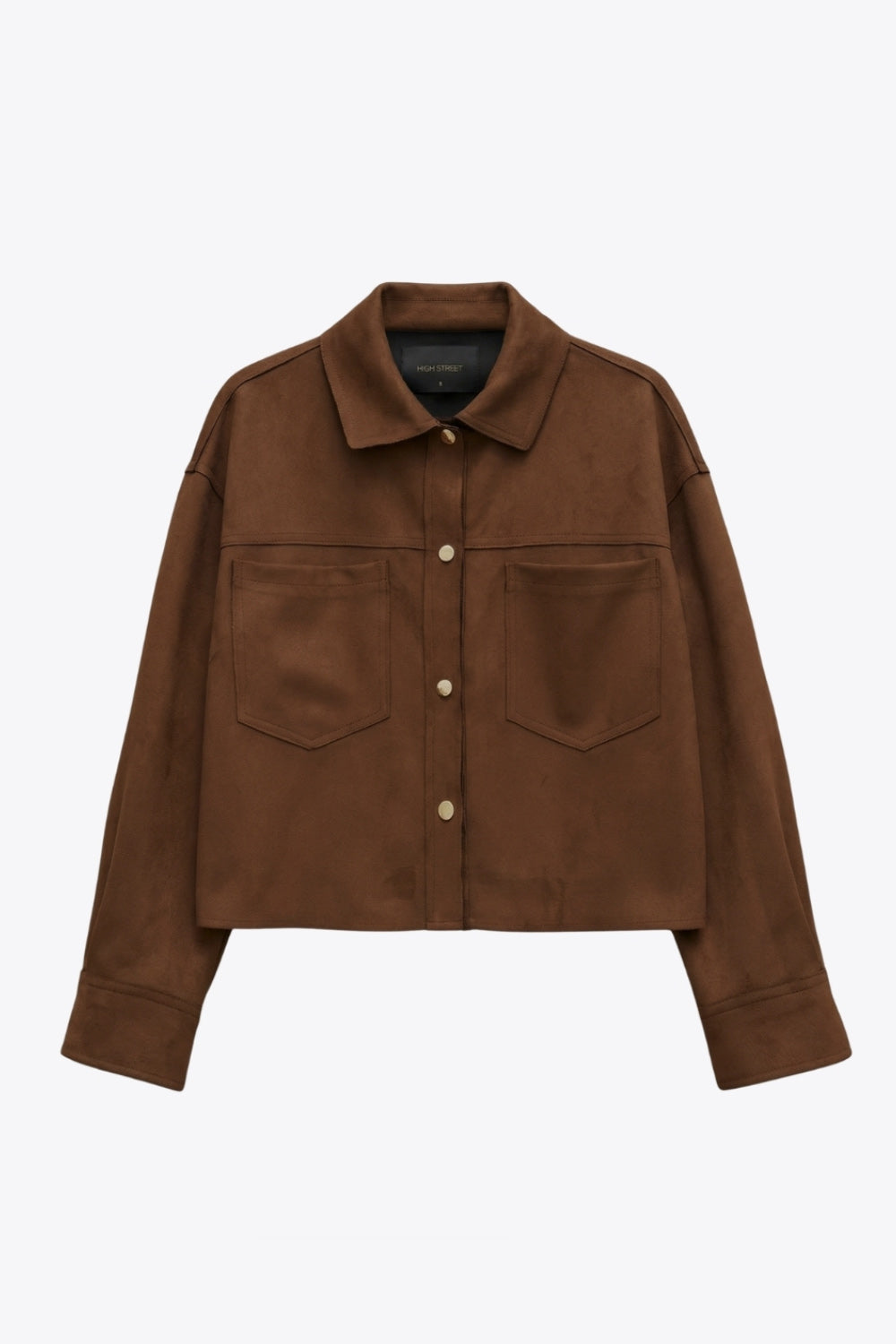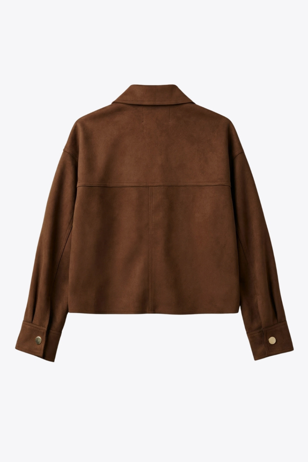 Chamarra corta de gamuza, fit oversized, cuello camisero, manga larga con puño abotonado, corte de bata frontal y posterior, bolsillos frontales de parche y cierre frontal con hilera de botones en contraste.