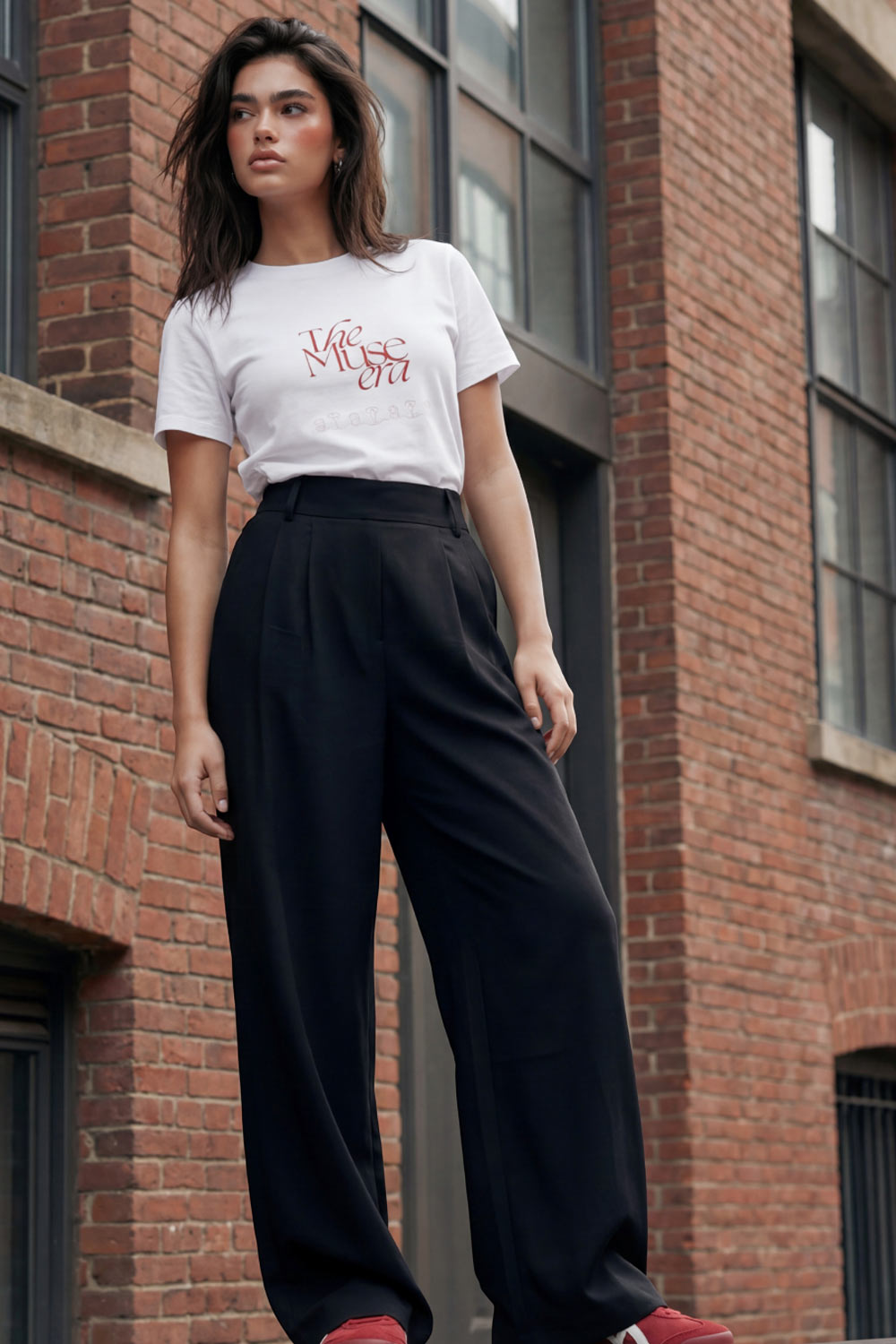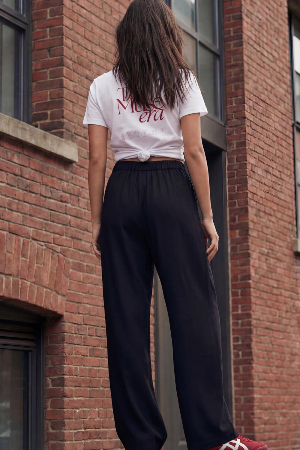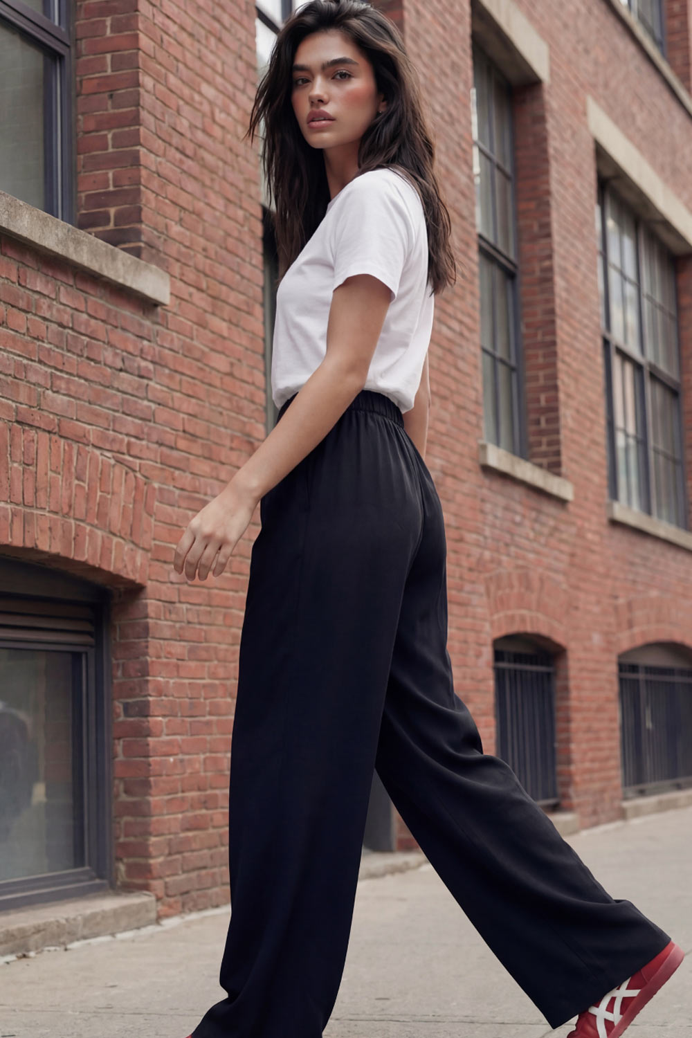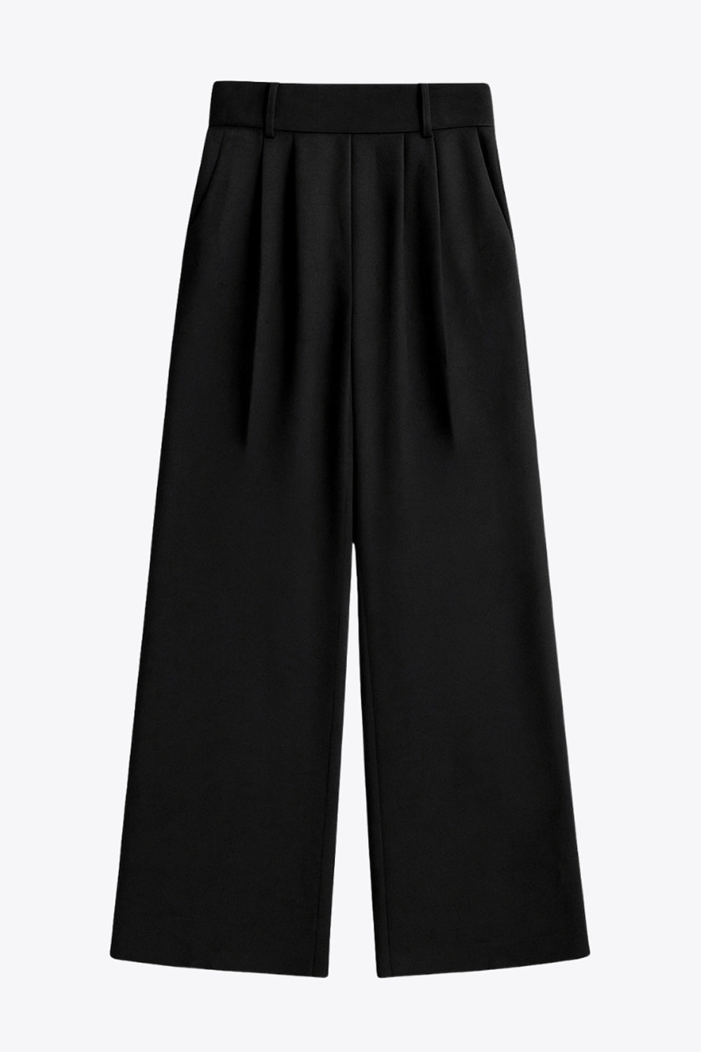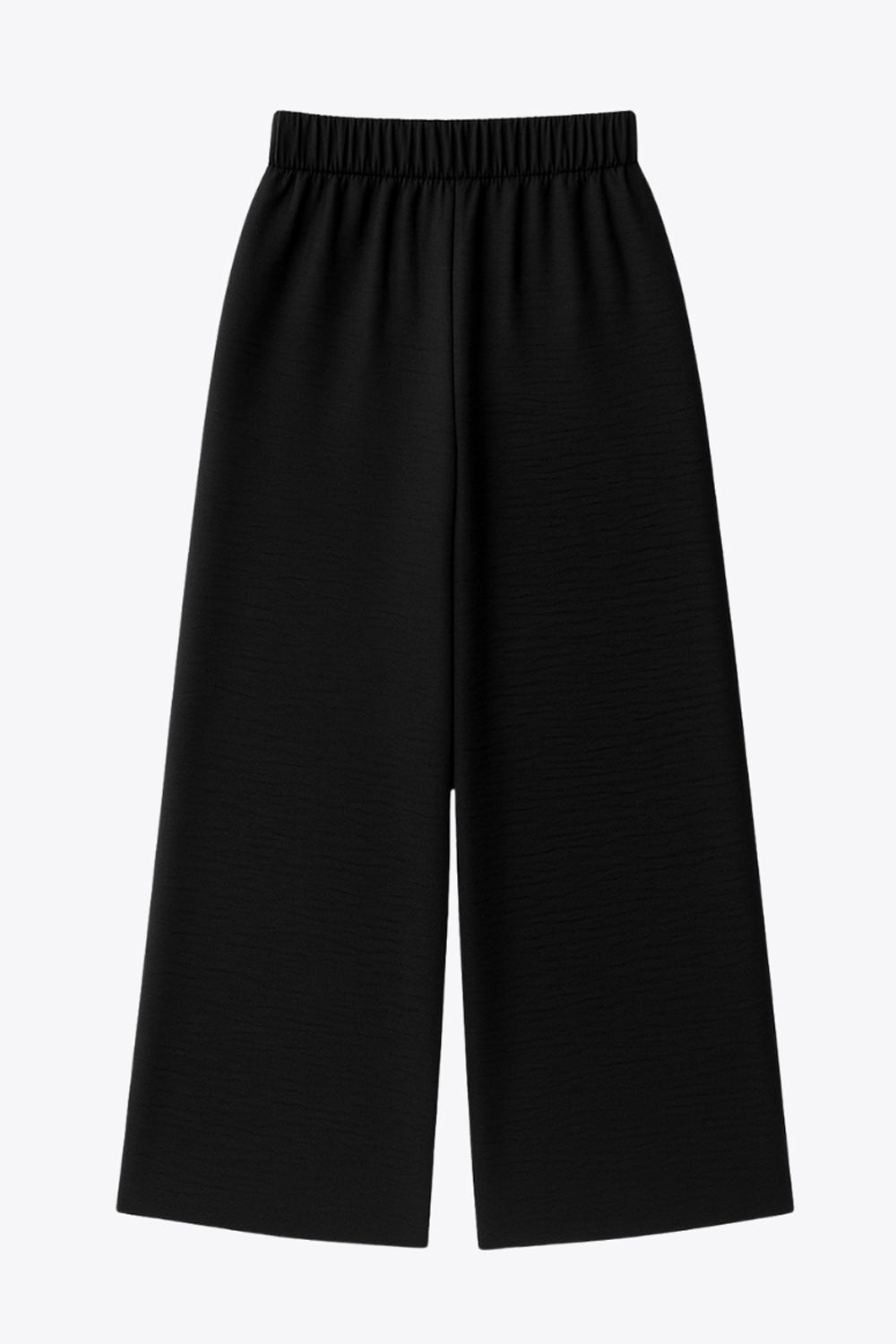 Pantalón fluido de fit wide leg, cintura alta con pretina elástica posterior, trabillas, pinzas frontales y bolsillos delanteros.
