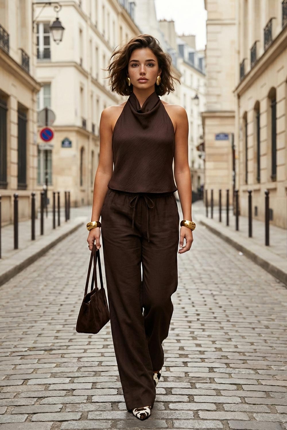 Pantalón fluido de fit recto, bolsillos delanteros, cintura alta con pretina elástica y jareta frontal ajustable.