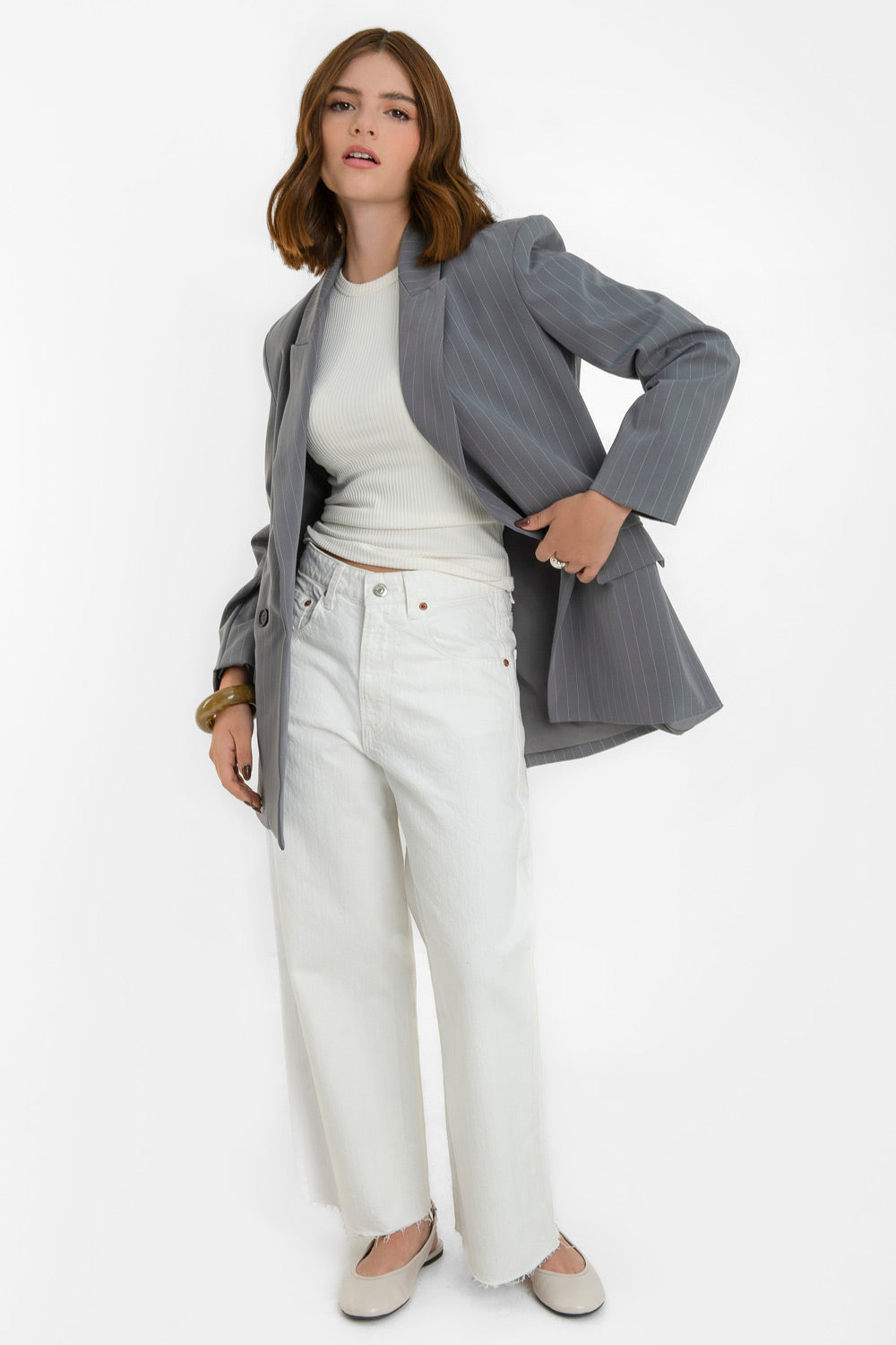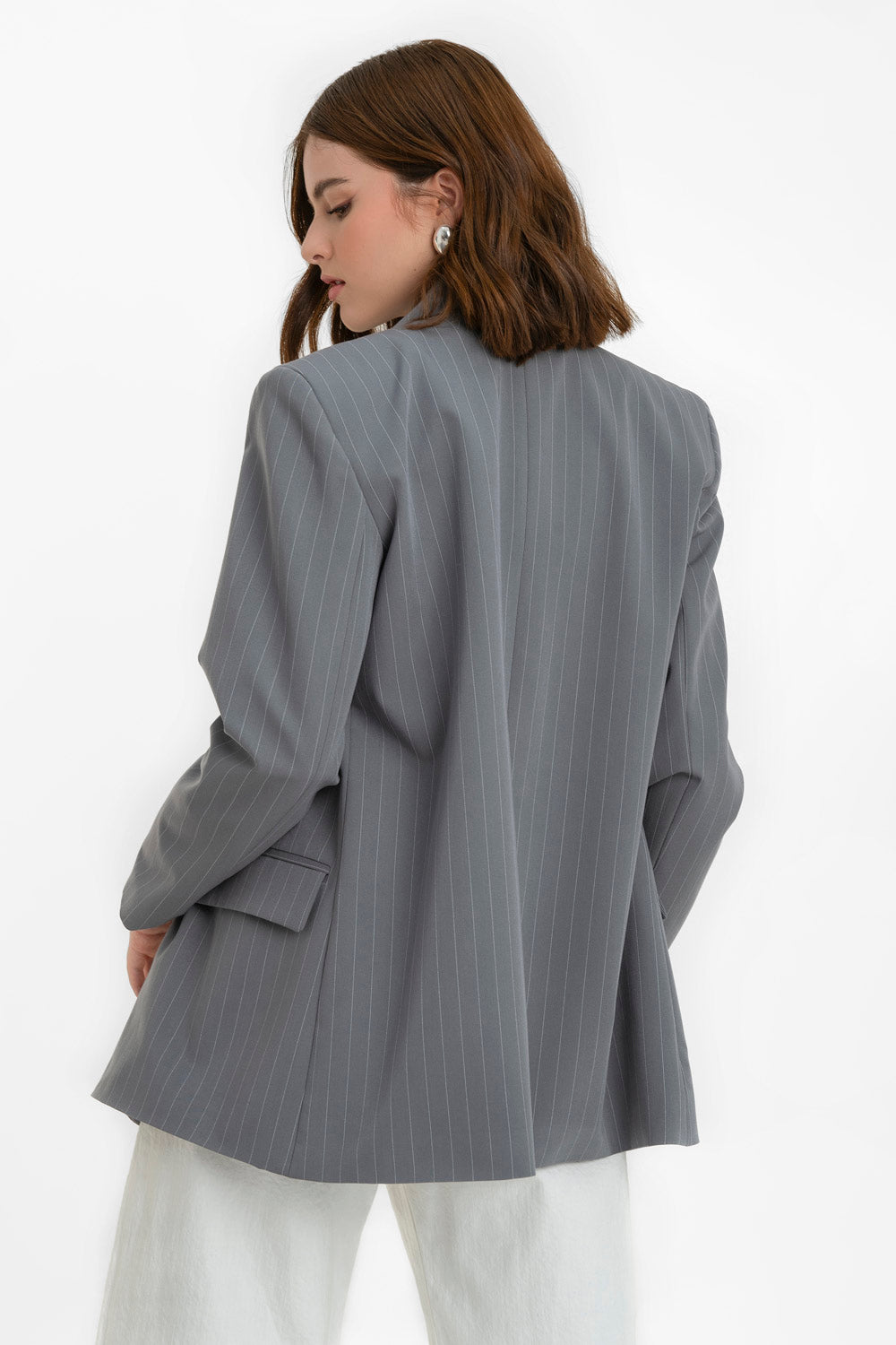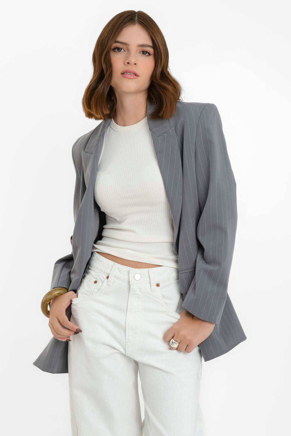Blazer cruzado de estampado rayas, fit oversized, manga larga, bolsillos delanteros con cartera, con solapa y hombreras. Cierre frontal con cruce de botones en contraste.
