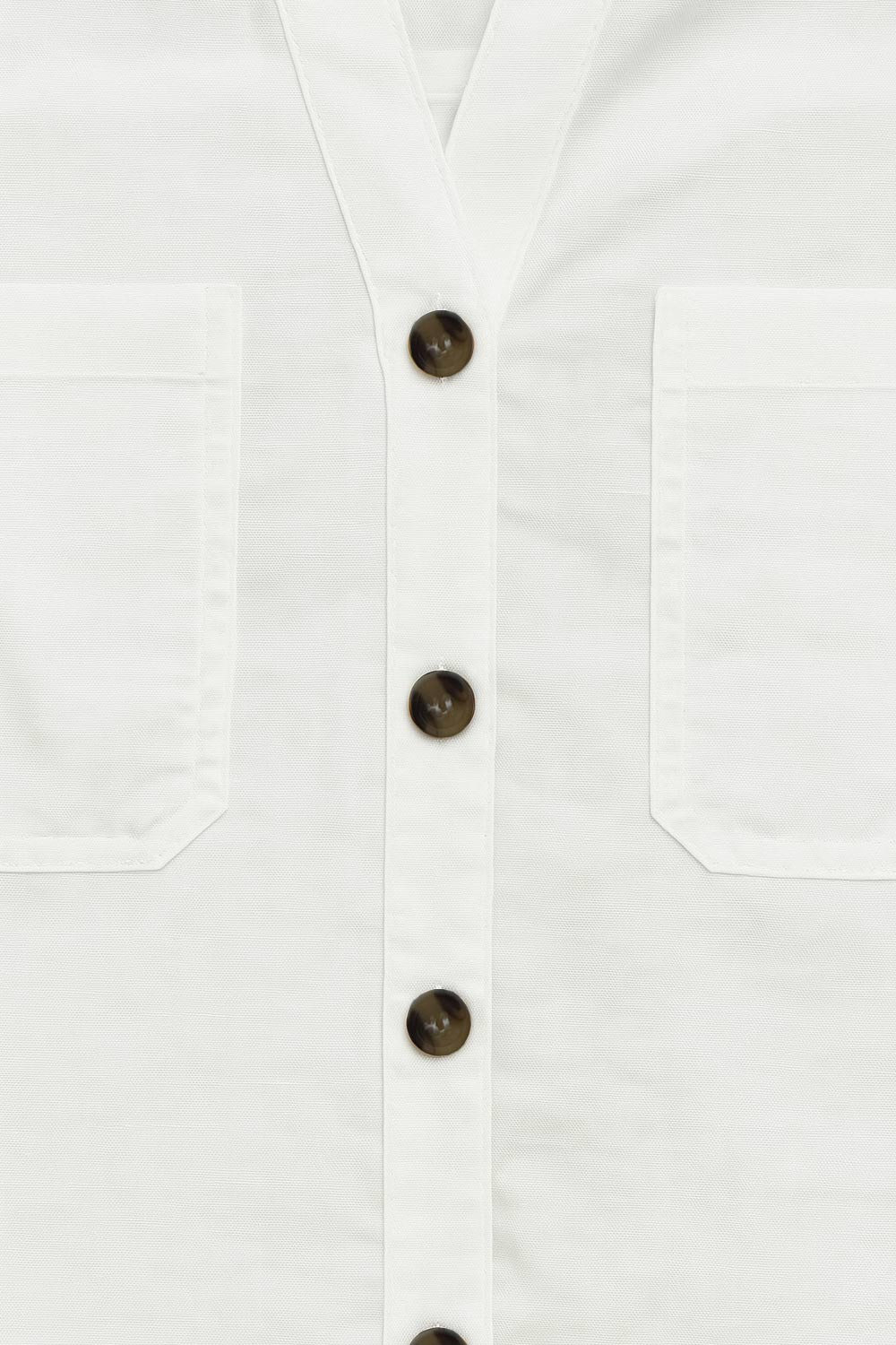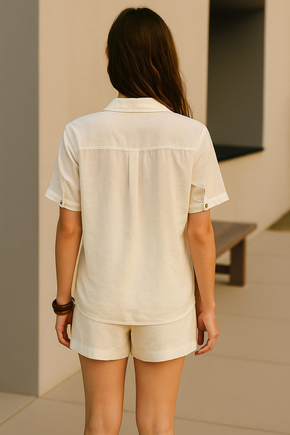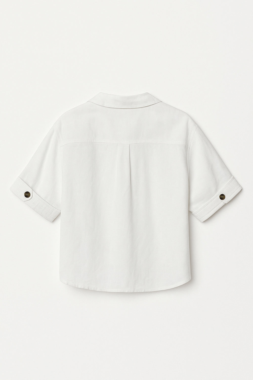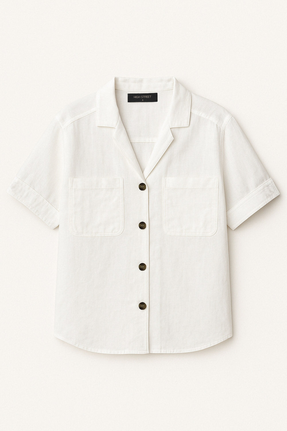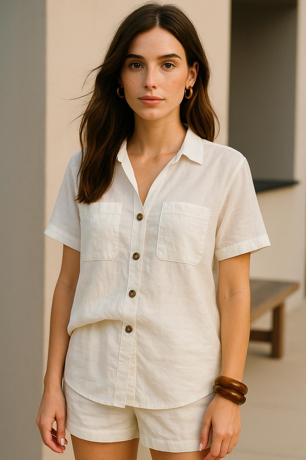Camisa de Lino manga corta amplia, bolsillos frontales, con hilera de botones.