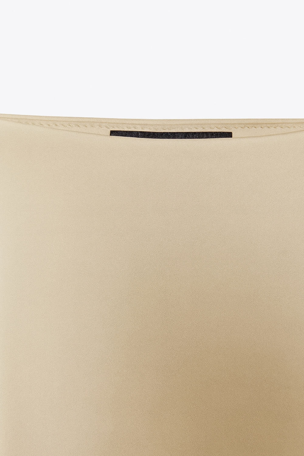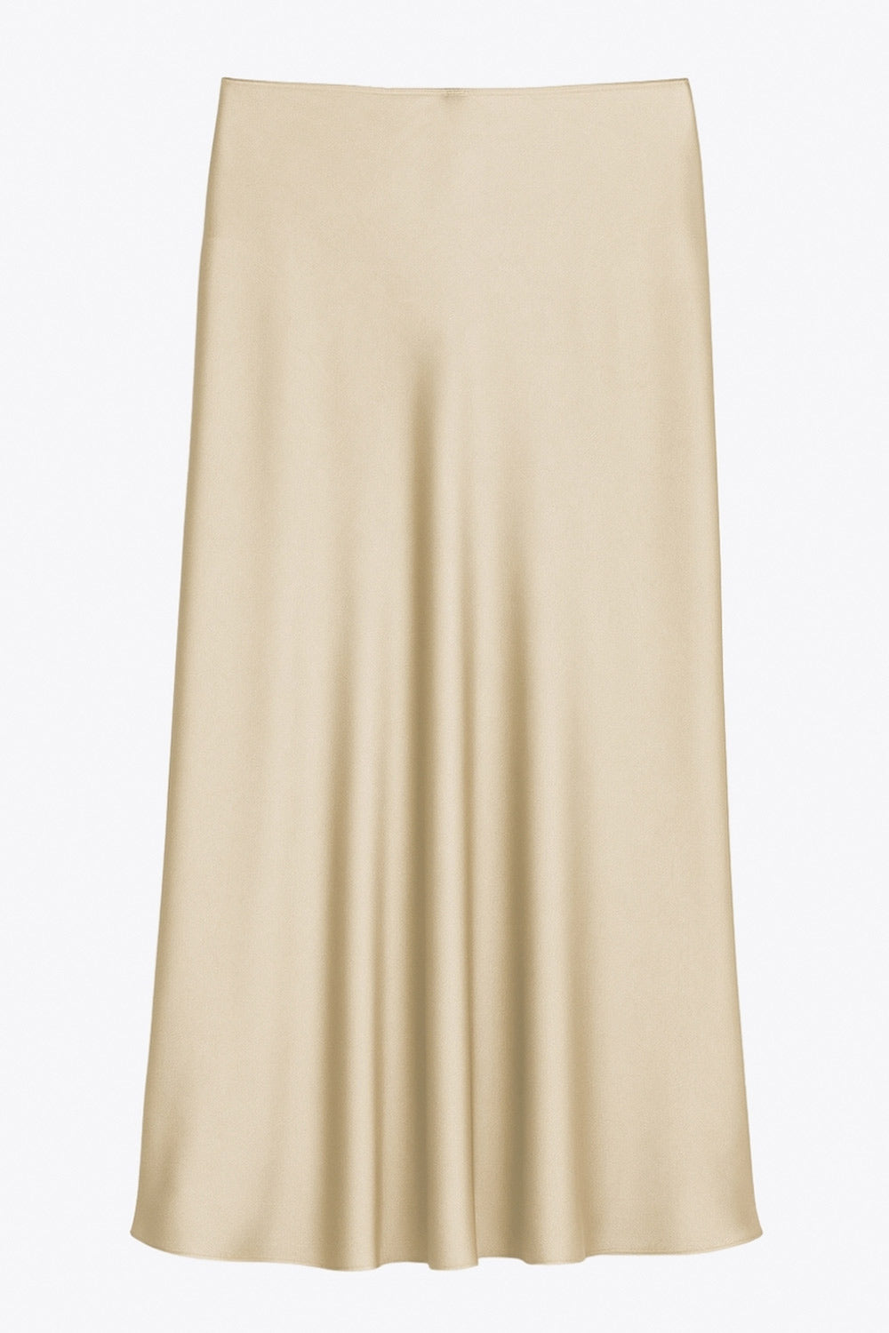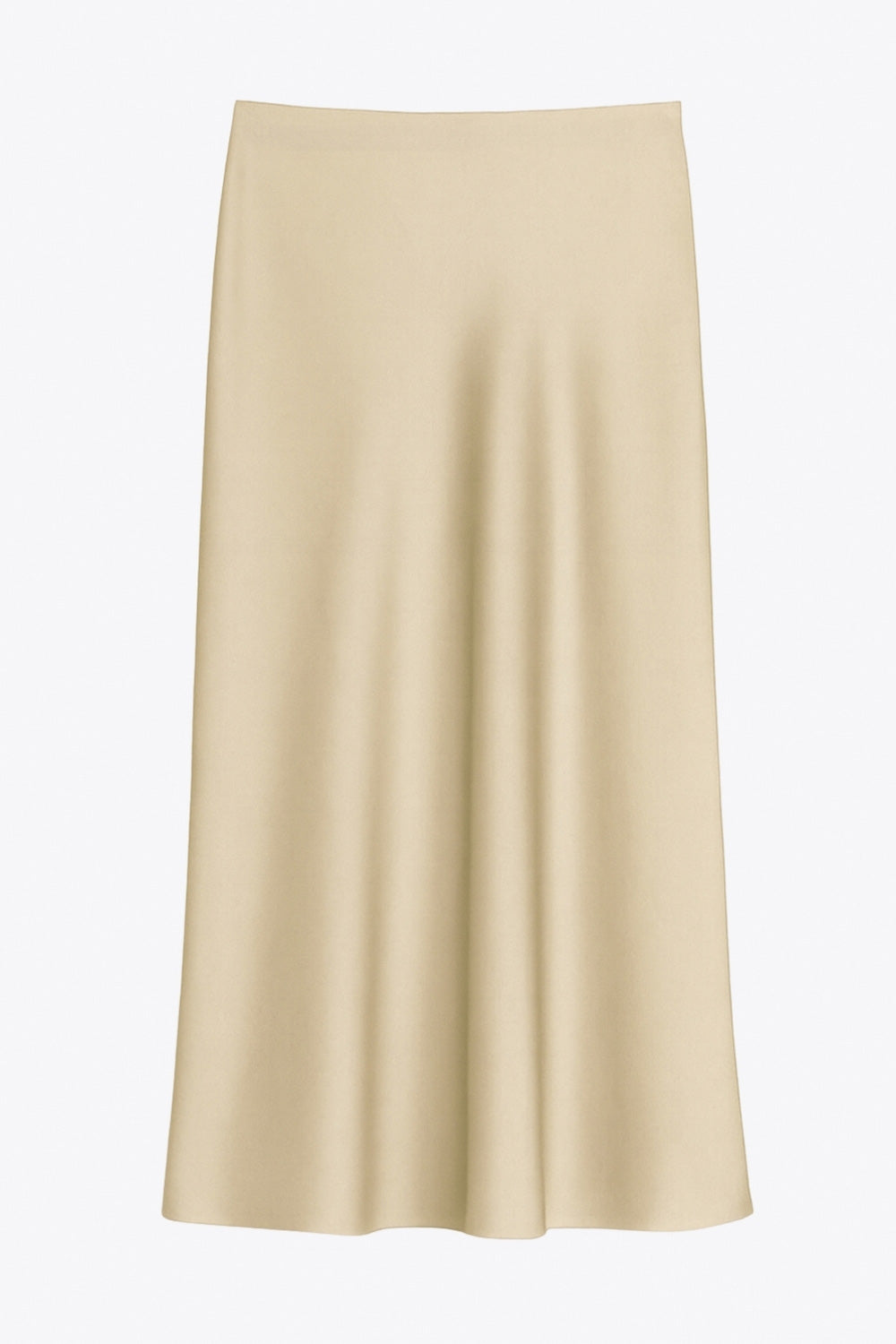 Falda midi satinada de cintura alta con pretina elástica y fit recto.