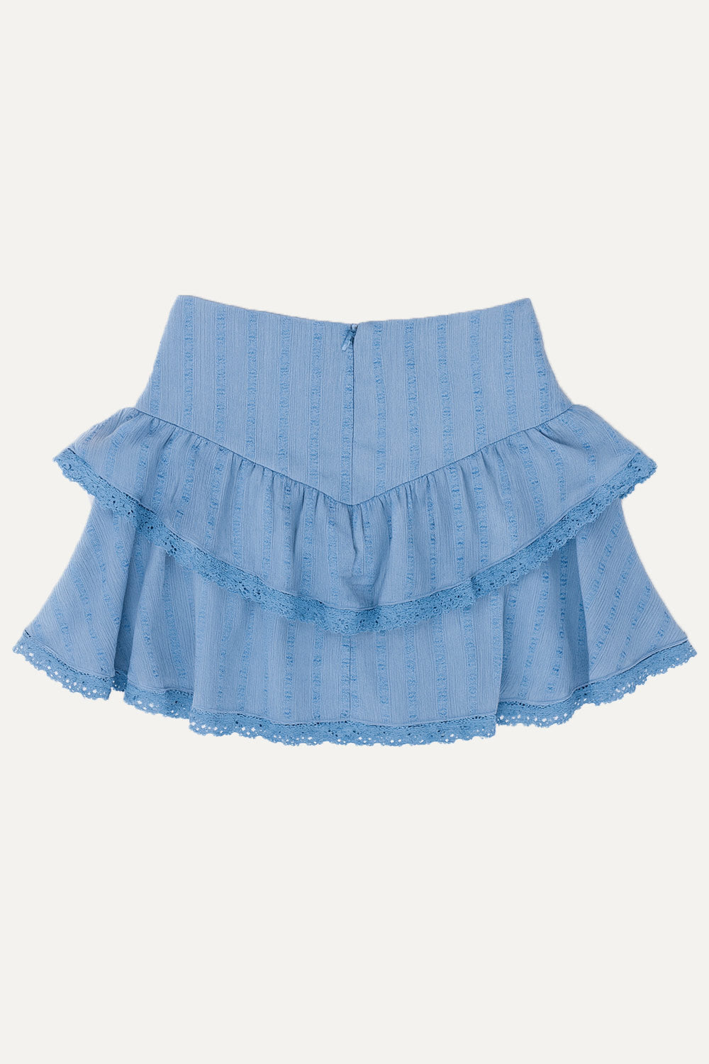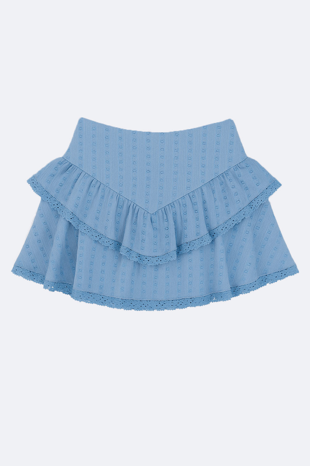 Falda short corto de cintura alta con pretina v frontal, corte en a, capas de olanes en bajo con encaje decorativo en borde y cierre posterior con cremallera oculta.