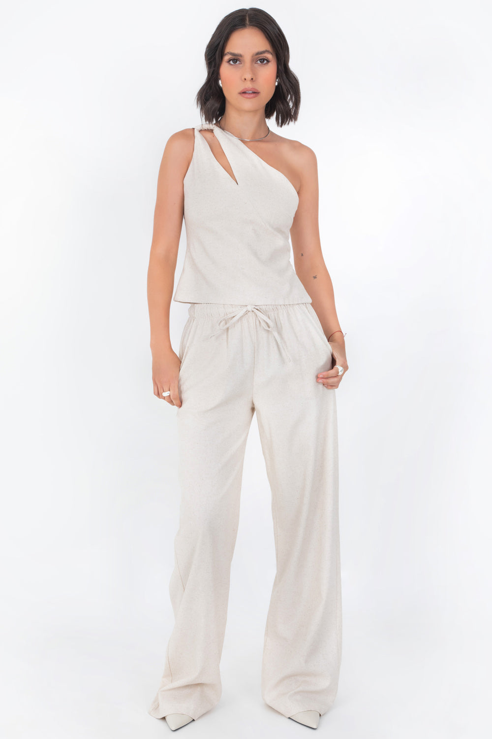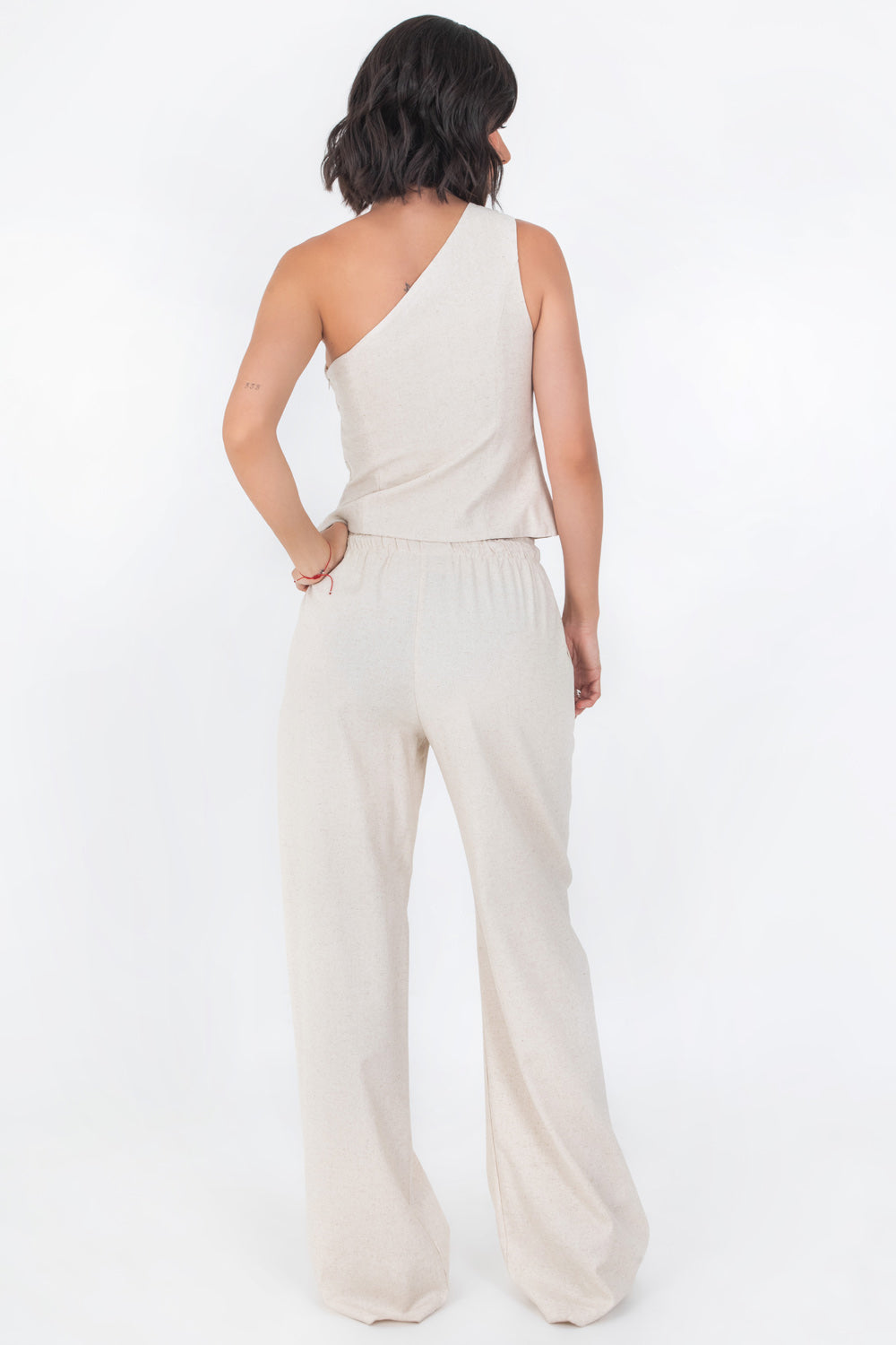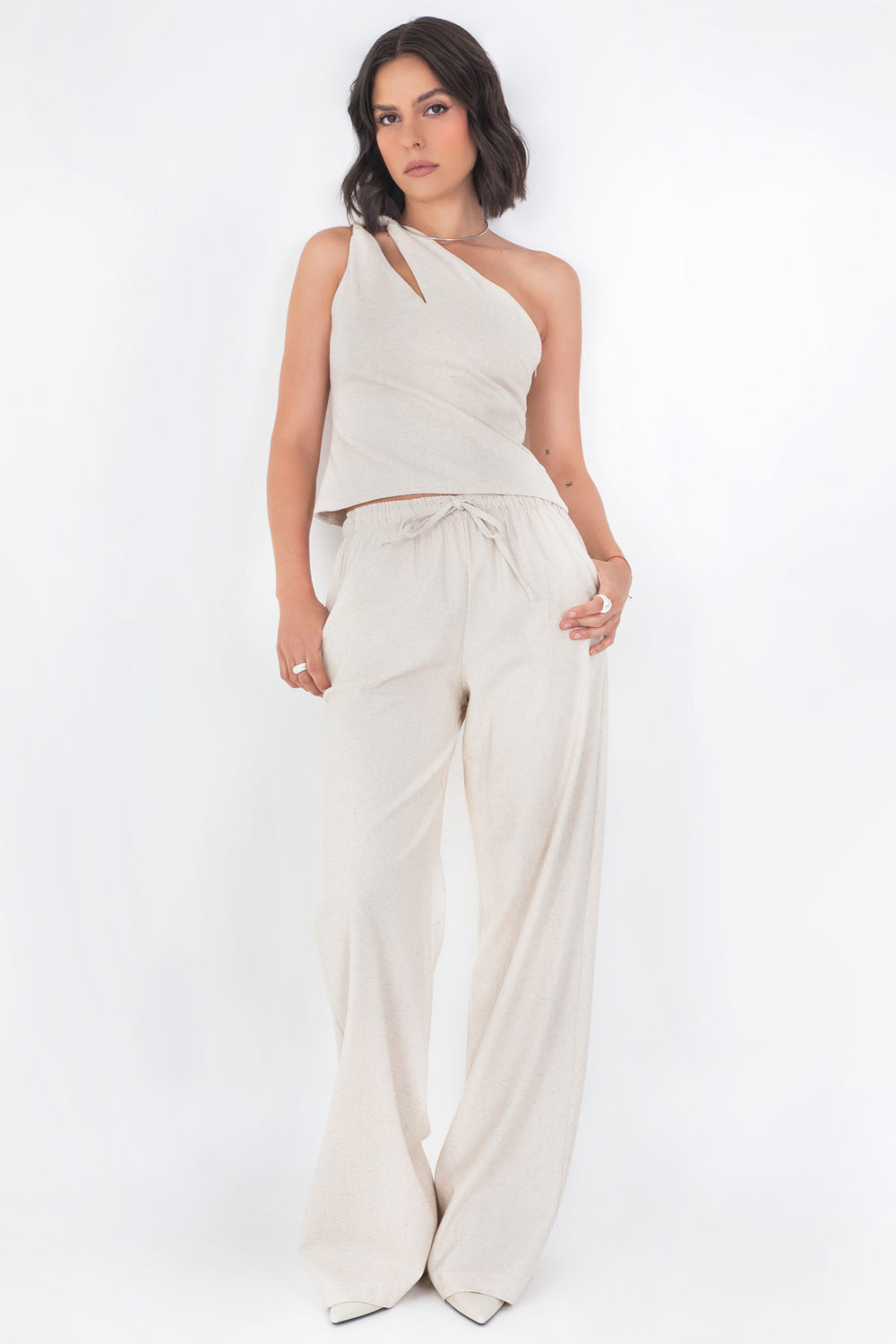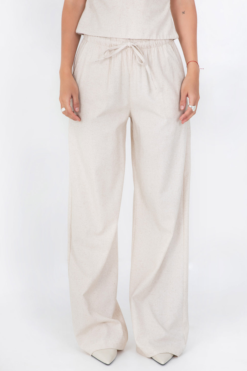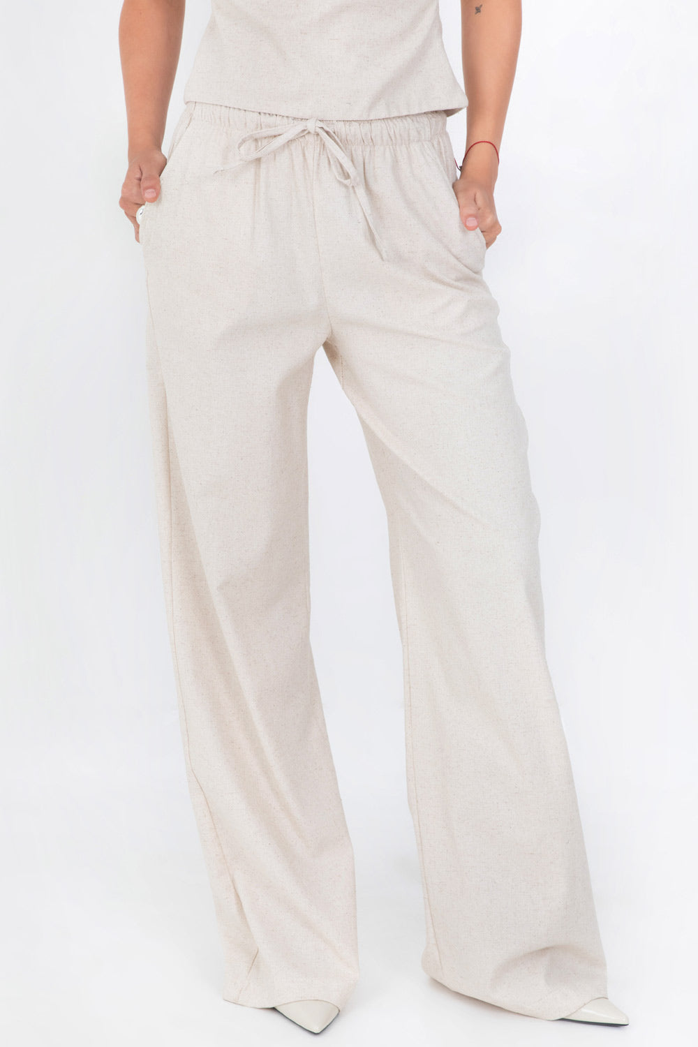 Pantalón de lino, fit wide leg, cintura alta elástica con jareta ajustable y bolsillos delanteros.