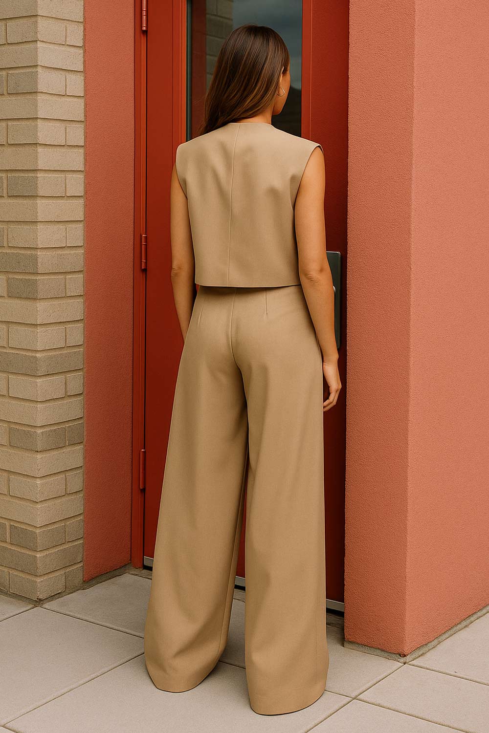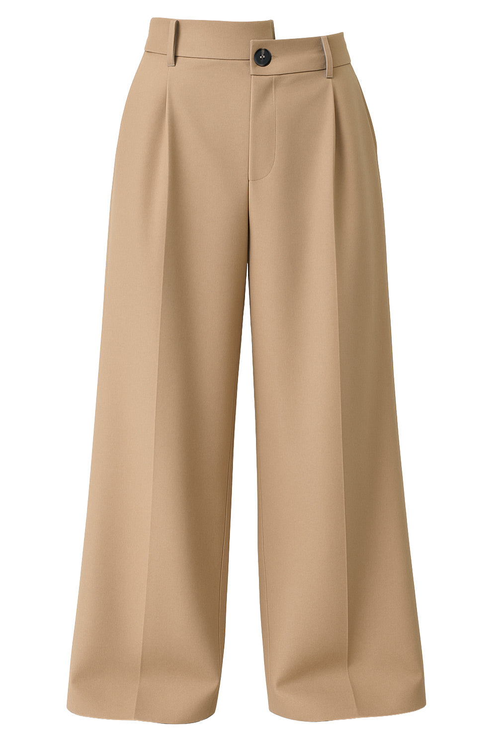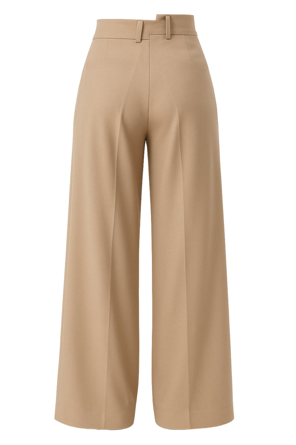 Pantalón de fit wide leg, cintura alta con pretina criss cross, trabillas, pinzas frontales con raya, bolsillos delanteros, cierre frontal con botón en contraste y cremallera oculta.