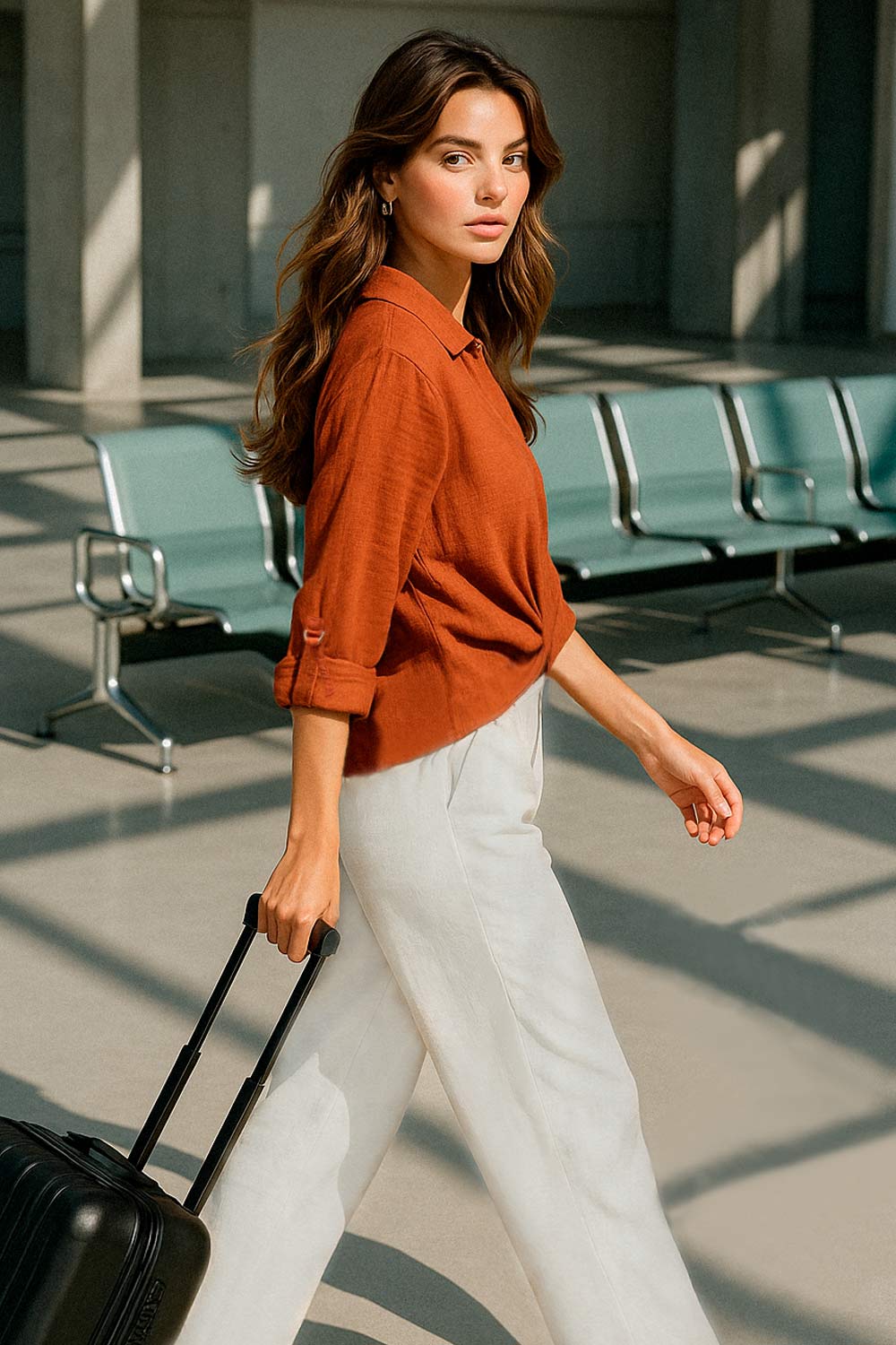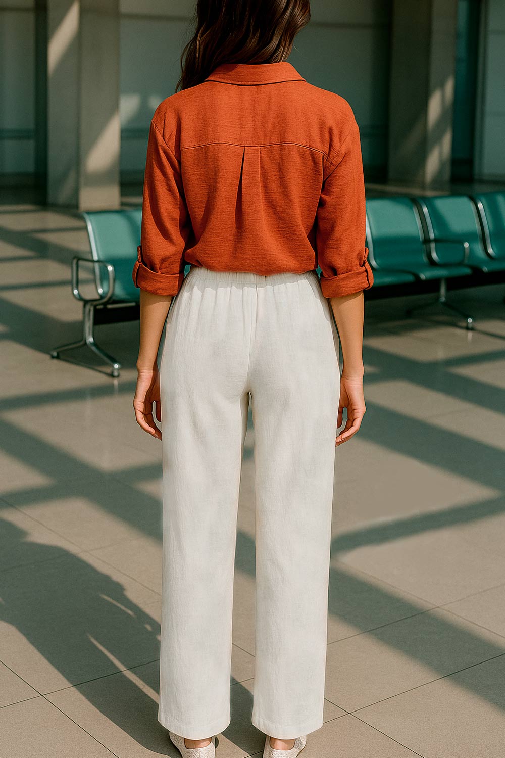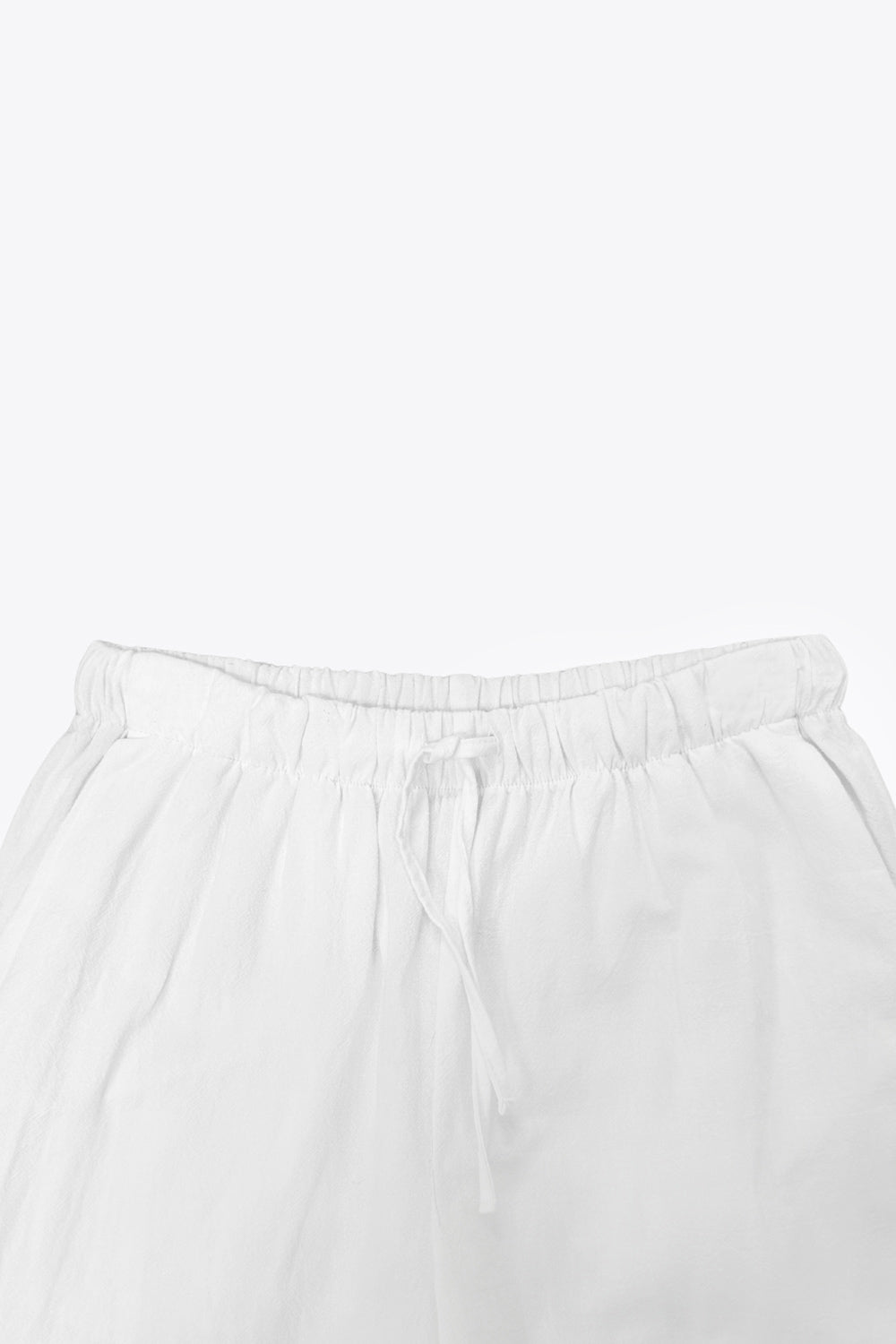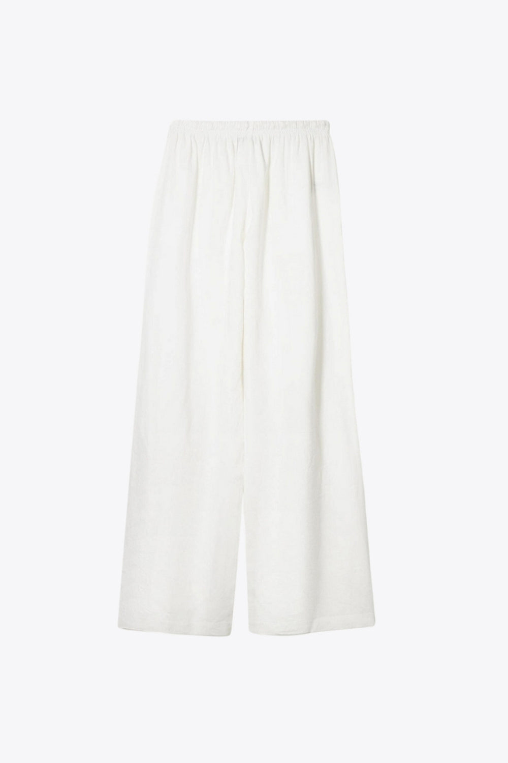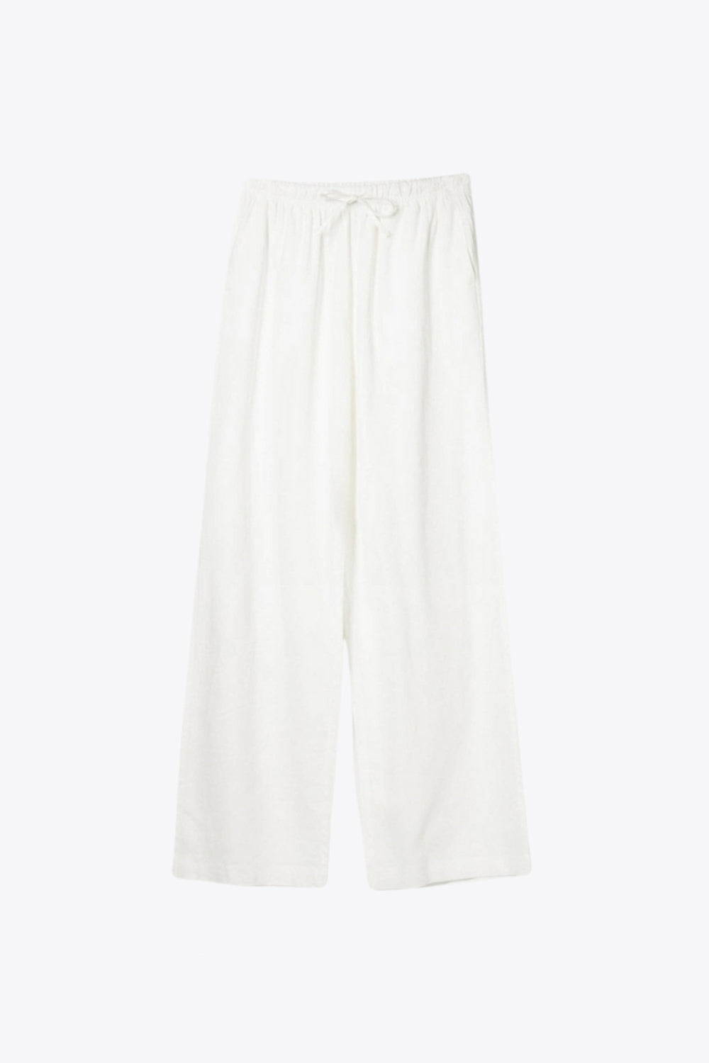 Pantalón palazzo de lino, confeccionado en tejido ligero y transpirable. Diseño de pierna ancha con cintura elástica y jareta ajustable.