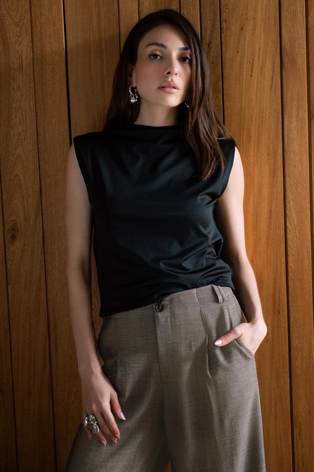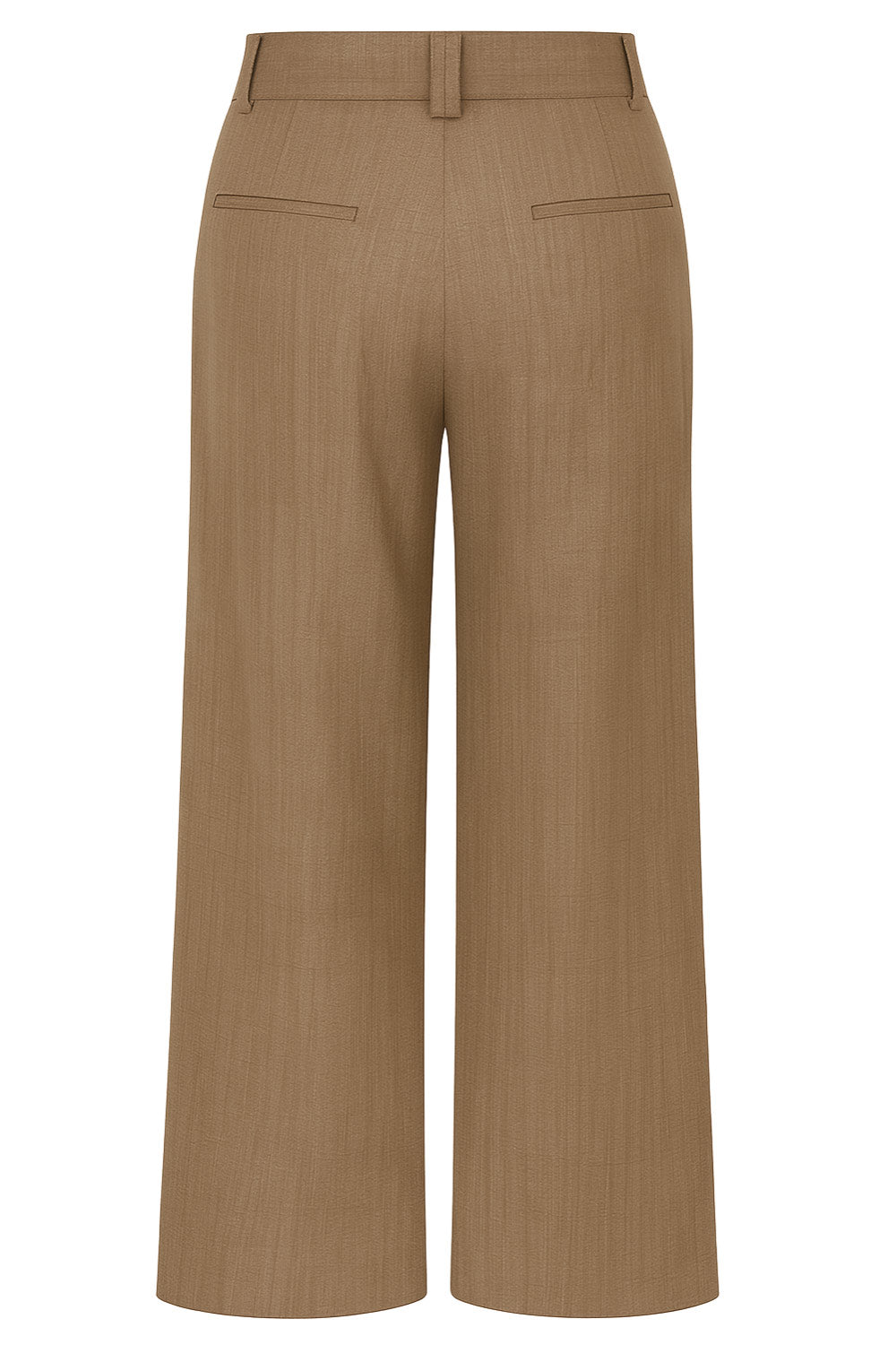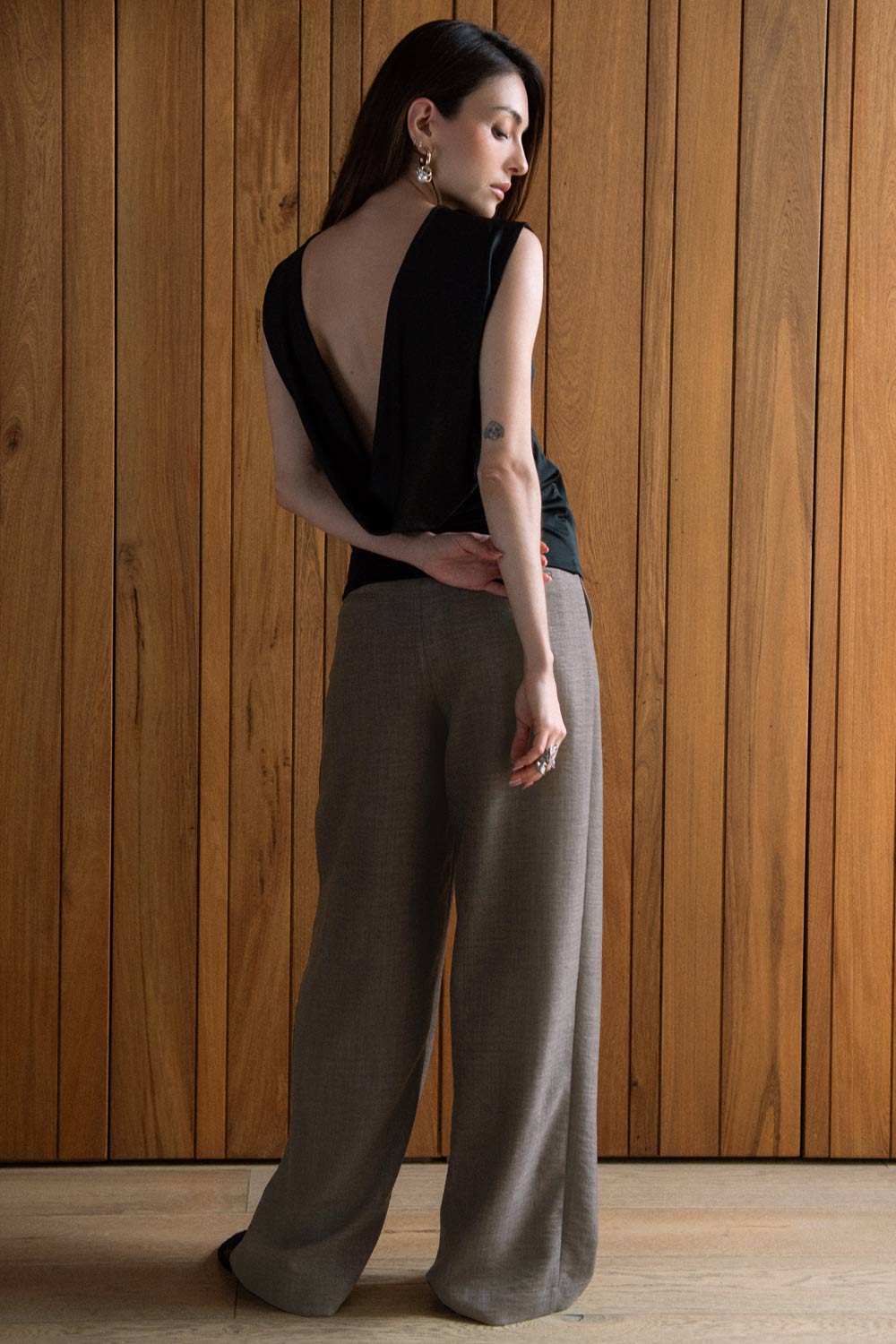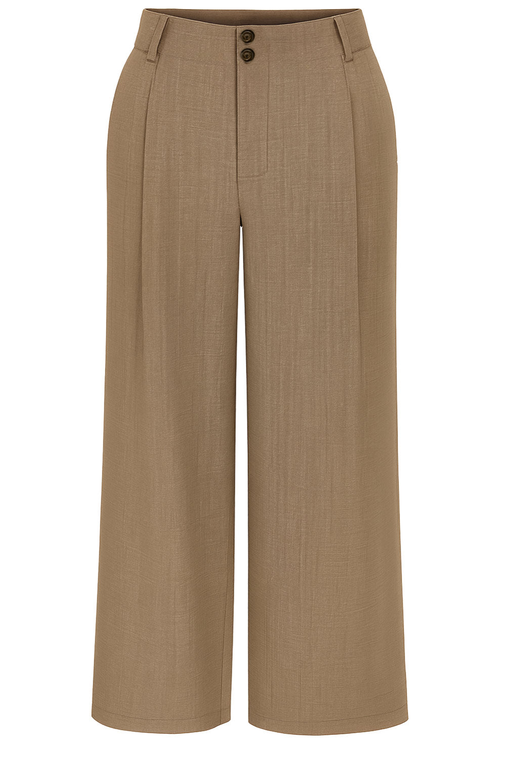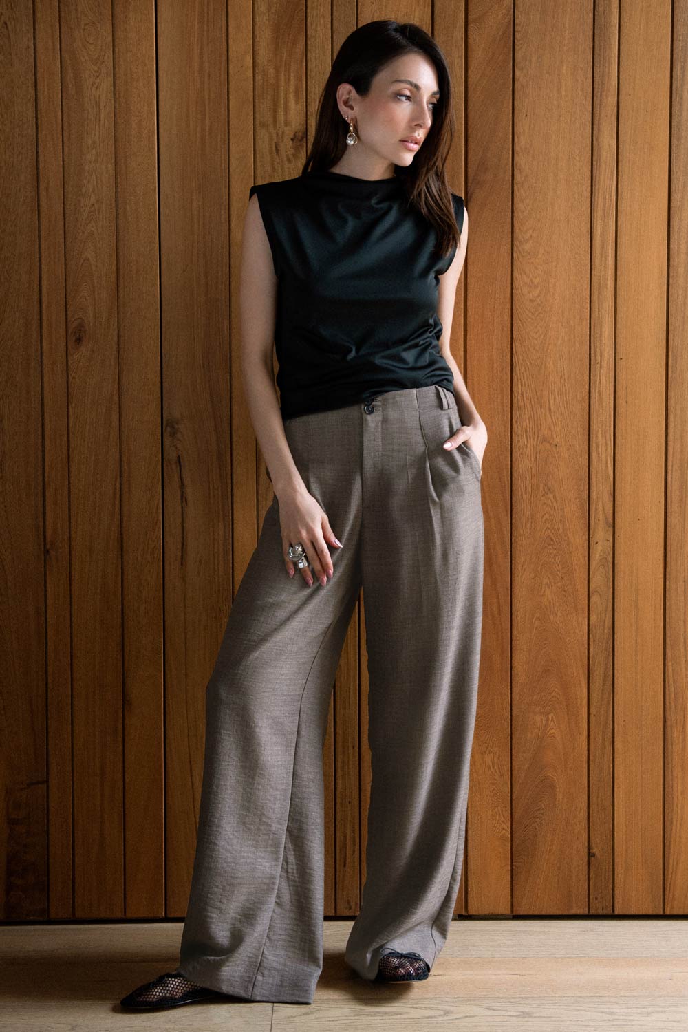 Pantalón fluido de cintura alta con trabillas, fit wide leg, pinzas frontales, bolsillos delanteros y vivos posteriores. Cierre frontal con botón y cremallera oculta.