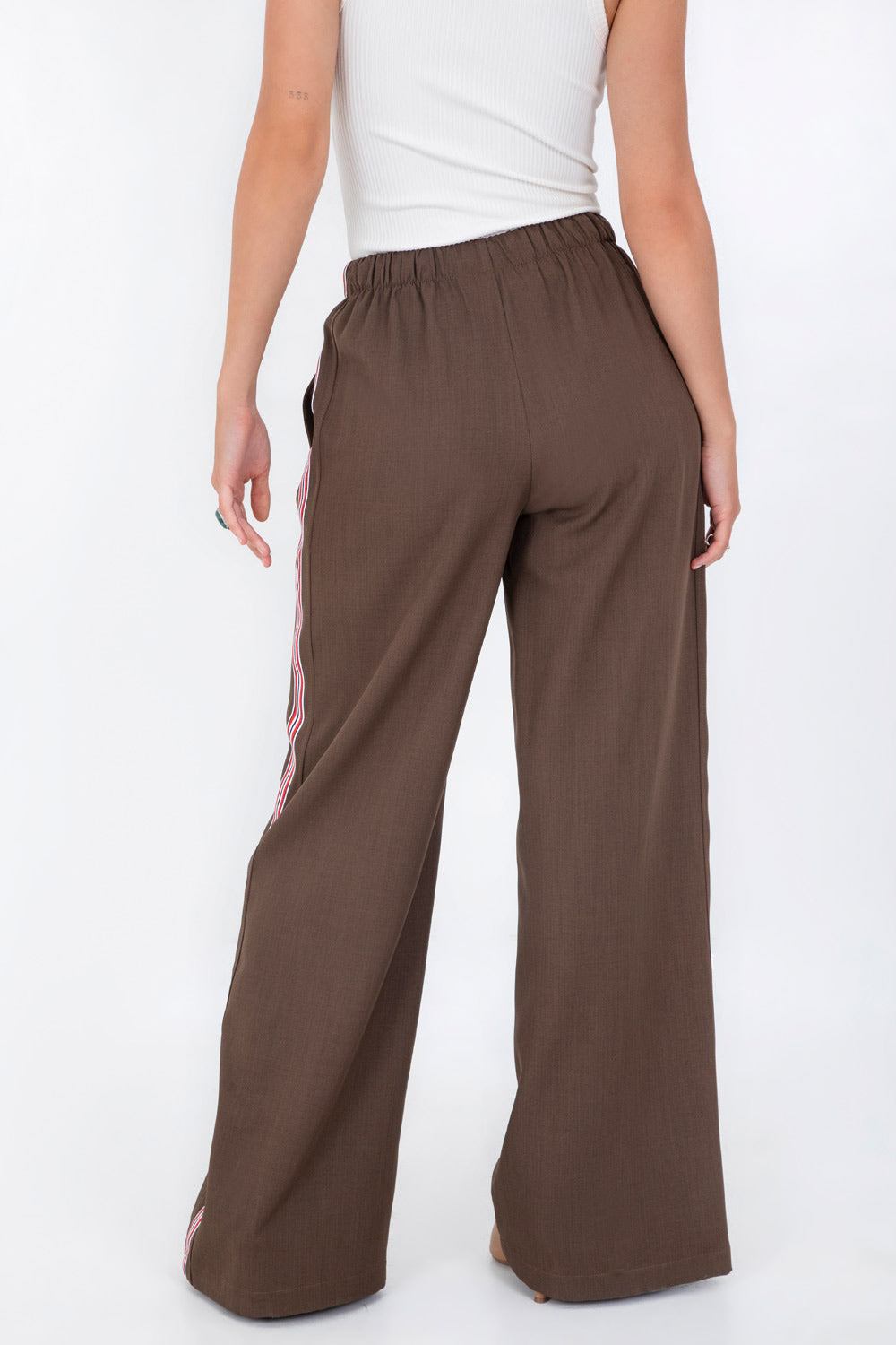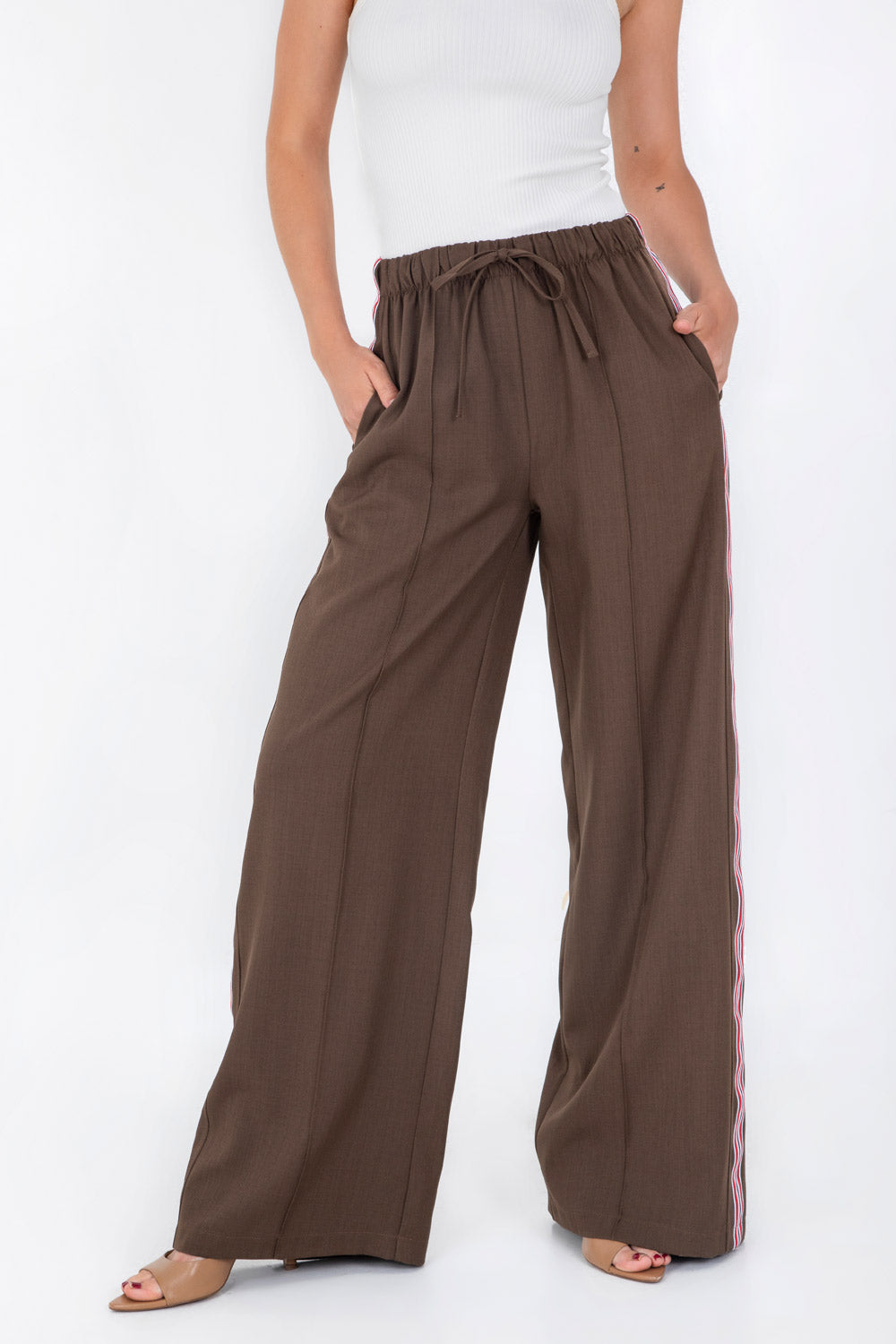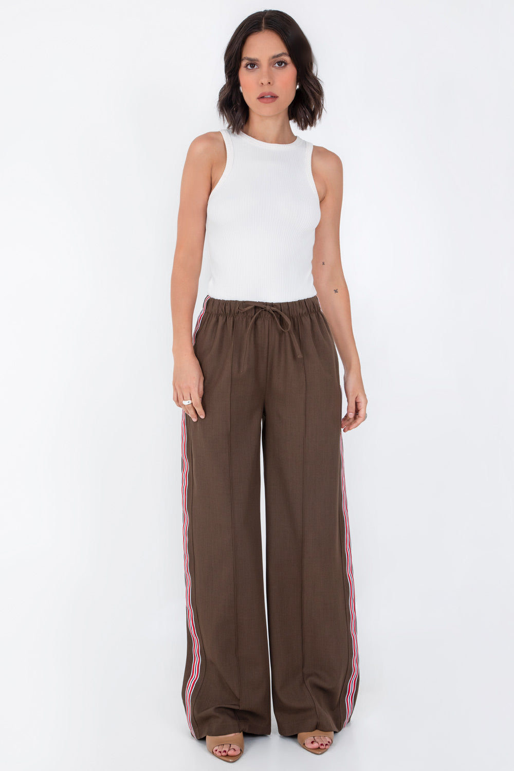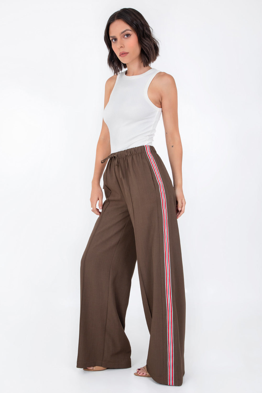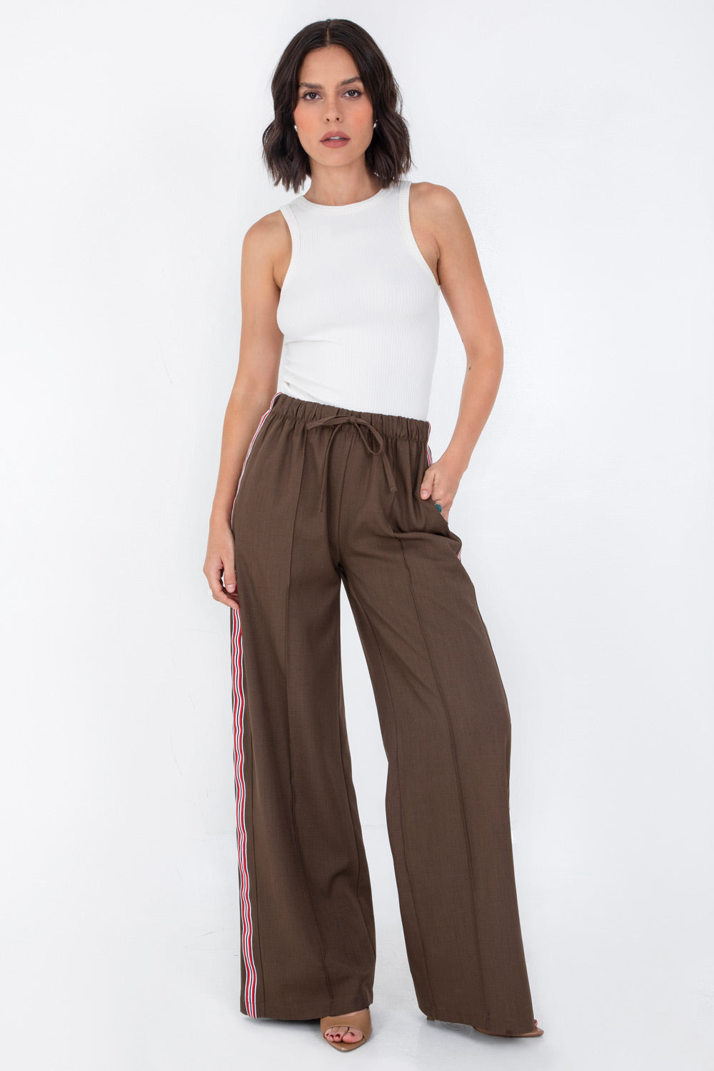Pantalón de fit wide leg, cintura alta con pretina elástica y jareta frontal ajustable, bolsillos delanteros, detalle de raya frontal y lateral en contraste.