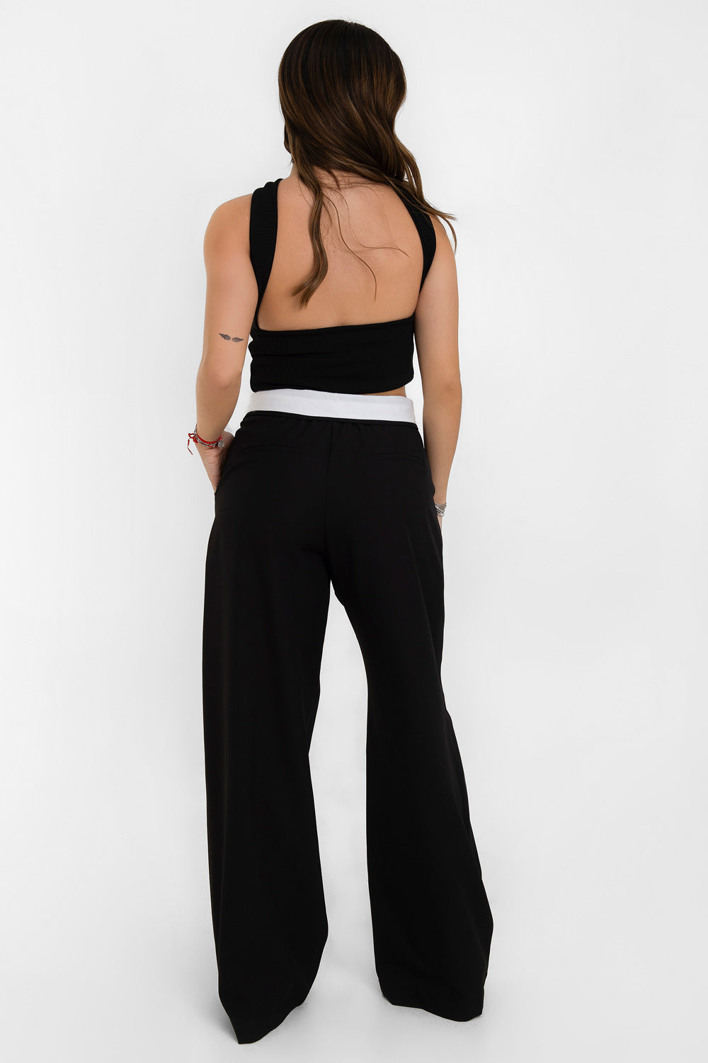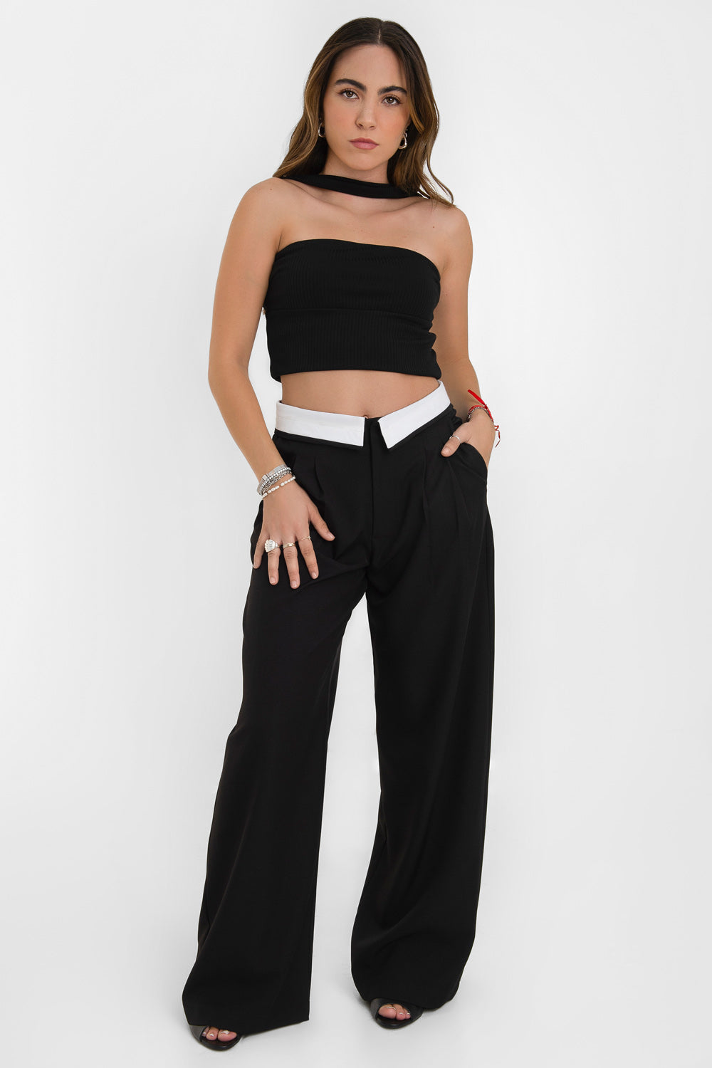 Pantalón de fit wide leg, pinzas frontales, cintura media, pretina con detalle de tailoring en contraste, bolsillos delanteros y vivos decorativos posteriores. Cierre frontal con broche y cremallera ocultos.