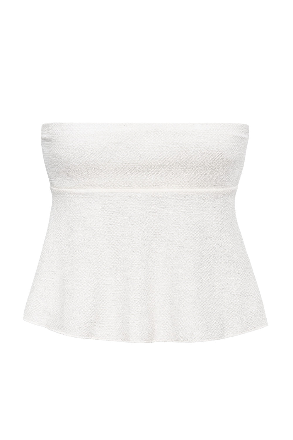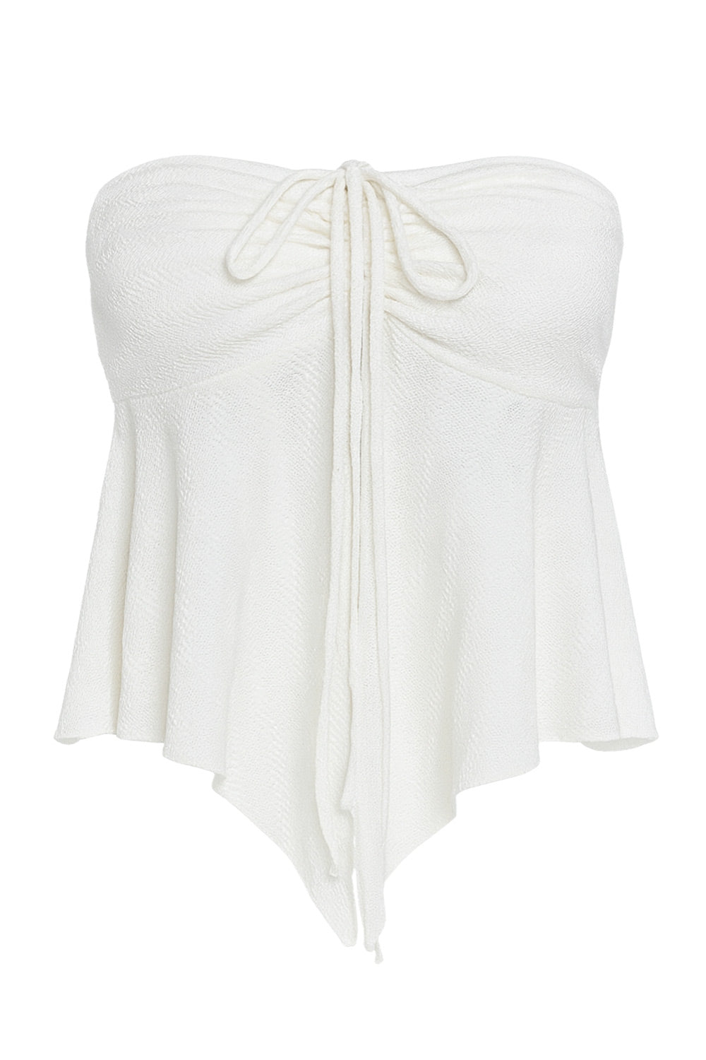 Top corto halter con lazo amarrable posterior, escote corazón con jareta ajustable y plisados frontales. Detalle de olanes y bajo asimétrico frontal con abertura.