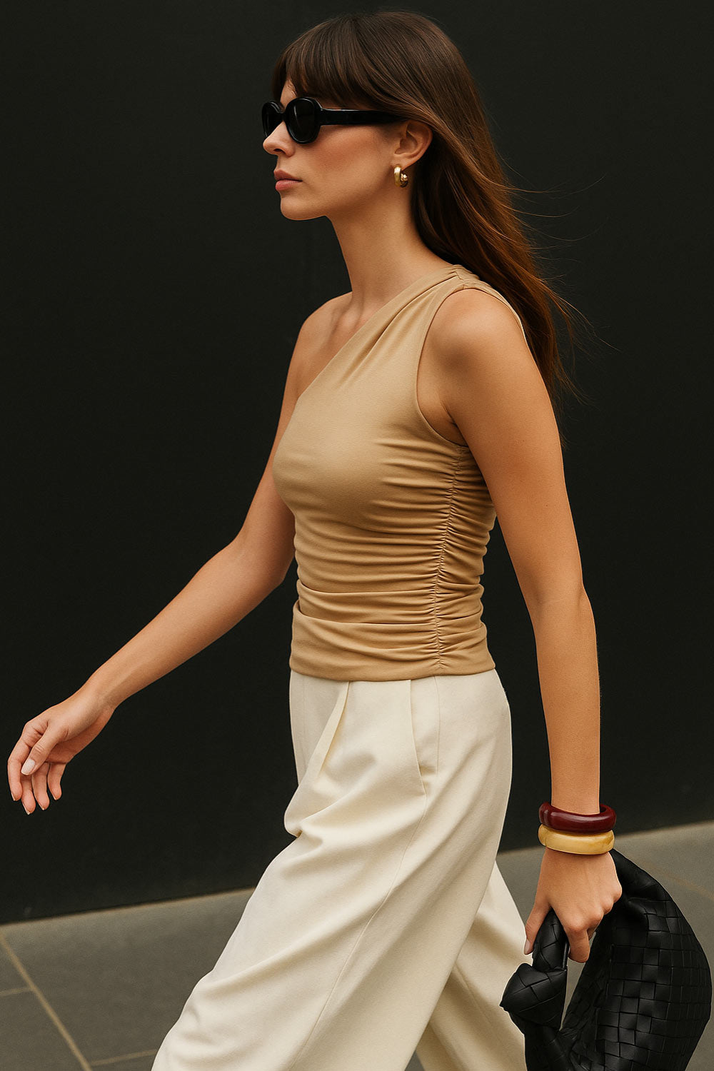 Top asimétrico de fit ajustado, un hombro con plisados, escote diagonal y plisados decorativos laterales.