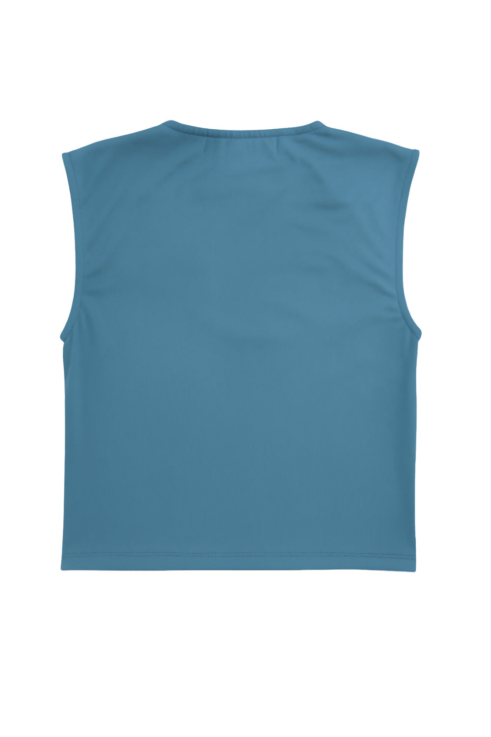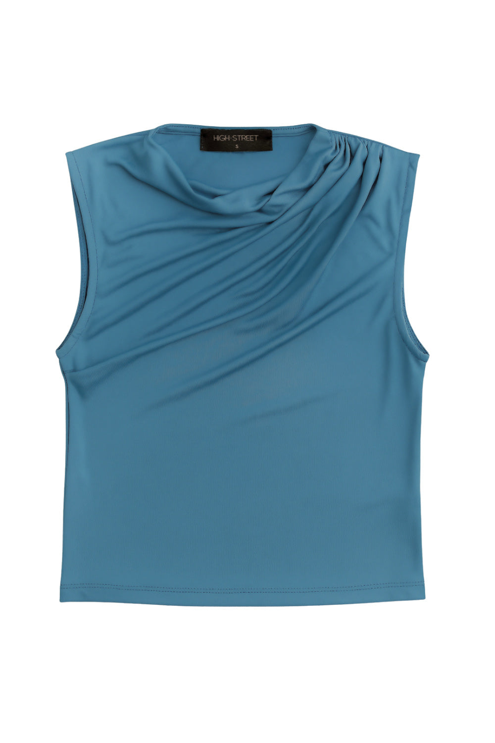 Top de fit ajustado, sin mangas, cuello fluido y plisados decorativos en hombros.