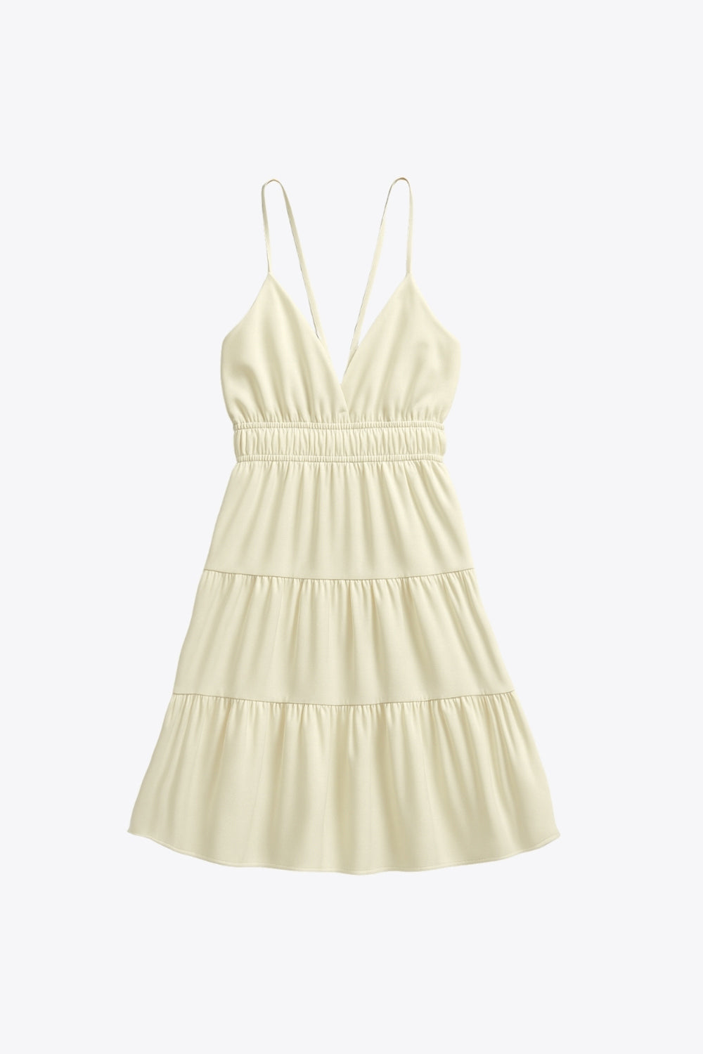 Vestido corto de escote v, corte en a con capas de olanes en bajo, rib elástico en cintura, tirantes delgados con lazado ajustable posterior y escote en espalda.