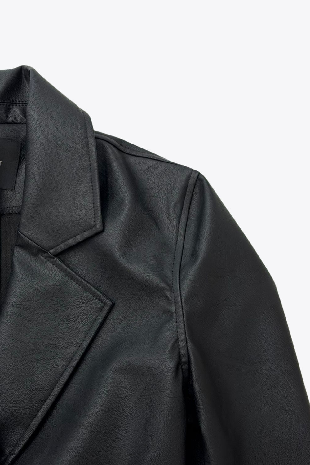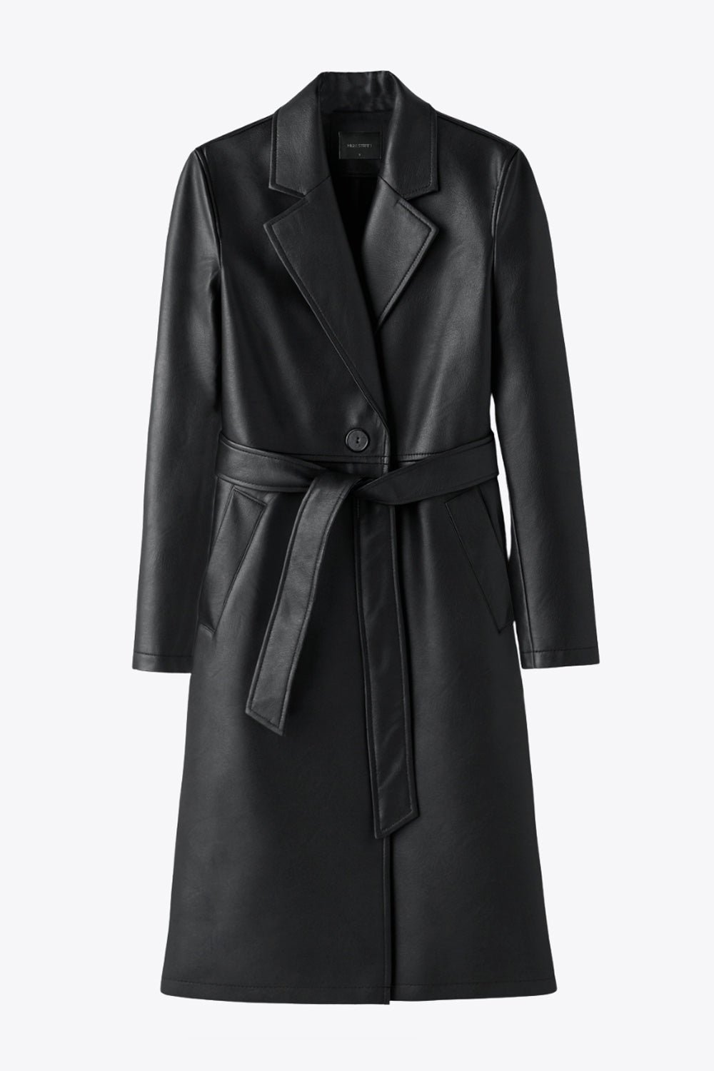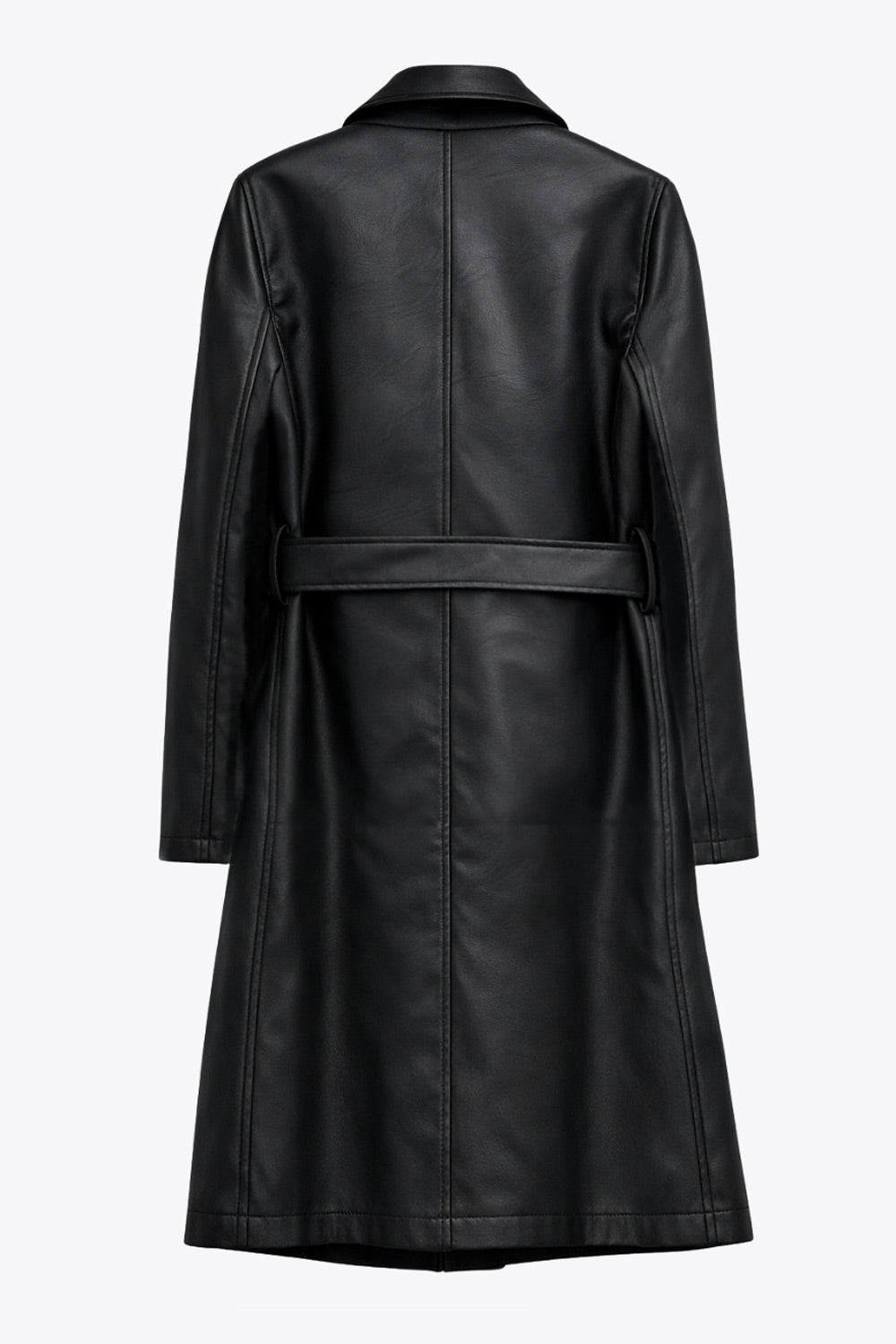 Abrigo largo de efecto piel, fit recto, manga larga, cortes decorativos posteriores, trabillas y cinturón amarrable del mismo tejido. Cierre frontal con cruce de botón en contraste.