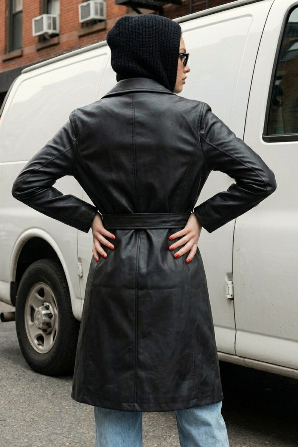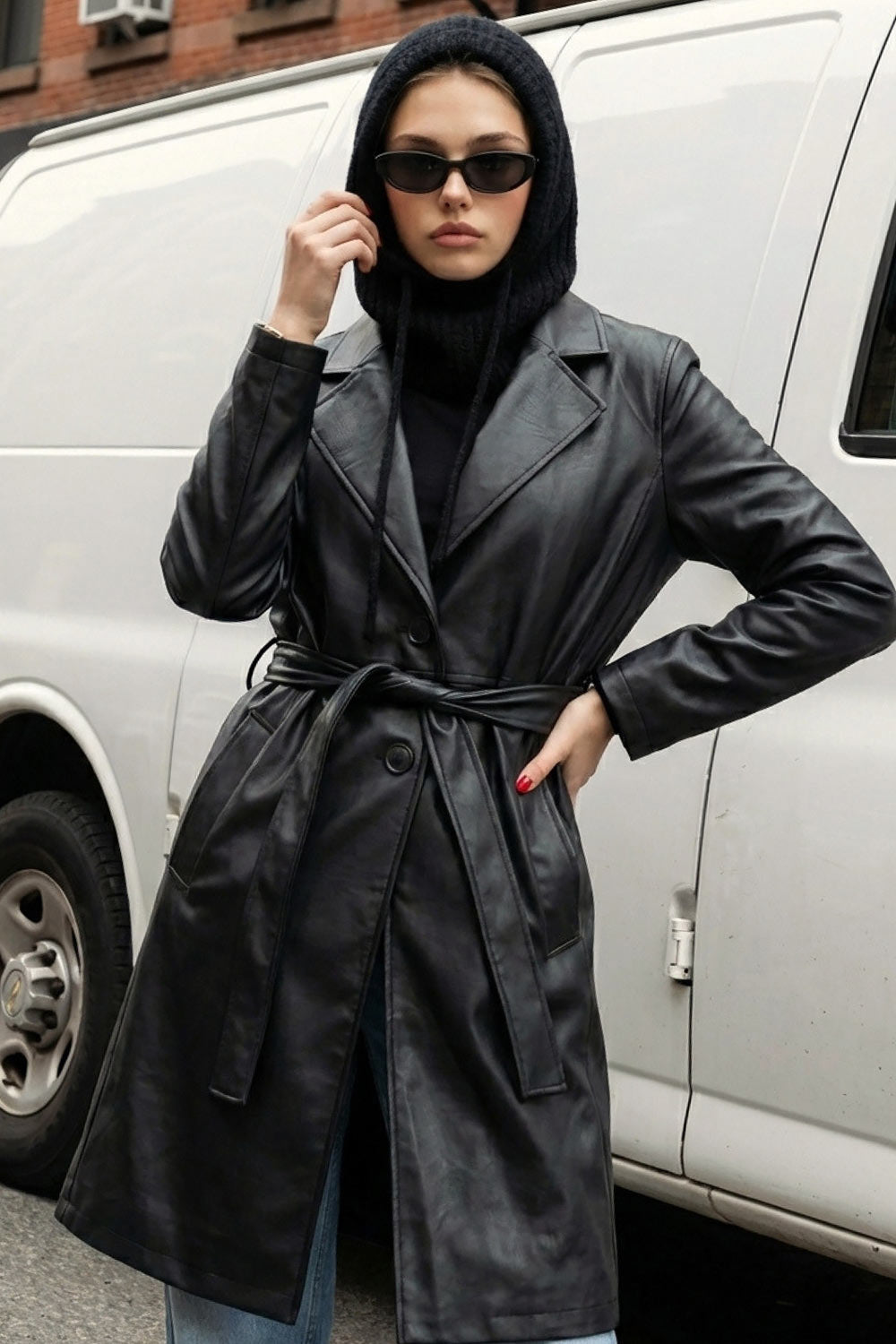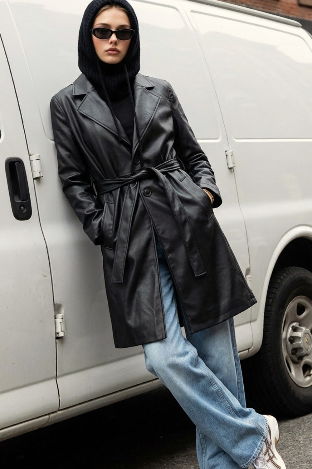 Abrigo largo de efecto piel, fit recto, manga larga, cortes decorativos posteriores, trabillas y cinturón amarrable del mismo tejido. Cierre frontal con cruce de botón en contraste.