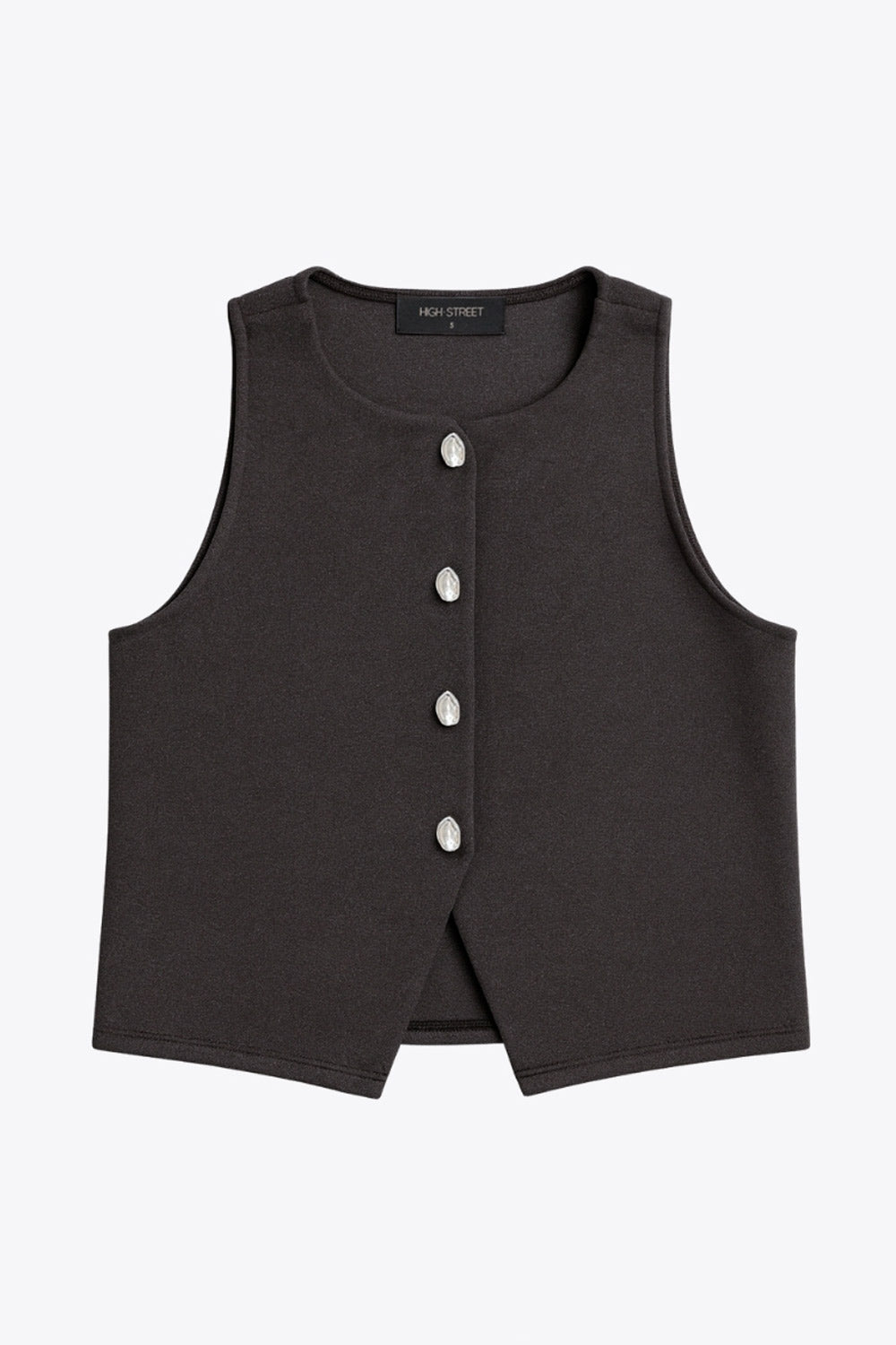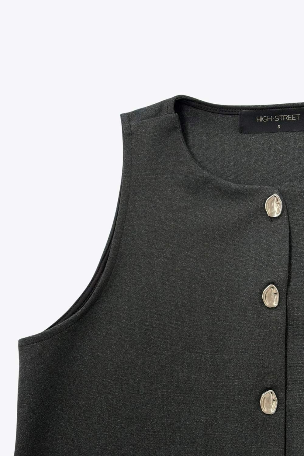 Chaleco corto de fit recto, cuello redondo y cierre frontal con hilera de botones en contraste. Detalle de abertura frontal en bajo.