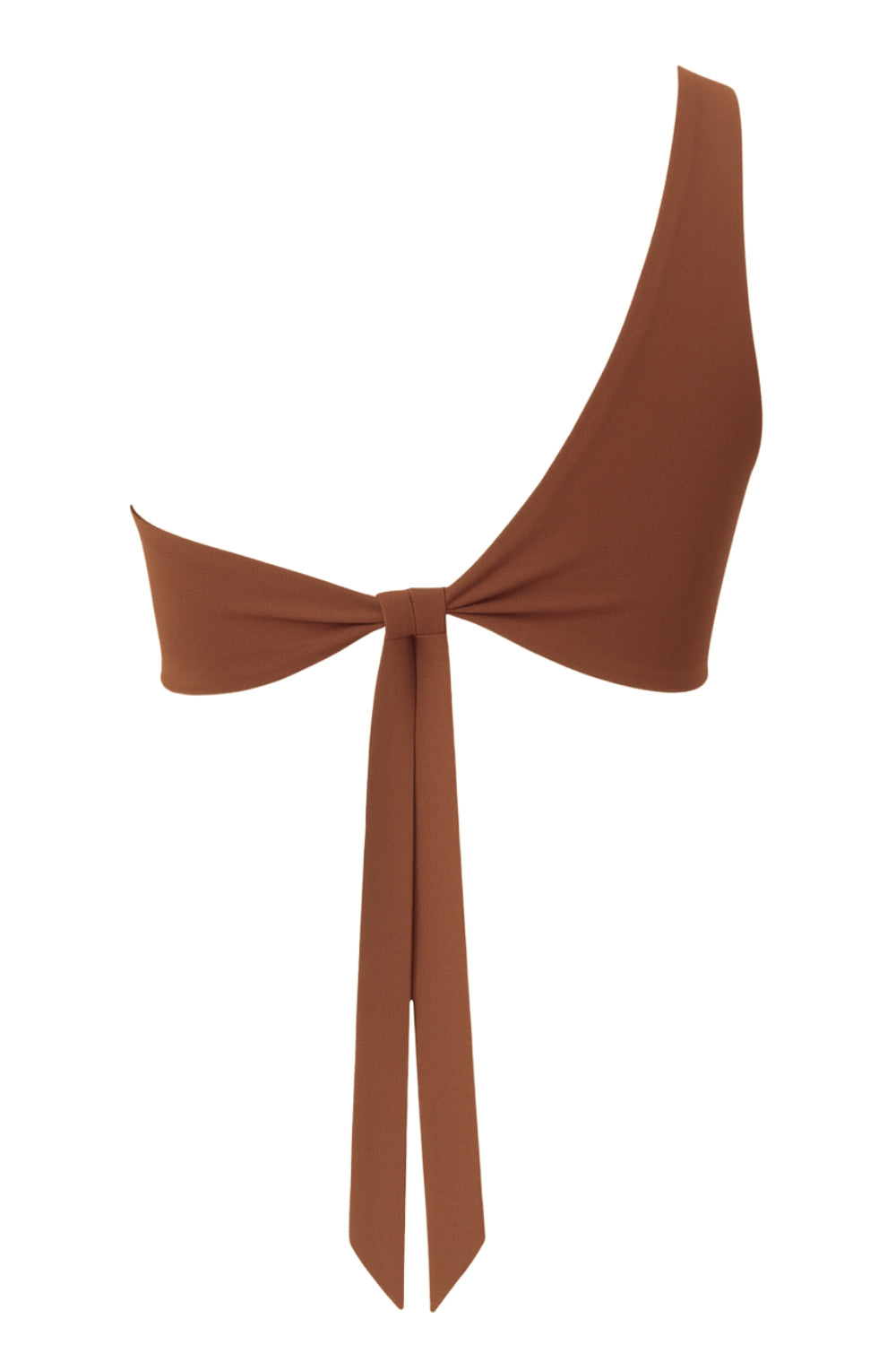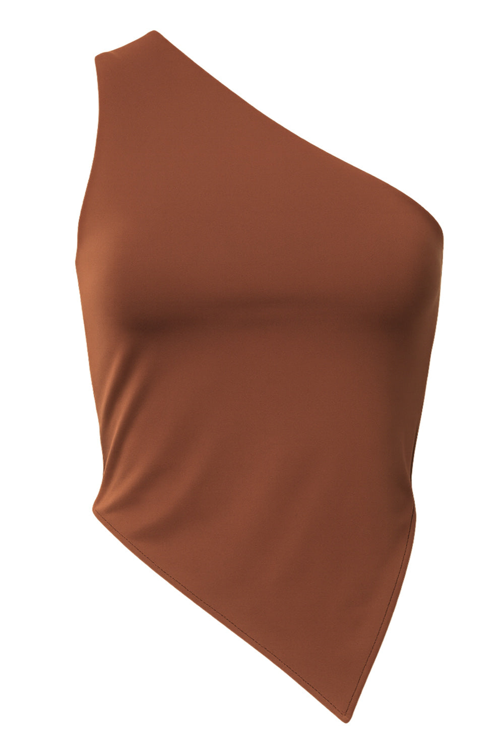 Crop top asimétrico de un hombro, sin mangas, fit ajustado, escote diagonal, escote en espalda, bajo frontal asimétrico y cierre posterior con nudo amarrable.