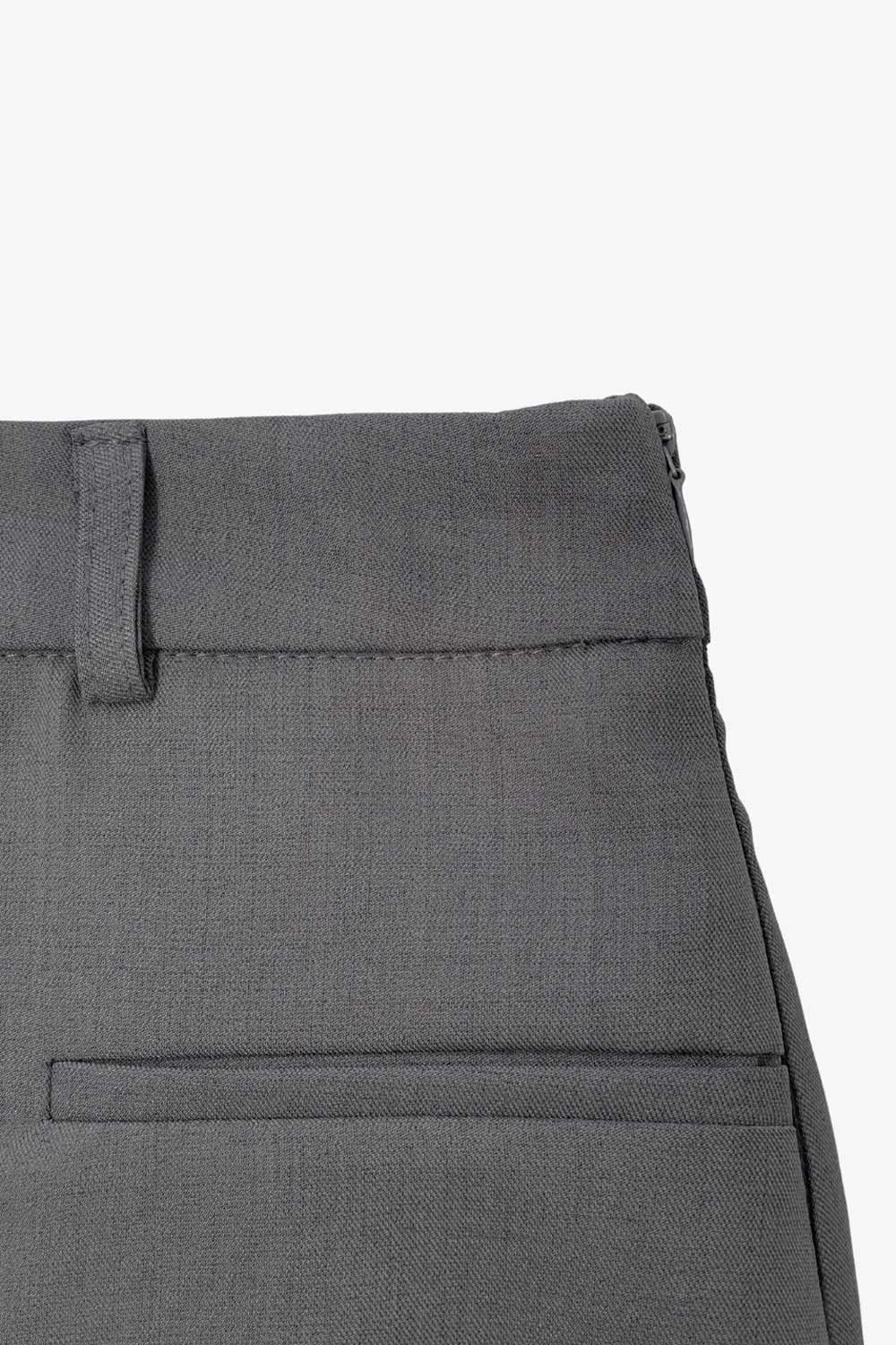Falda short corto de cintura alta con pretina y trabillas, corte en a, cruce frontal en diagonal y vivos decorativos frontales. Cierre lateral con cremallera oculta.