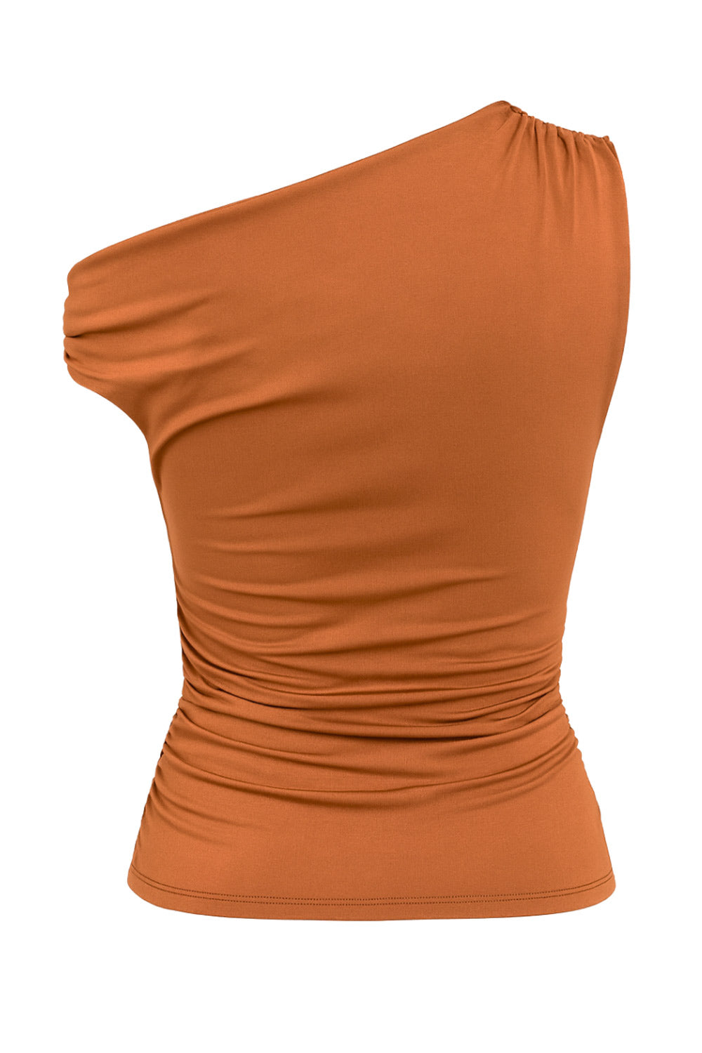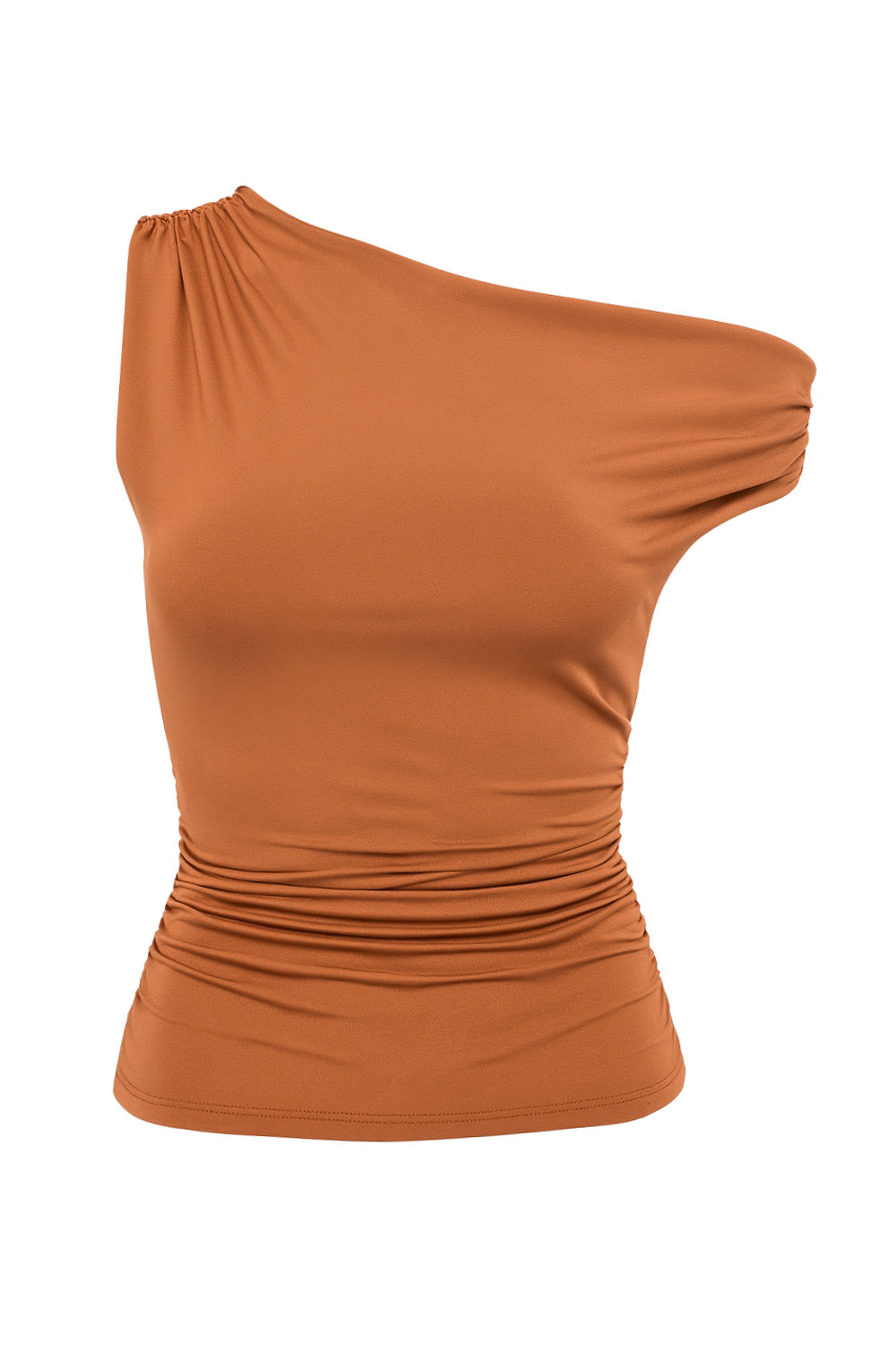 Top ajustado asimétrico de escote diagonal, una manga corta seguida con hombro descubierto, plisados en hombros y costados.