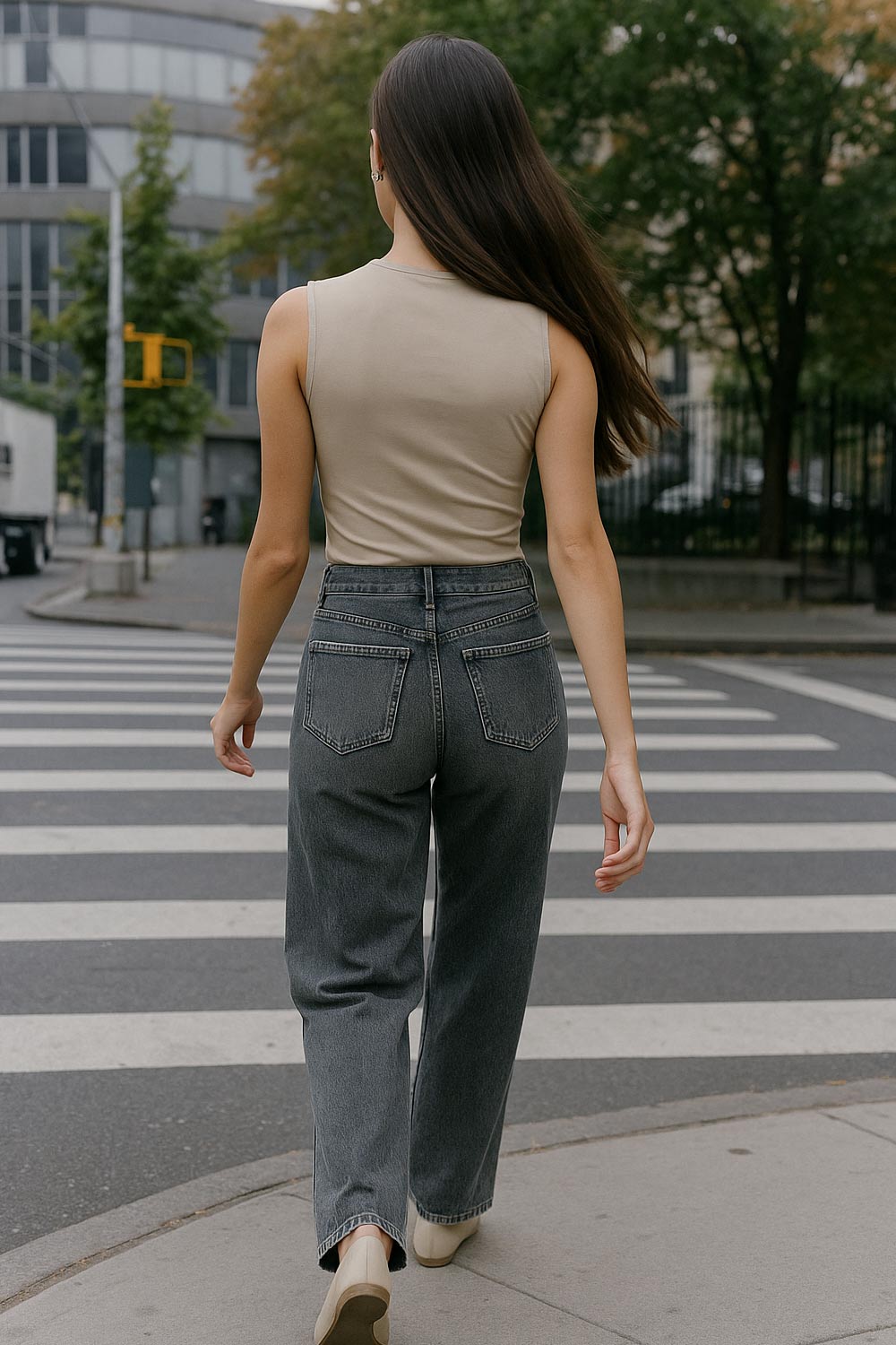Top de fit ajustado, sin mangas, cuello fluido y plisados decorativos en hombros.