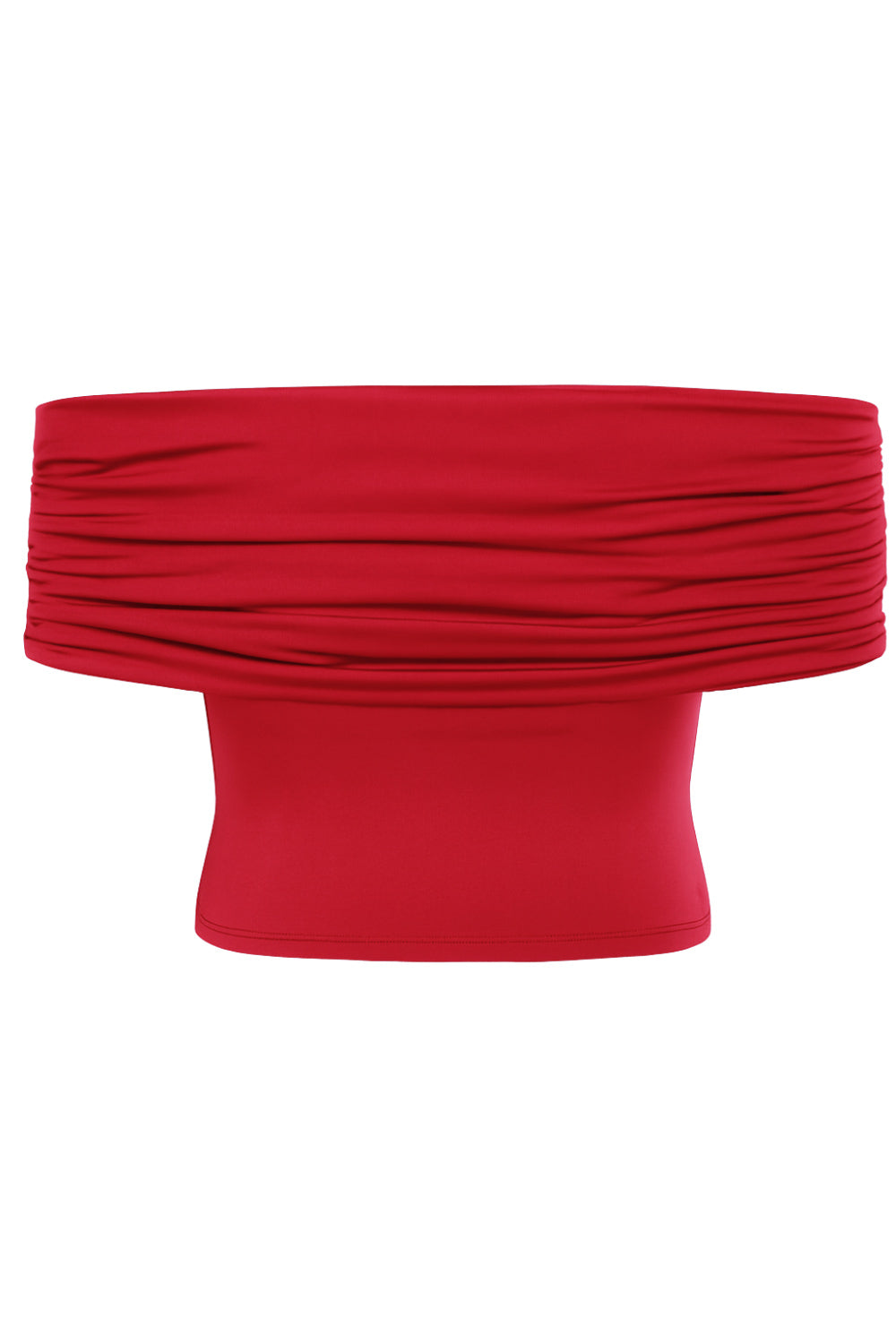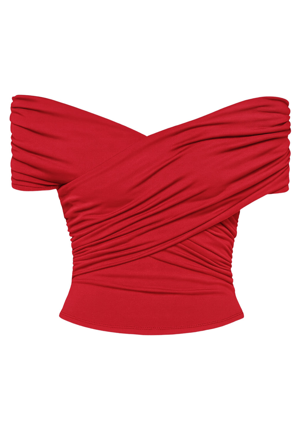 Top corto plisado de fit ajustado, escote v con cruce frontal, manga corta seguida, plisados en costados y hombros.