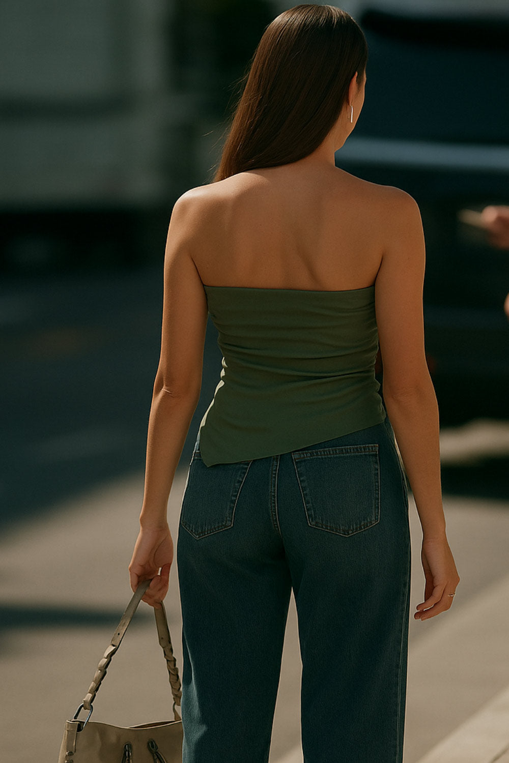 Top tubo de fit ajustado, escote recto con plisados decorativos laterales, bajo asimétrico frontal con rib rizado en borde, abertura y plisados con jareta frontal ajustable.