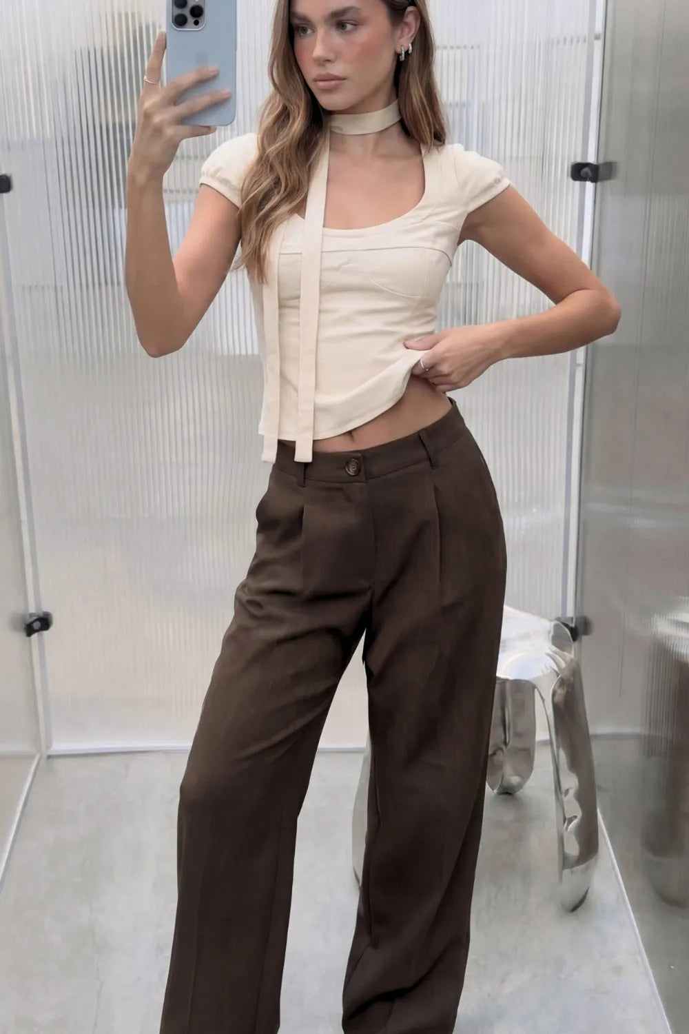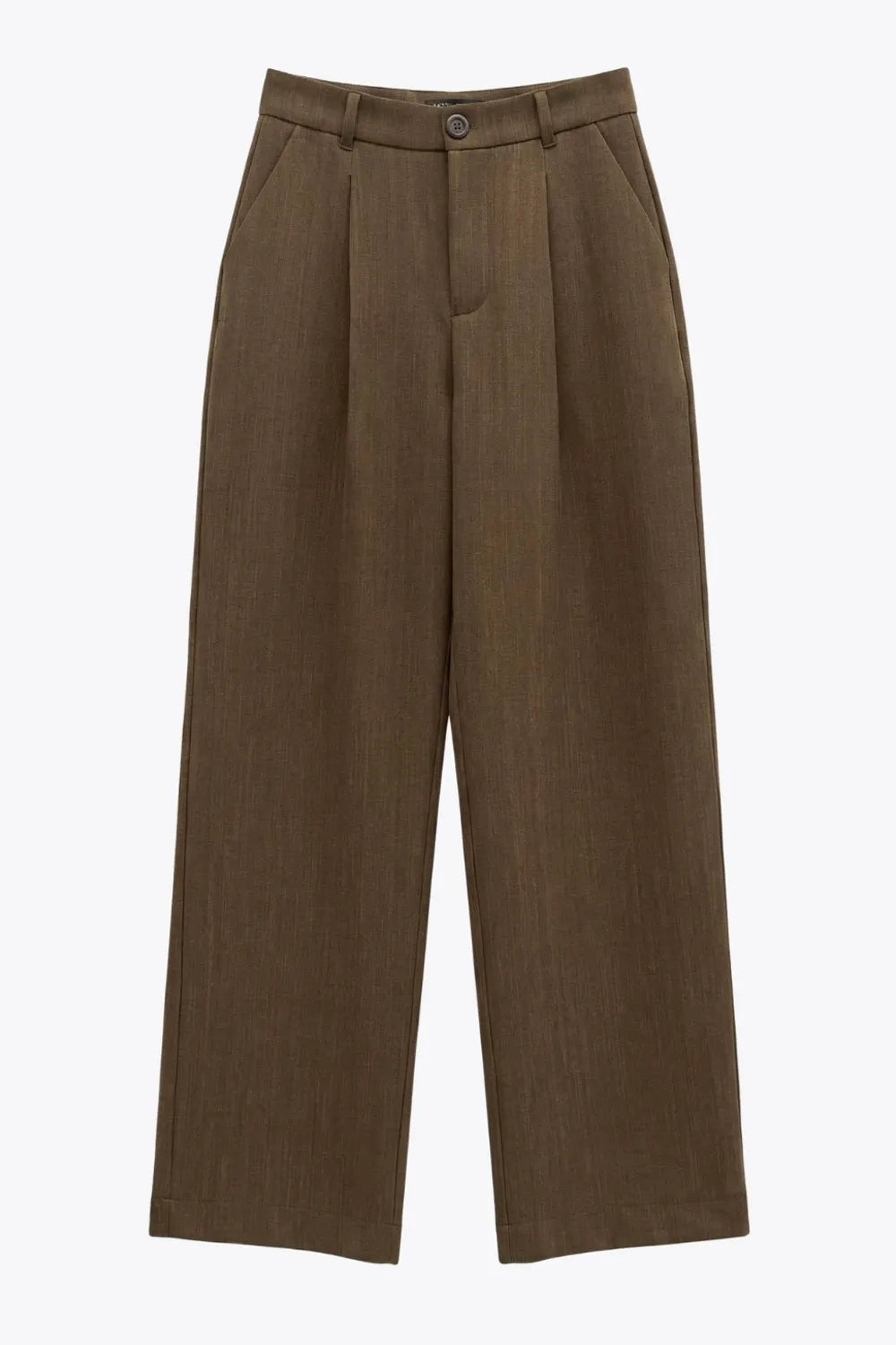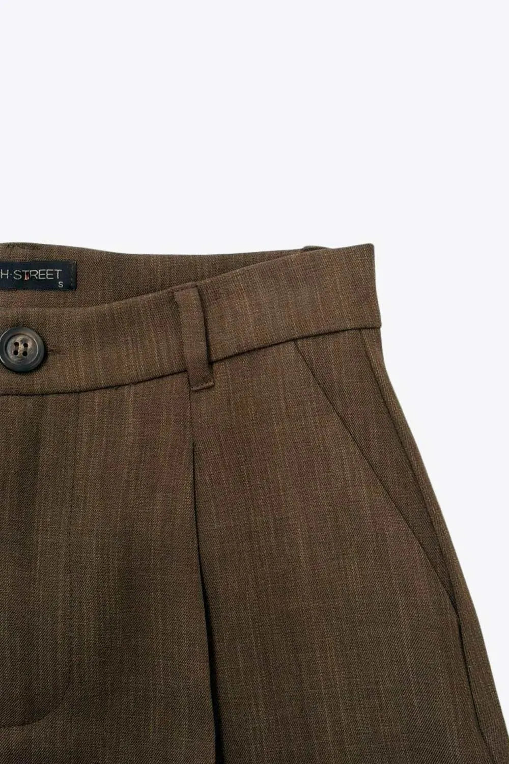 Pantalón de fit recto, cintura alta con pretina y trabillas, bolsillos delanteros y vivos decorativos posteriores, pinzas frontales. Cierre con botón y cremallera oculta.