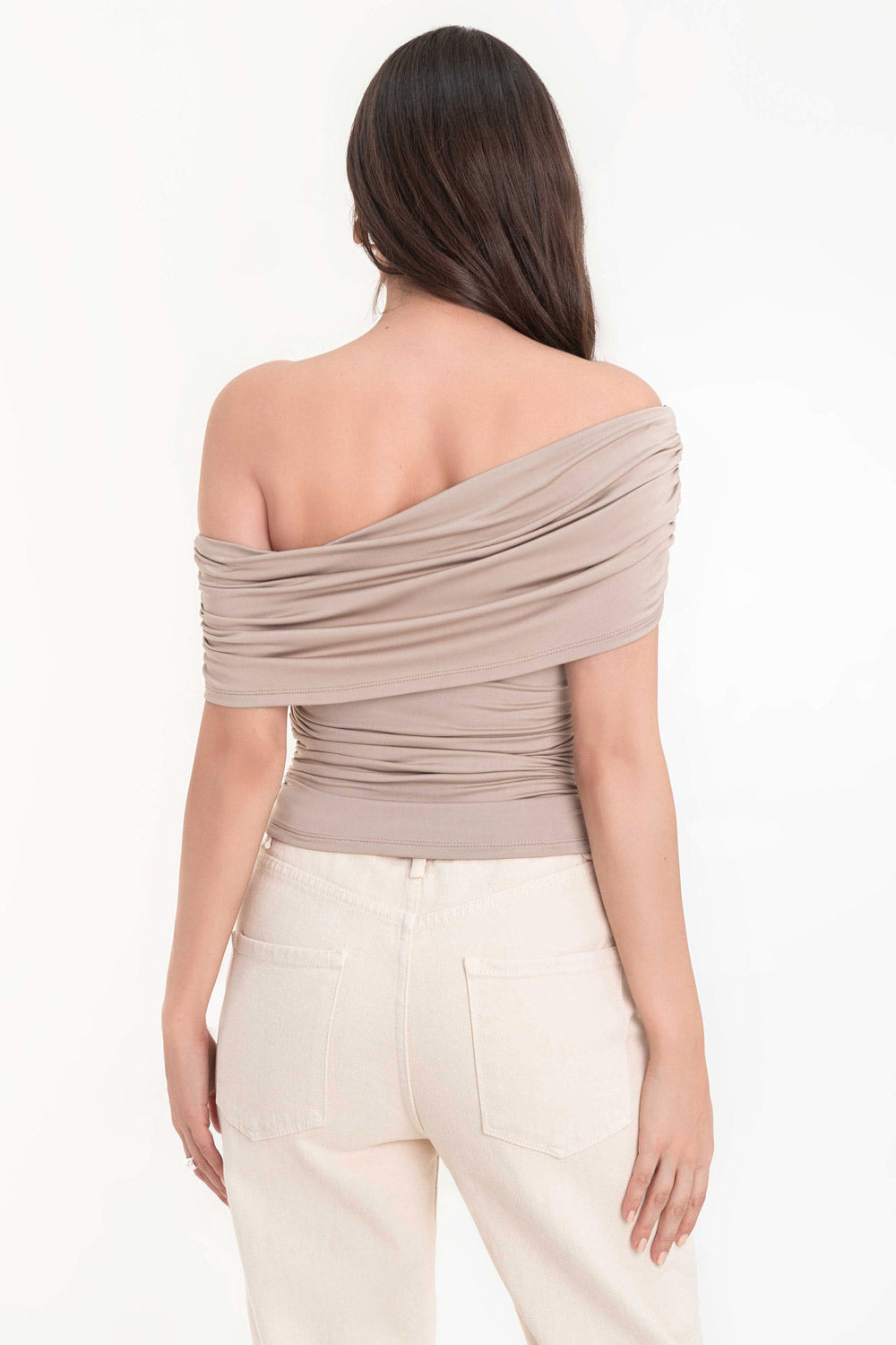 Top de fit ajustado, hombro descubierto, escote recto diagonal con doblez en borde, manga corta seguida, plisados en costados y hombros.