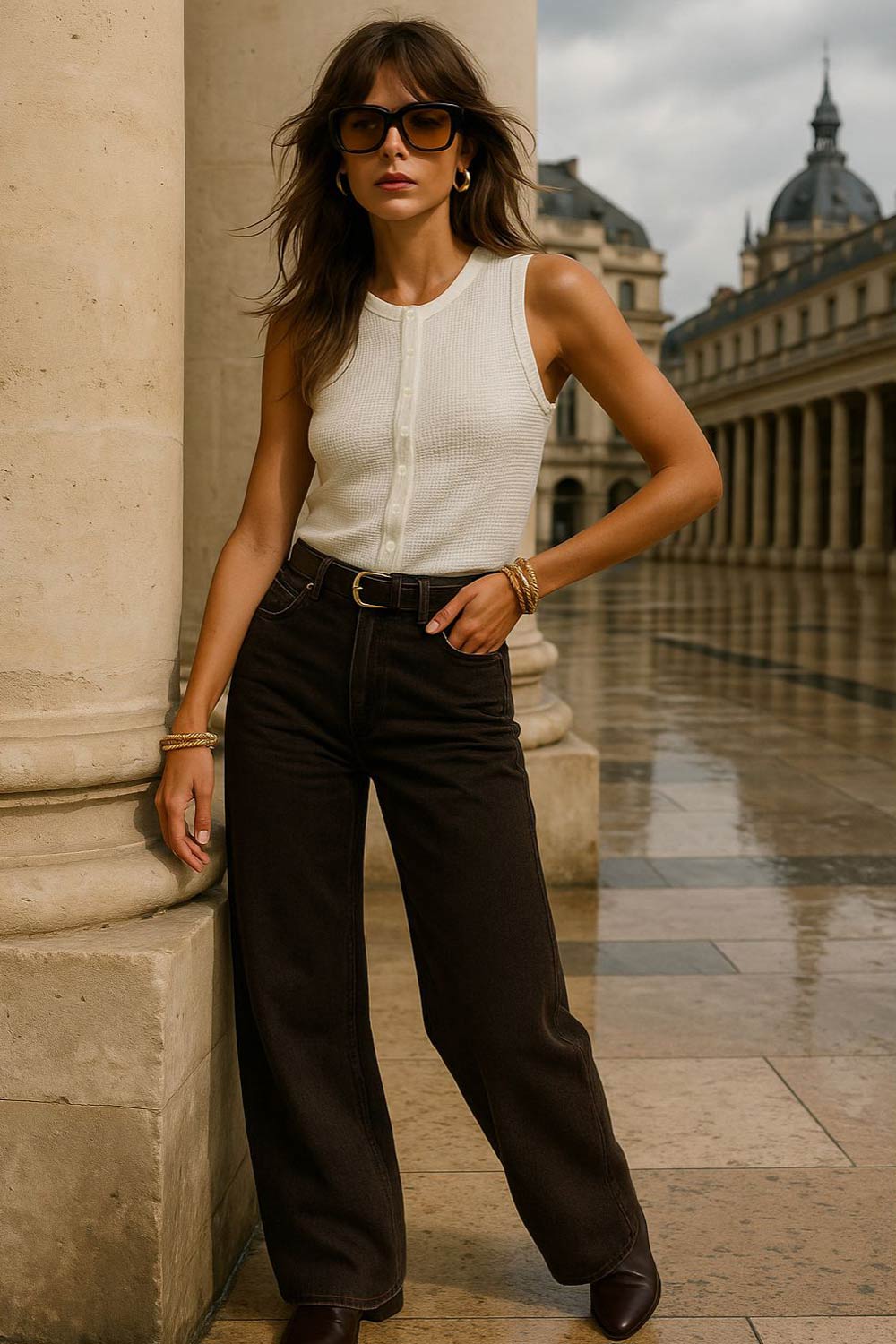 Top de punto, sin mangas, cuello redondo, bajo curveado frontal e hilera frontal de botones. Detalle de rib en bordes.