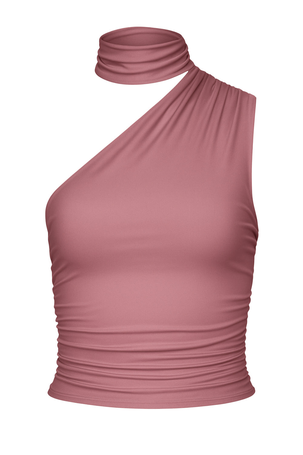 Top satinado asimétrico, de fit ajustado, detalles plisados laterales y en hombro, sin mangas, un hombro, escote diagonal y choker con plisados. Cierre posterior con botón y ojal.