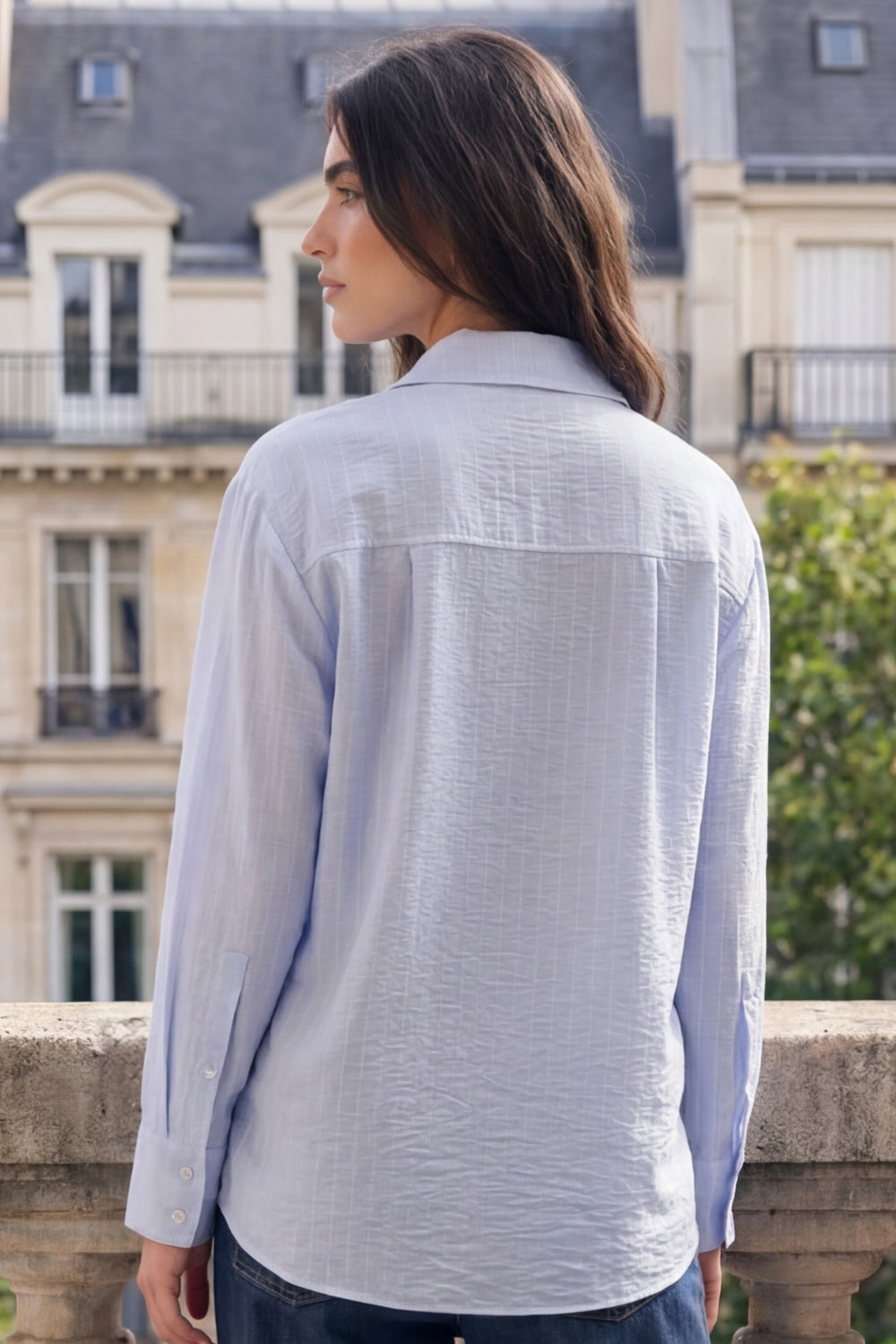 Camisa de fit oversized, estampado rayas, cuello camisero, manga larga con puño abotonado, pinza de amplitud en espalda, bolsillo frontal, bajo curveado y cierre frontal con hilera de botones. Detalle de corbata del mismo tejido.