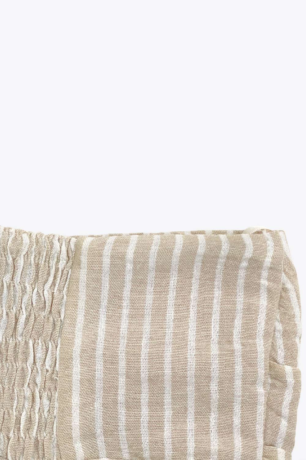 Top corto de estampado rayas, cuello halter con lazo amarrable posterior, escote corazón con jareta ajustable y plisados frontales. Detalle de peplum con olanes y fruncido en espalda.