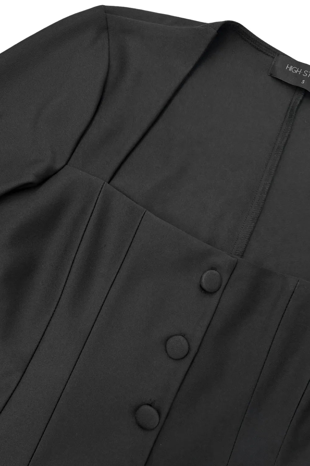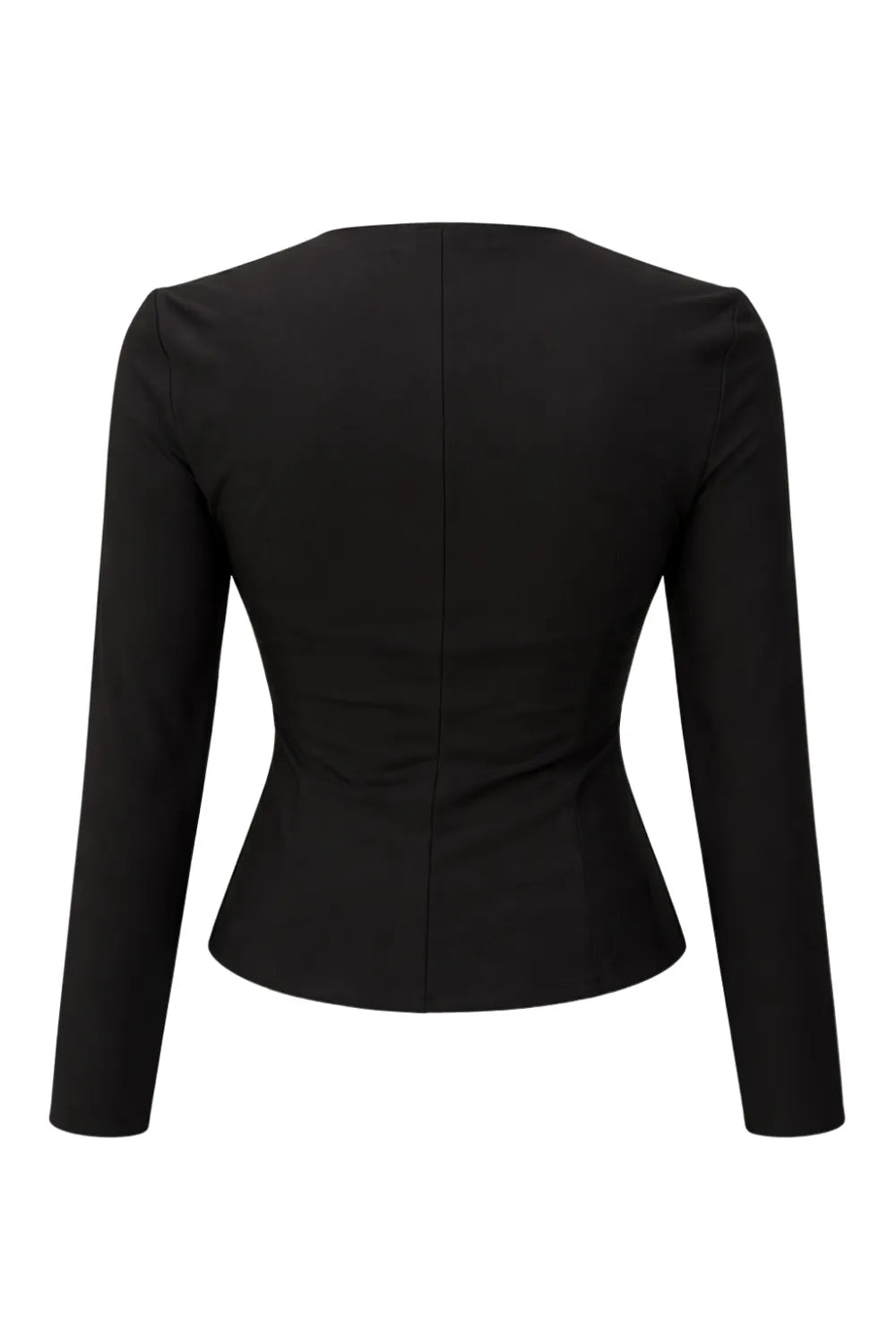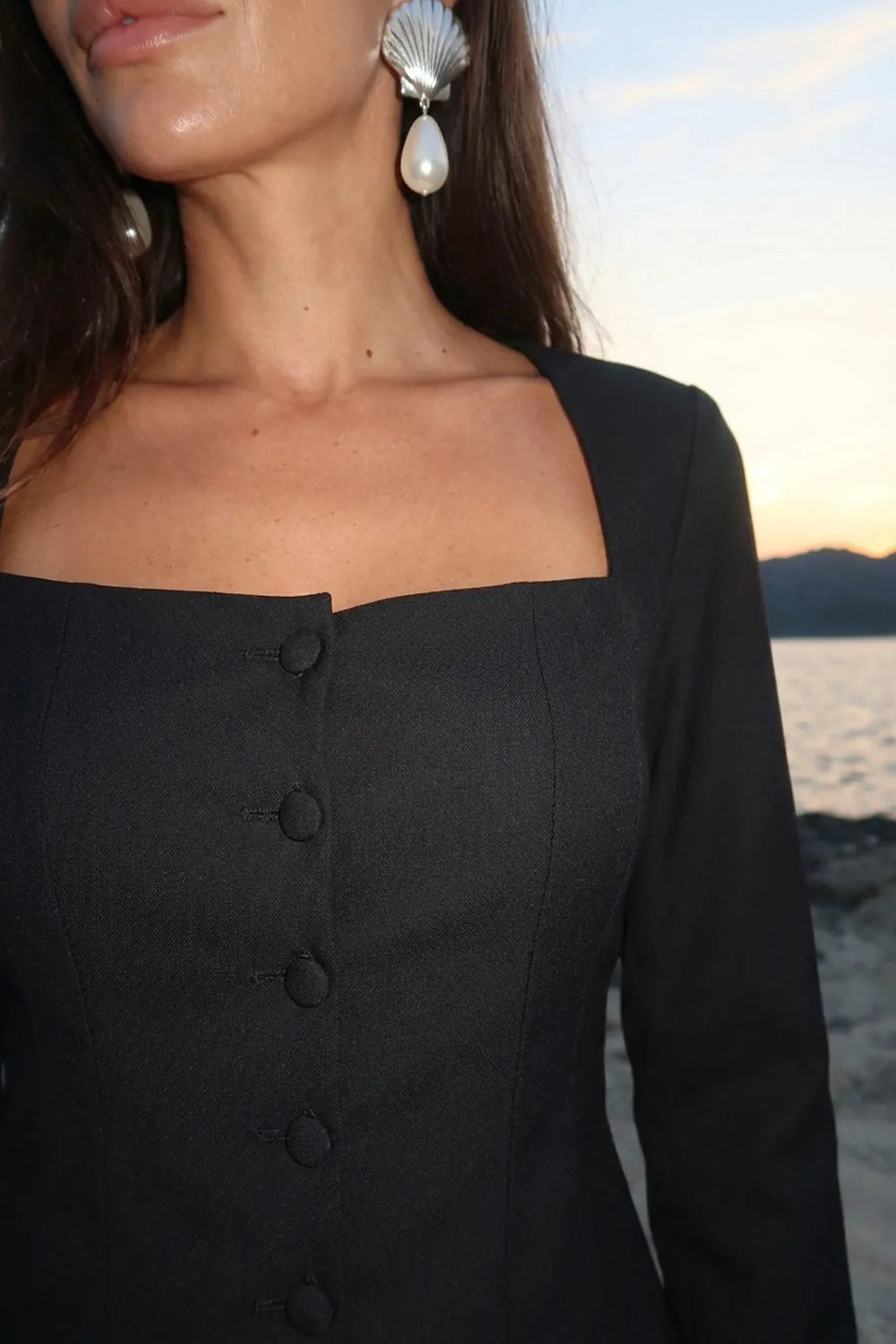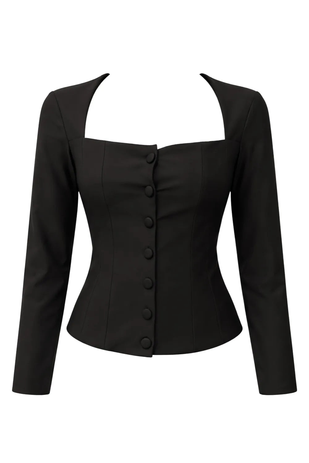 Blusa de fit ajustado, manga larga, escote cuadrado, pinzas frontales y cierre frontal con hilera de botones.