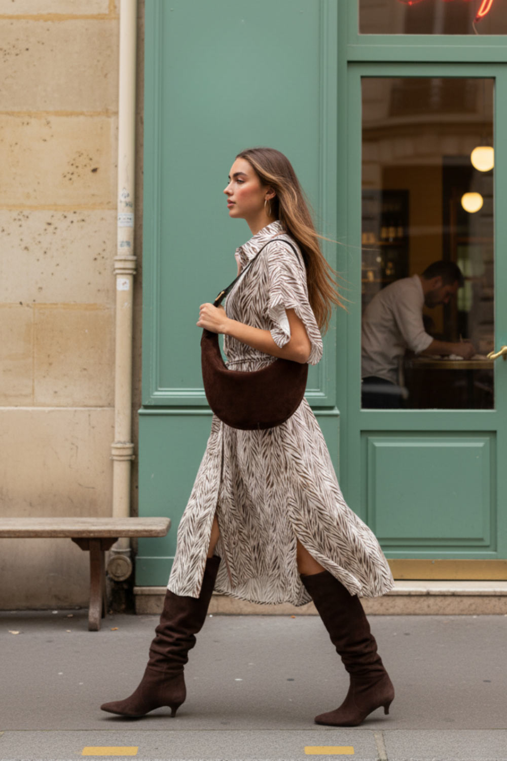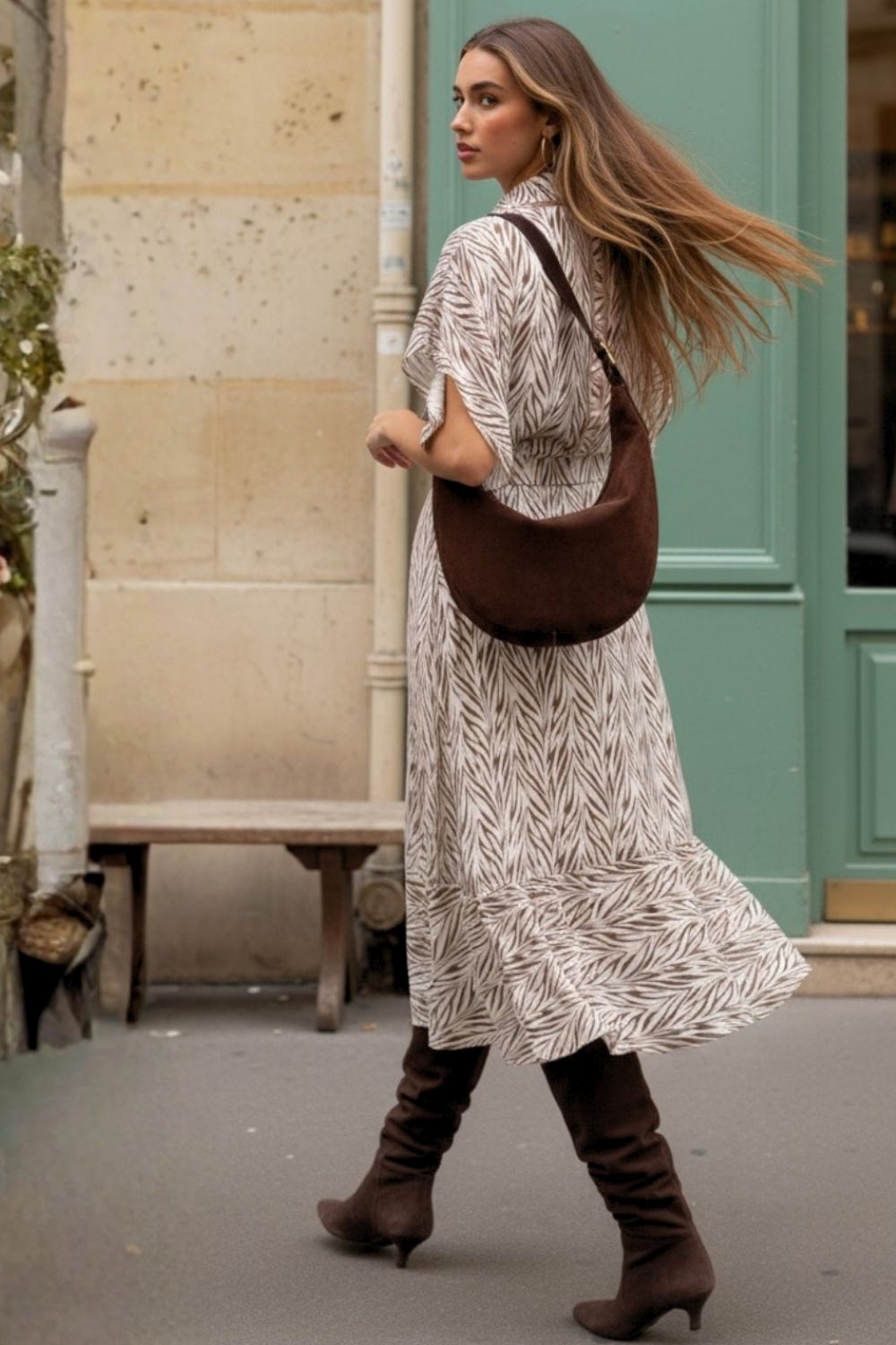 Vestido midi camisero, estampado, de fit fluido, manga corta amplia con olanes, cuello camisero, cinturón amarrable del mismo tejido, pinza de amplitud en espalda y olanes en bajo asimétrico. Detalle de bies en contraste.