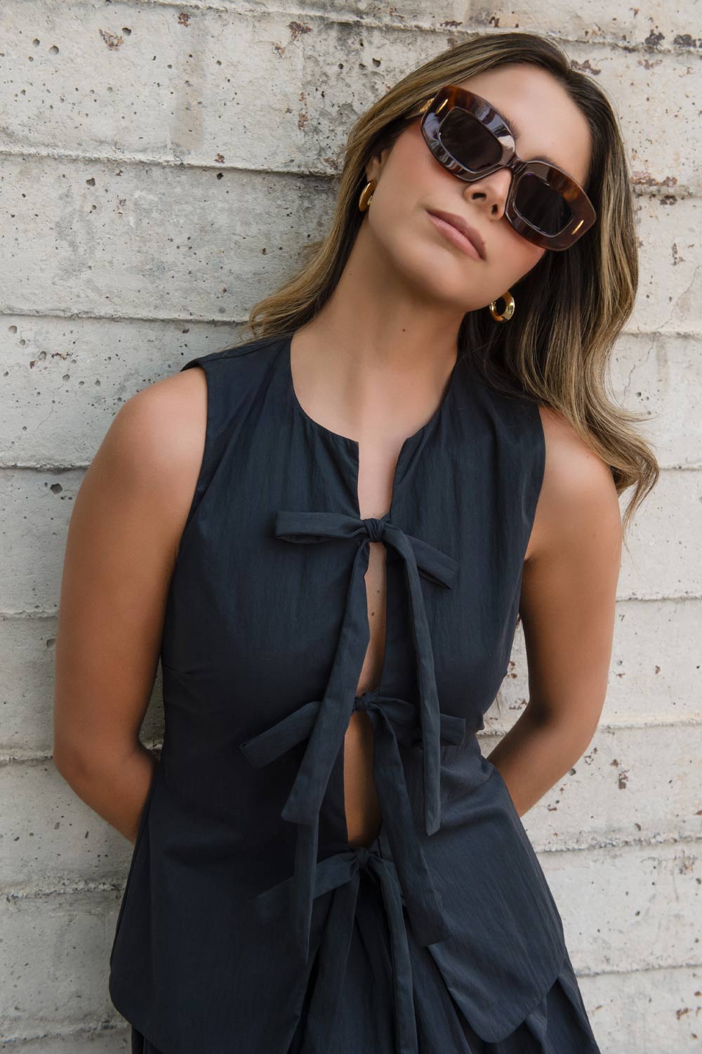 Blusa de fit ajustado, cuello redondo, sin mangas y cierre frontal con lazos amarrables. Detalle de bajo curveado frontal.