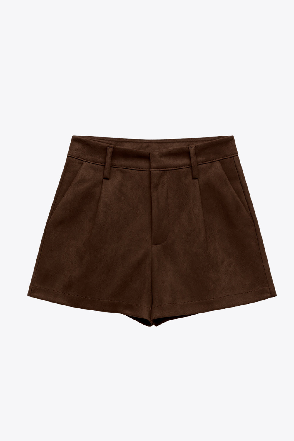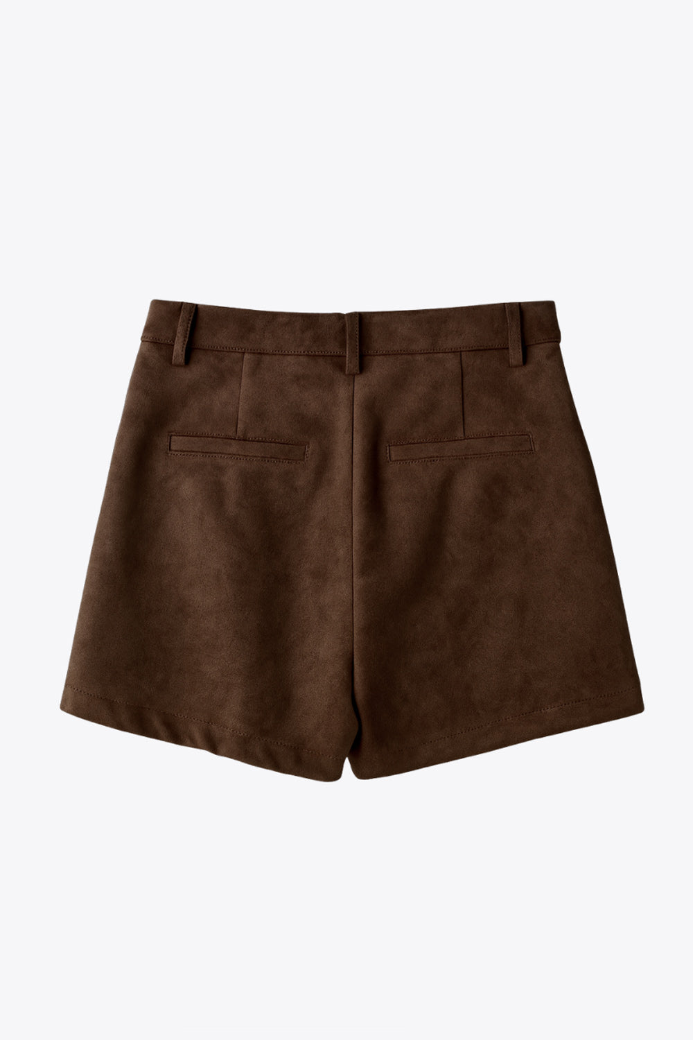 Short corto de gamuza, fit recto, cintura alta con pretina y trabillas, bolsillos delanteros y vivos decorativos posteriores. Detalle de pinzas frontales, cierre frontal con broche y cremallera ocultos.