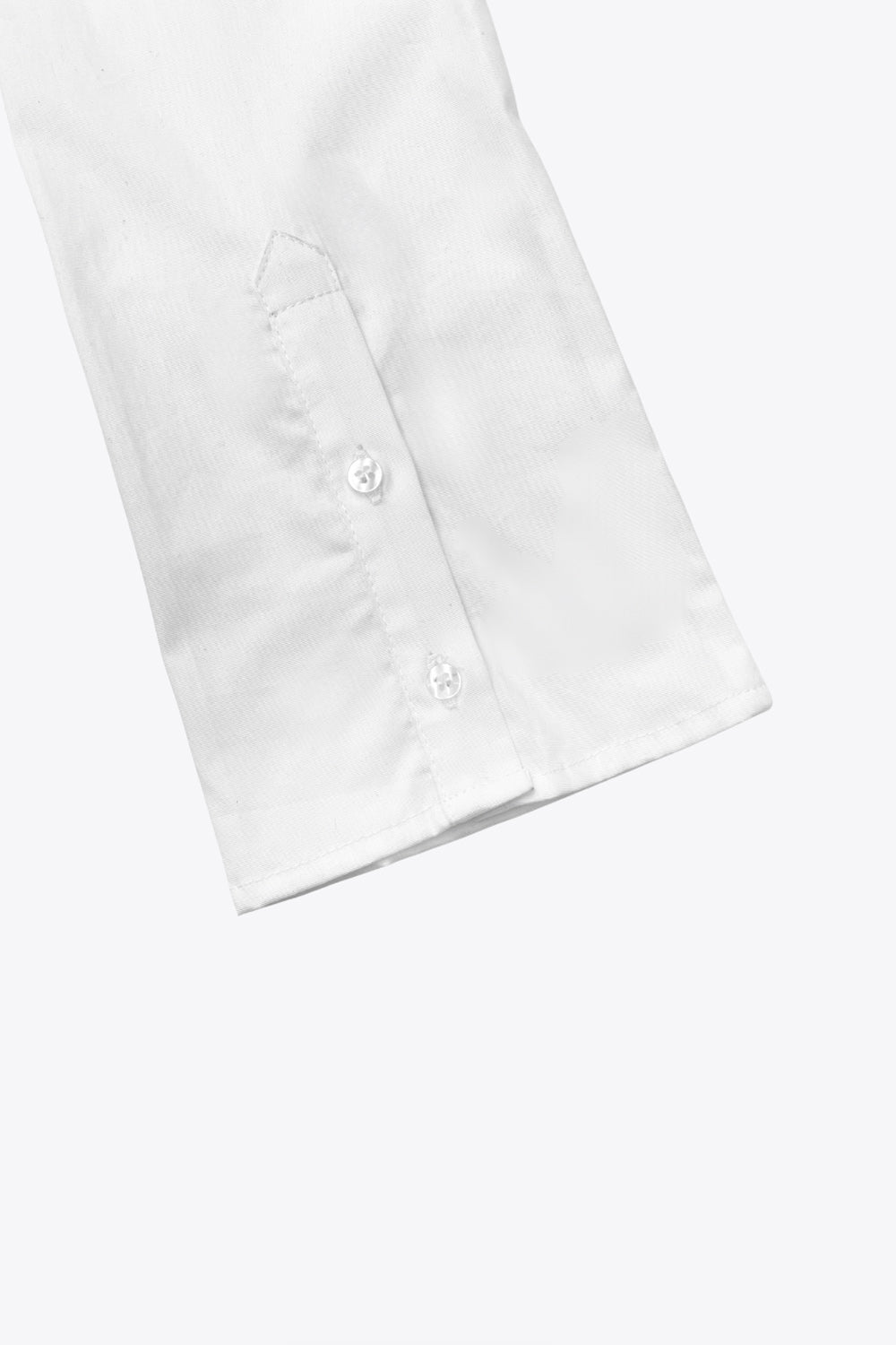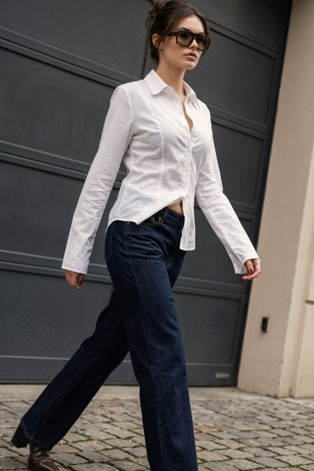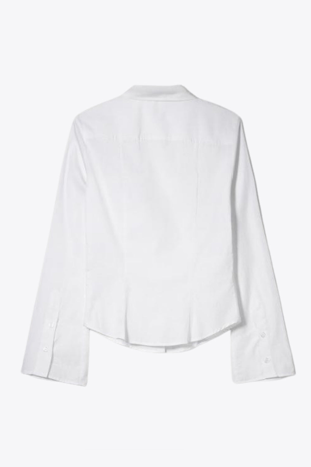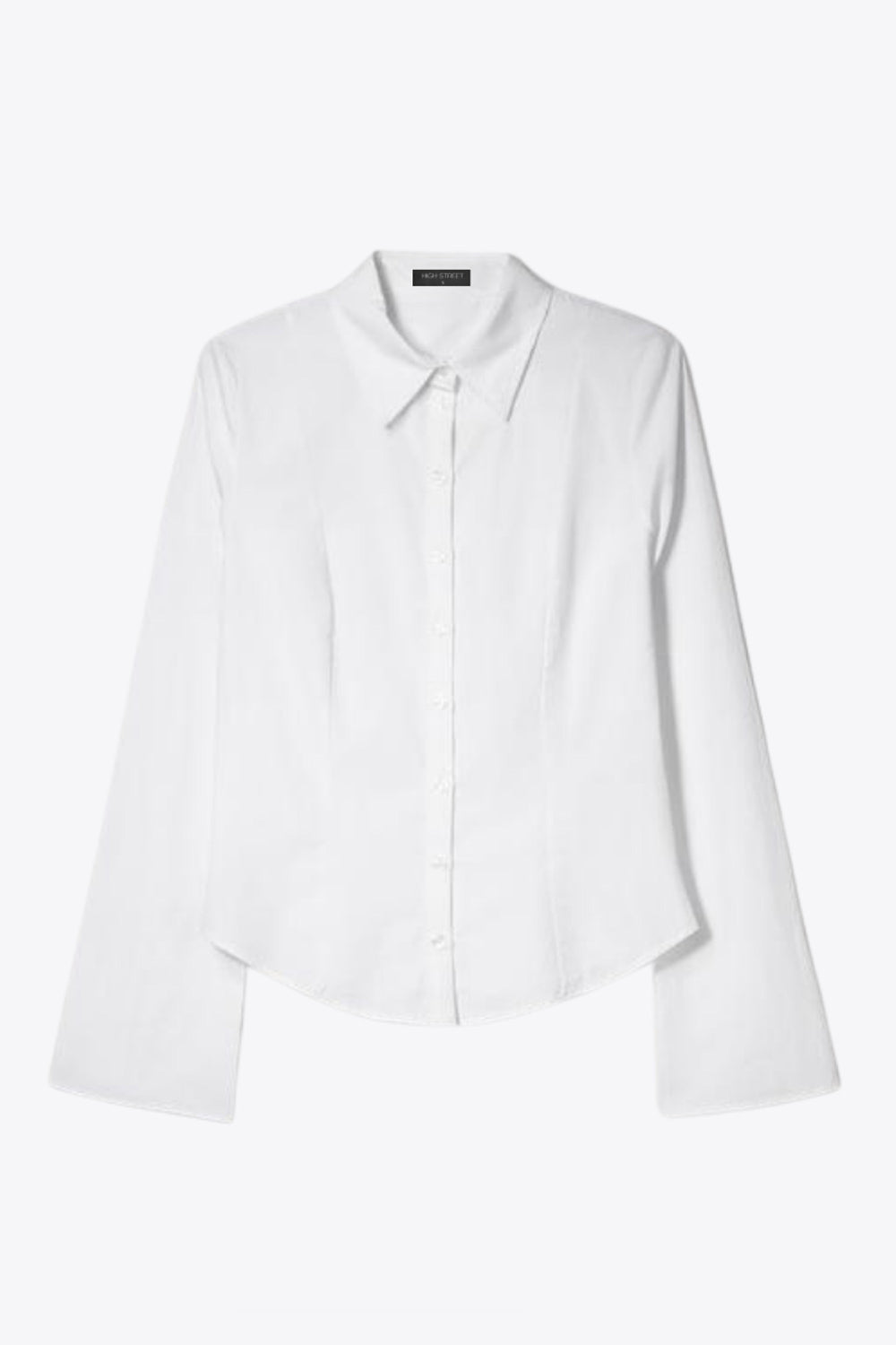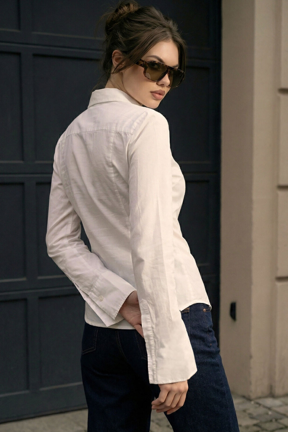 Camisa de fit ajustado, cuello camisero, manga larga amplia con botones, pinzas, bajo curveado y cierre frontal con hilera de botones.
