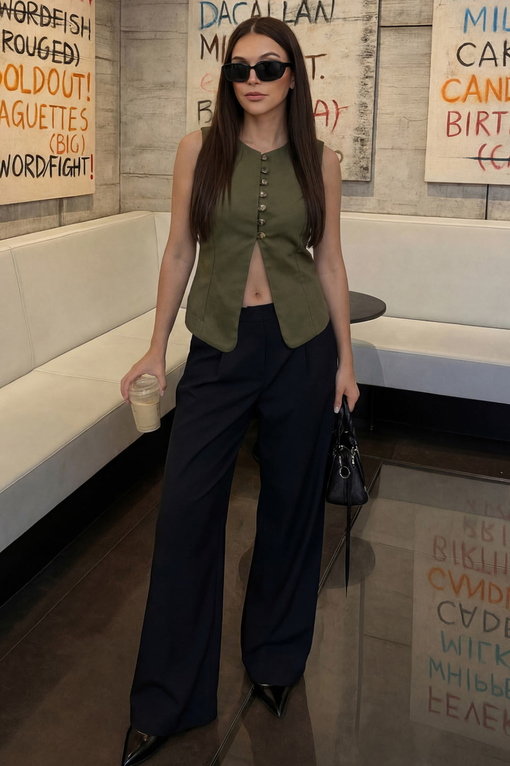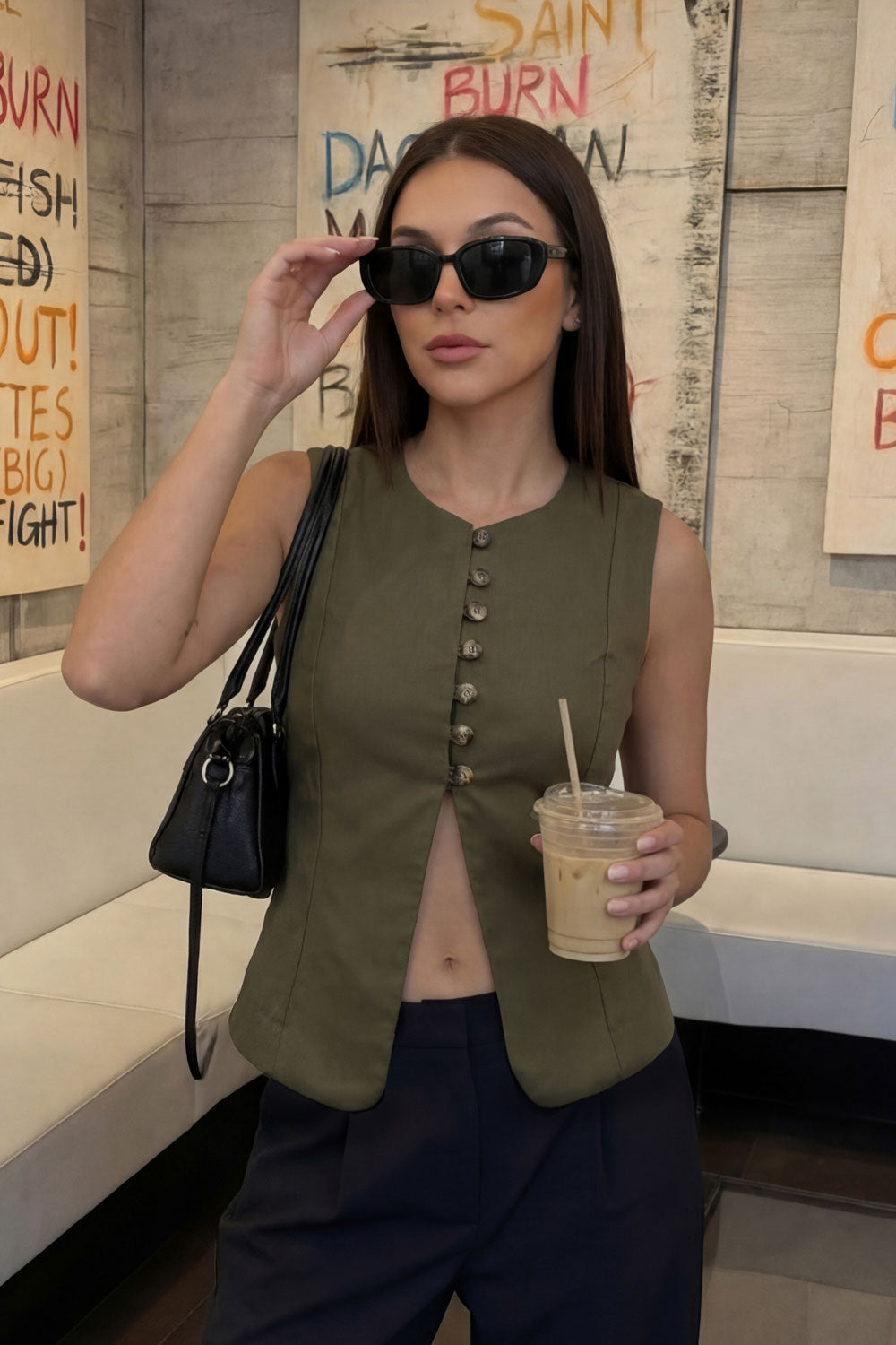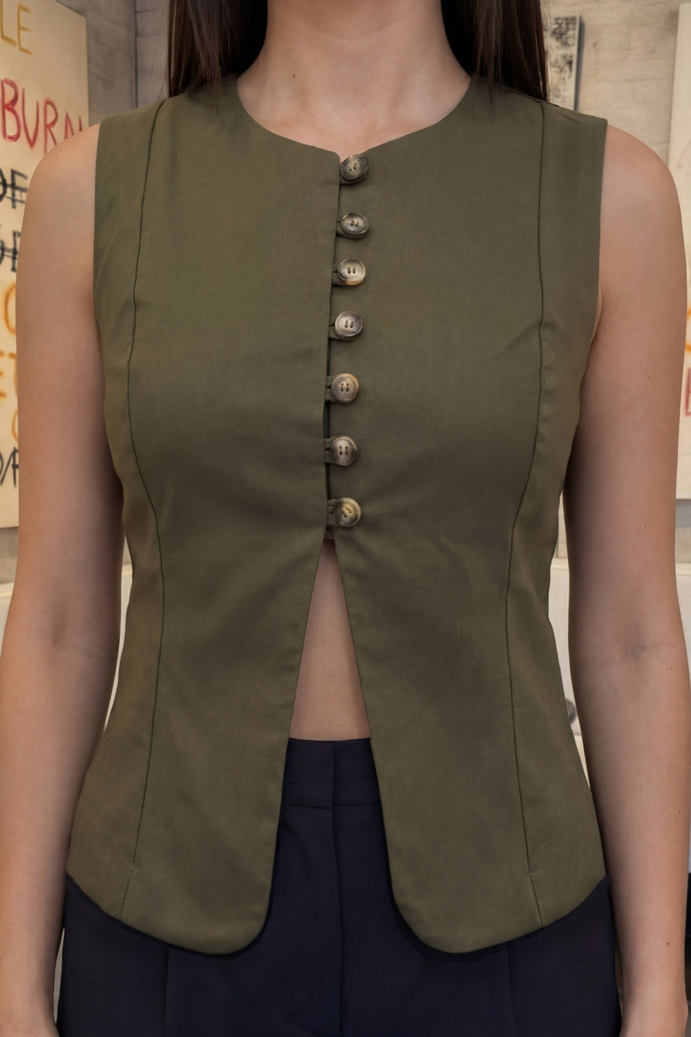Chaleco de fit ajustado, cuello redondo, cierre frontal con hilera de botones en contraste, con abertura frontal en bajo y detalle de lazado ajustable en espalda.