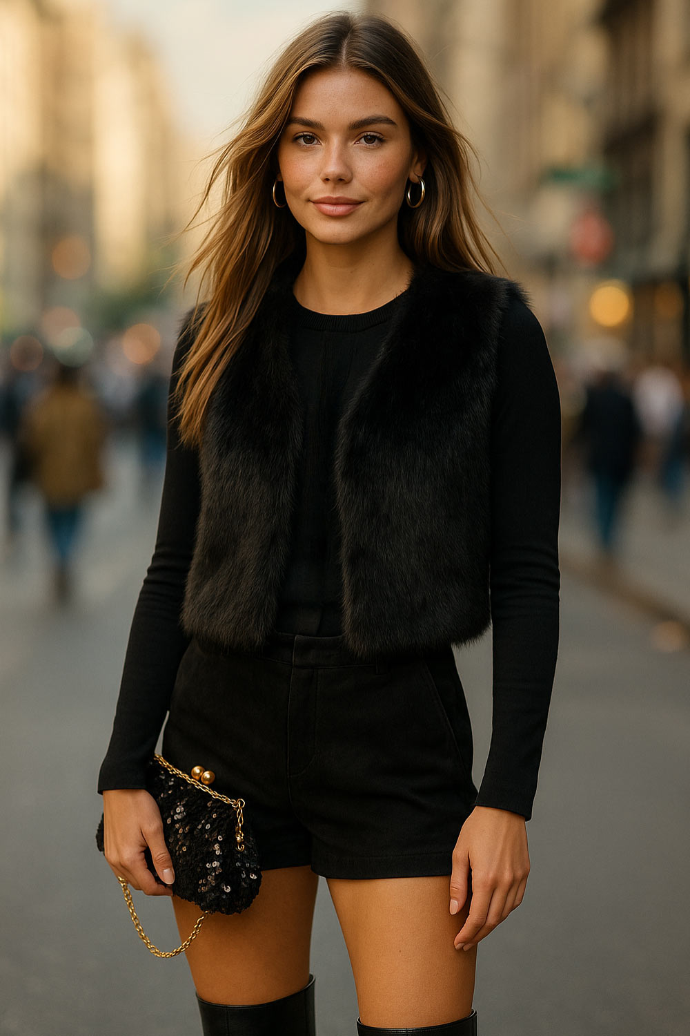 Chaleco corto abierto de efecto pelo, cuello en v y fit recto.