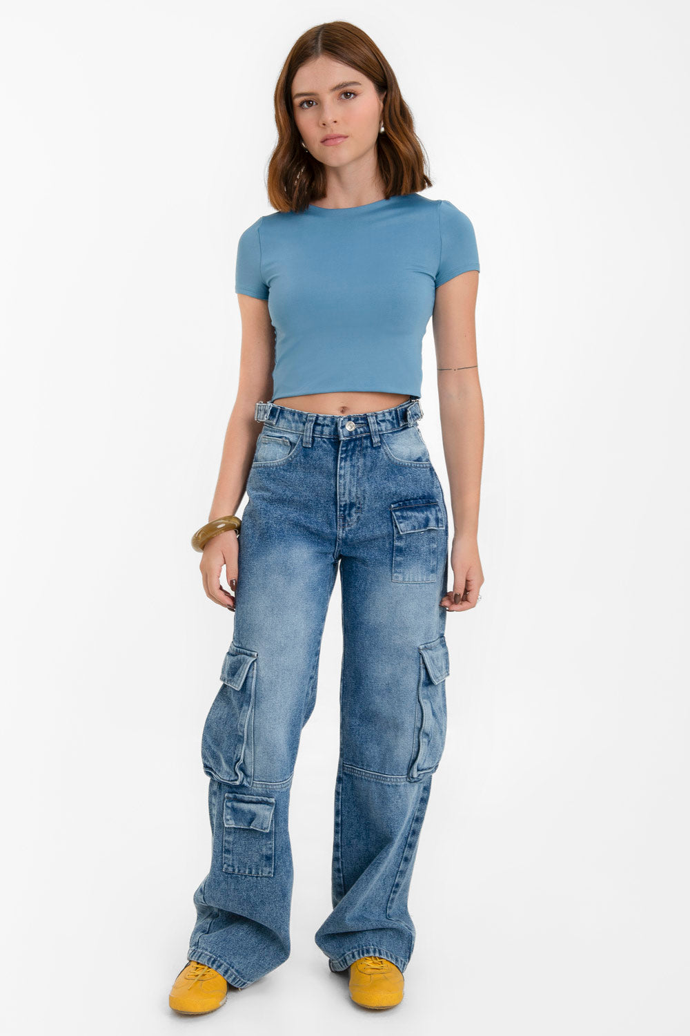 Crop top de fit ajustado, cuello redondo y manga corta.