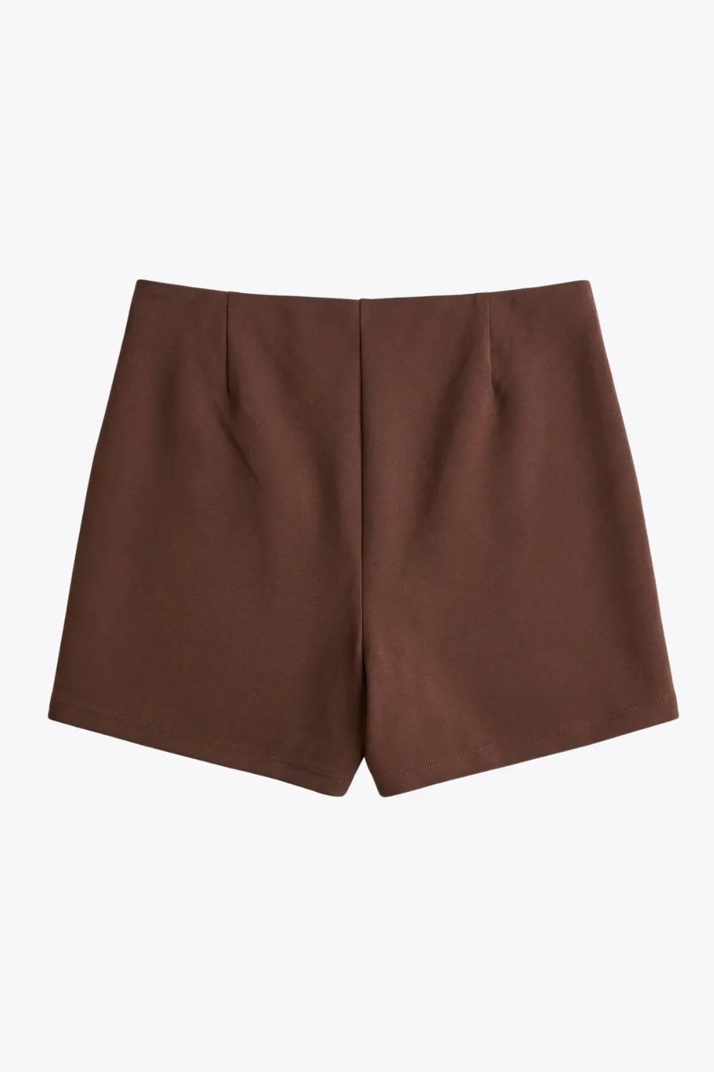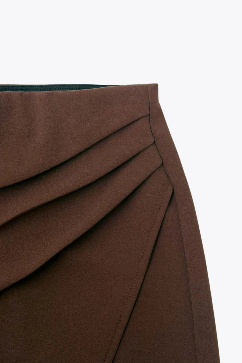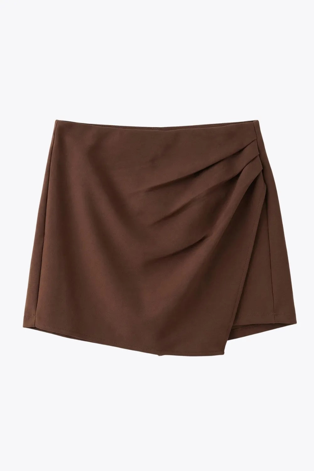 Falda short de corte en a, cintura alta, plisado lateral con bajo curveado, abertura frontal y cierre lateral con cremallera oculta.
