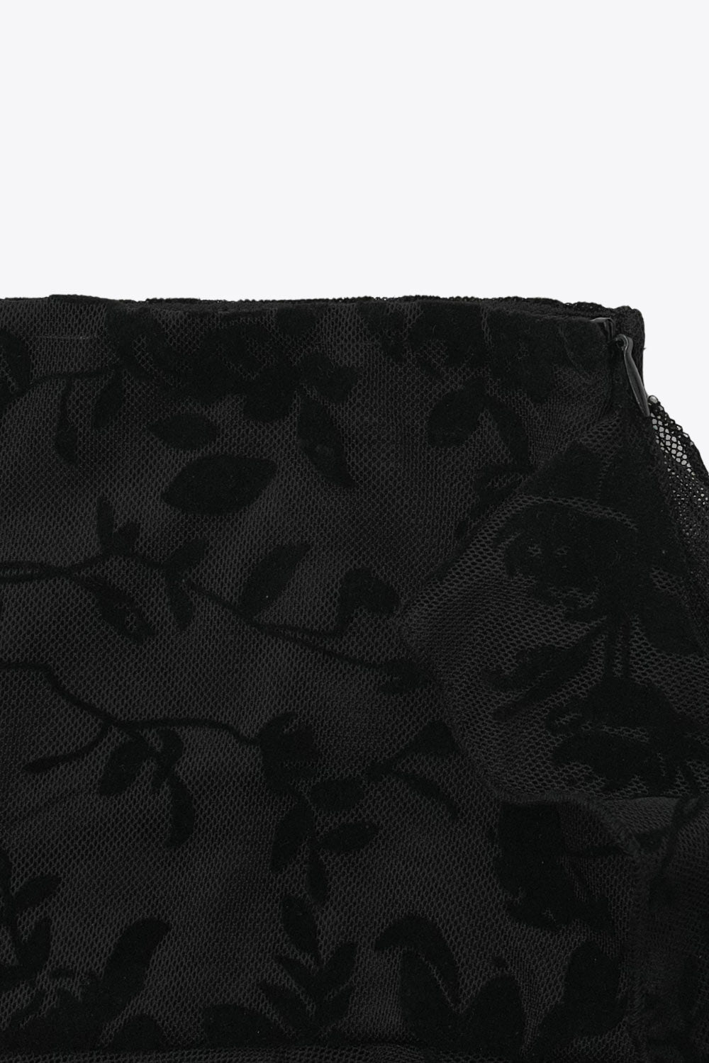 Falda short corto de mesh con estampado floral, cintura alta, corte en a, pretina ancha, bajo con capas de olanes y detalle decorativo. Cierre lateral con cremallera oculta.