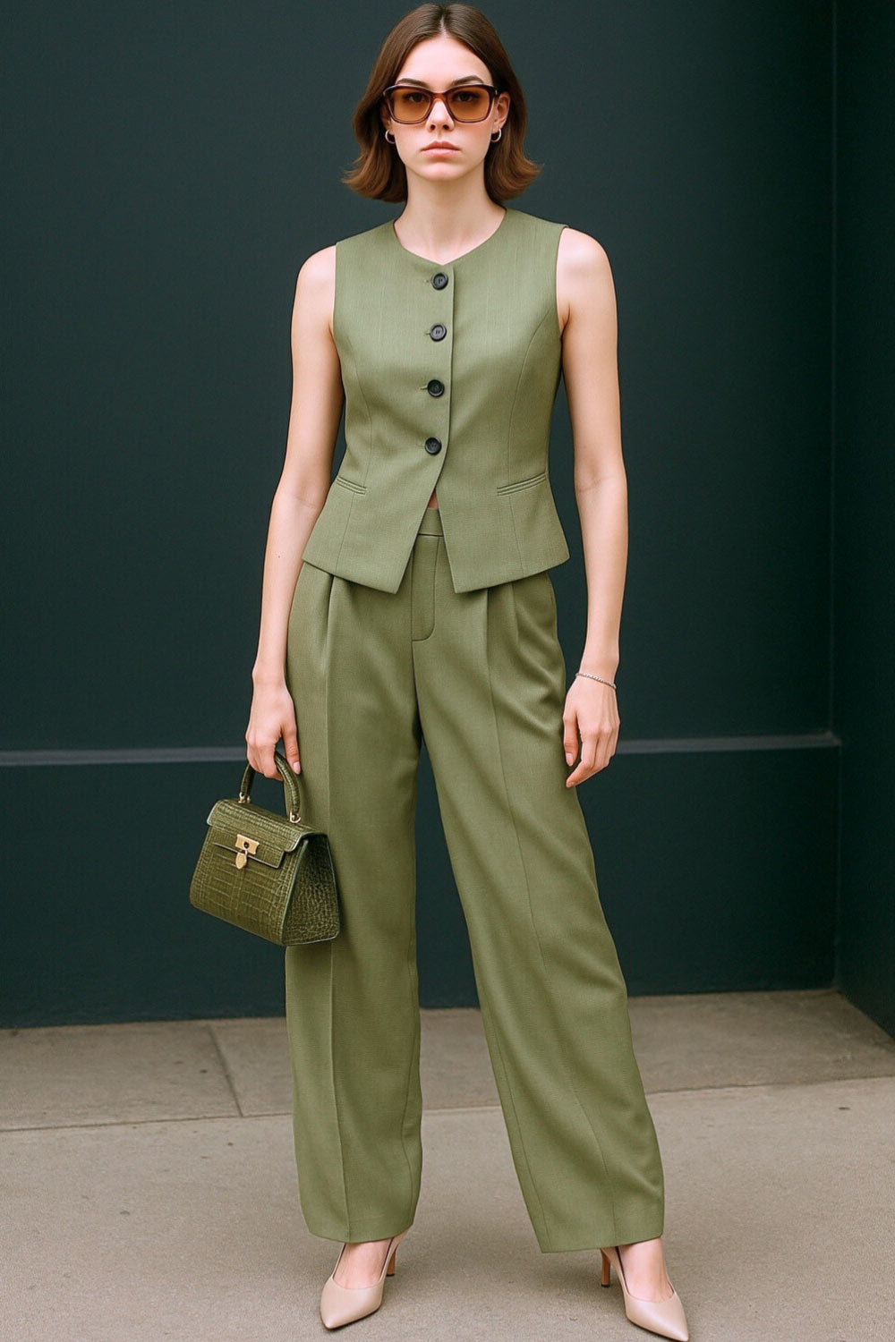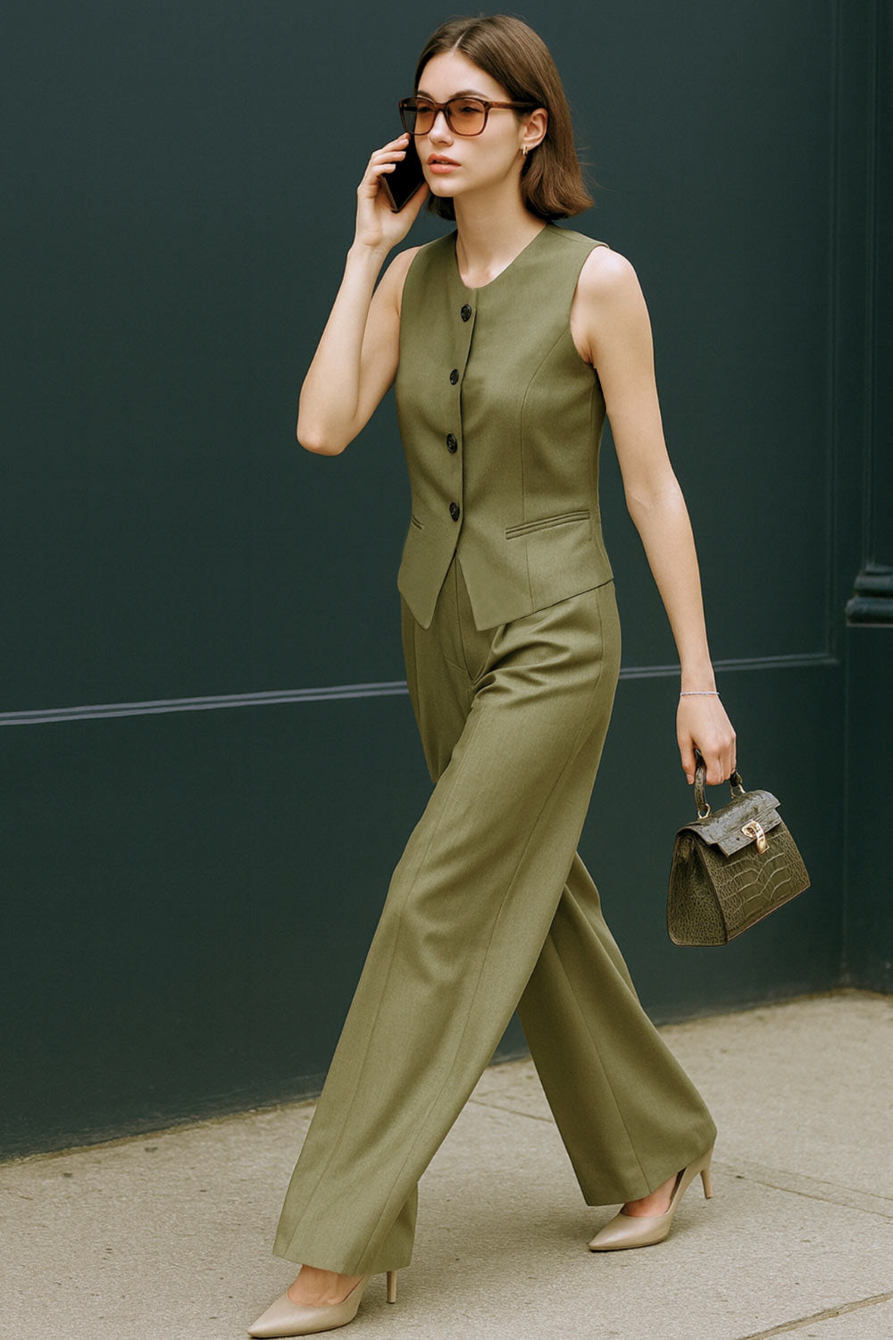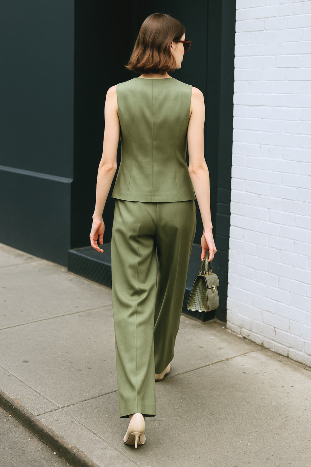 Pantalón de fit wide leg, cintura alta con pretina elástica posterior y trabillas, doble pinza frontal, bolsillos delanteros y detalle de raya frontal. Cierre frontal con broche y cremallera ocultos.