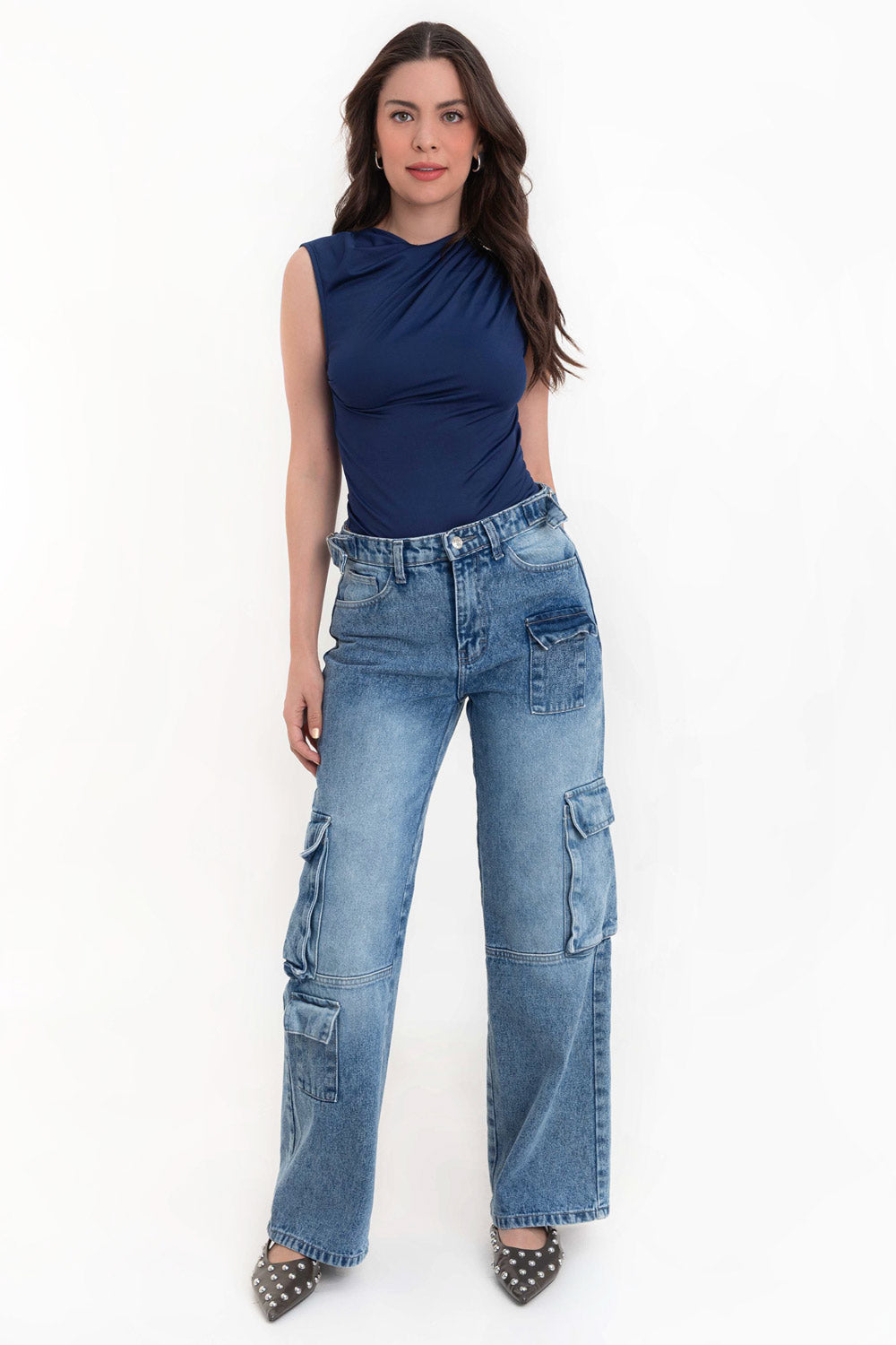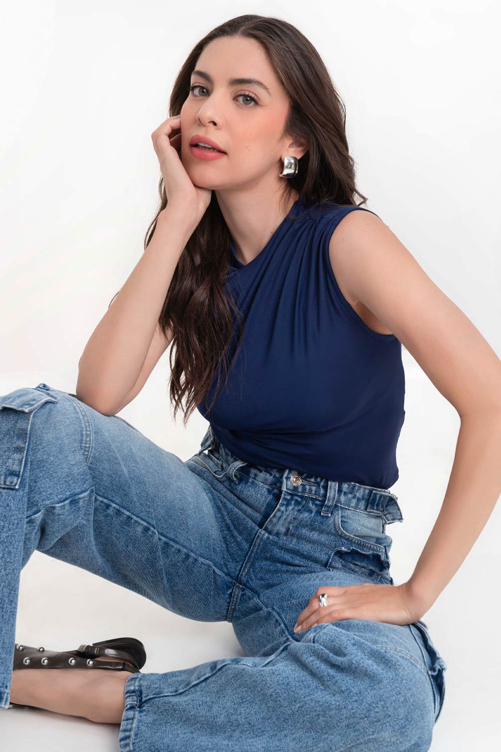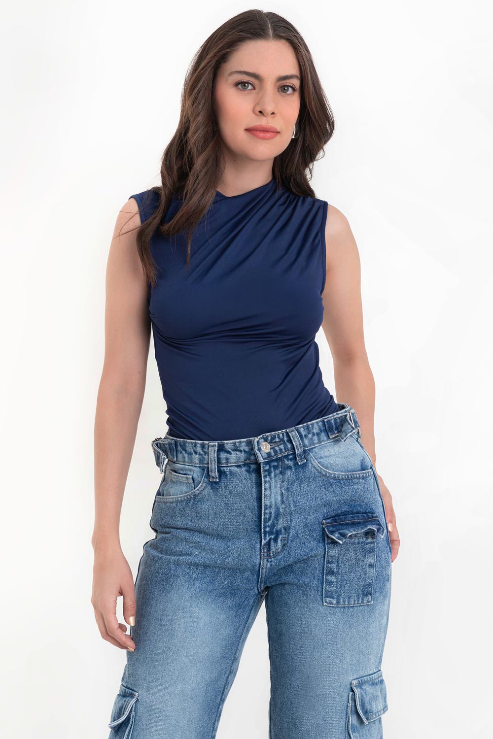 Top de fit ajustado, sin mangas, cuello fluido y plisados decorativos en hombros.