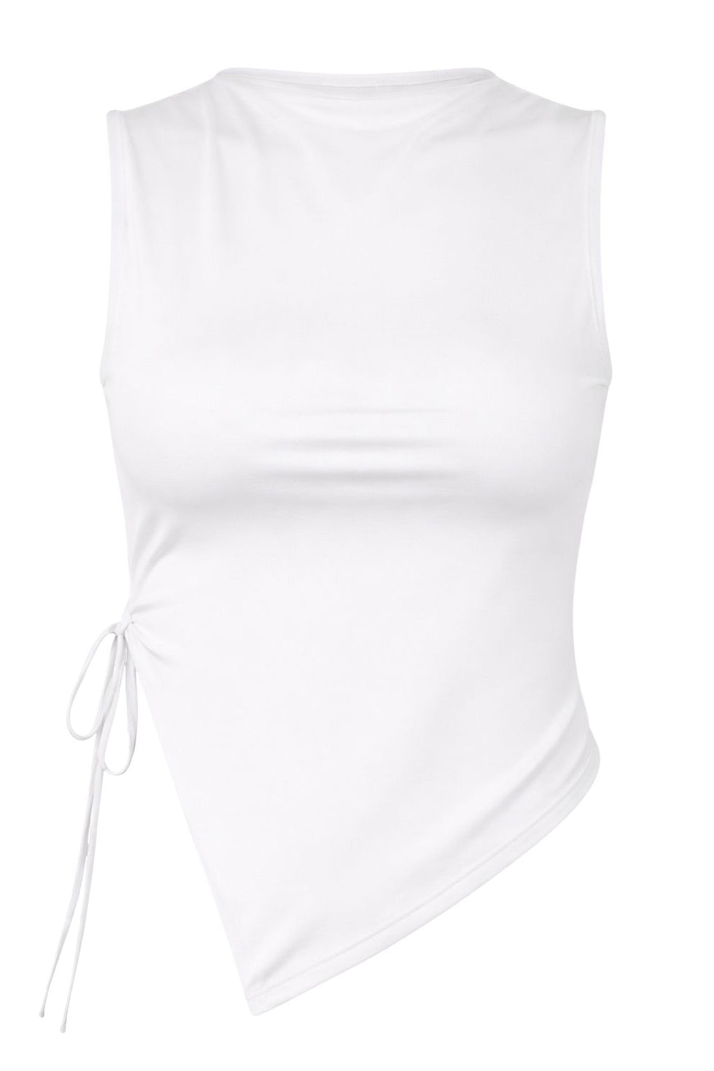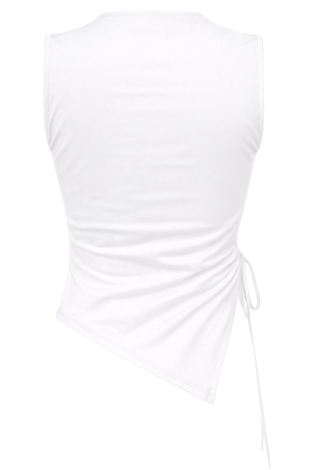 Top asimétrico de fit recto, cuello barco, sin mangas, bajo asimétrico diagonal con abertura lateral y lazo amarrable decorativo.
