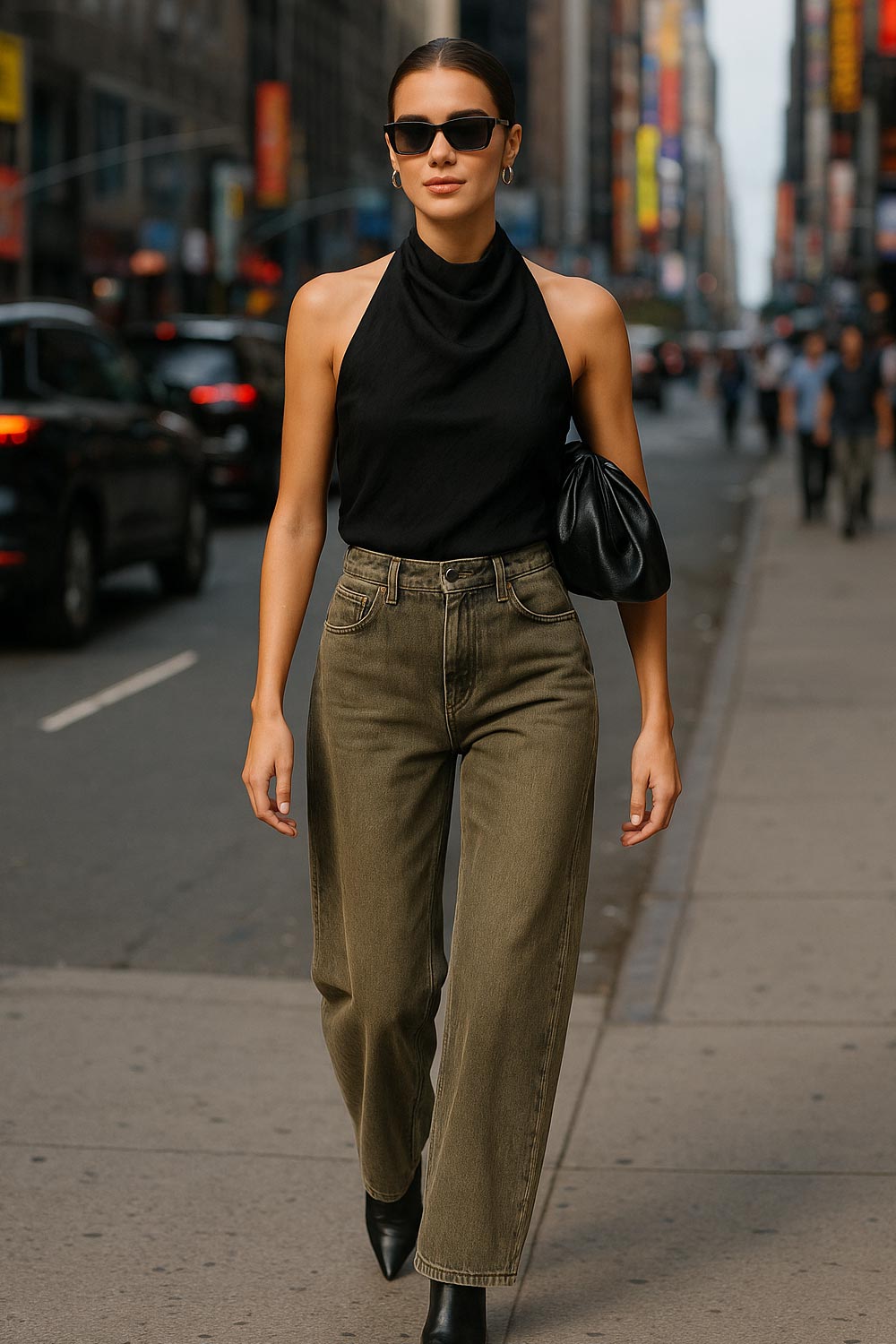 Top corto de fit recto, sin mangas, cuello halter fluido y escote en espalda.