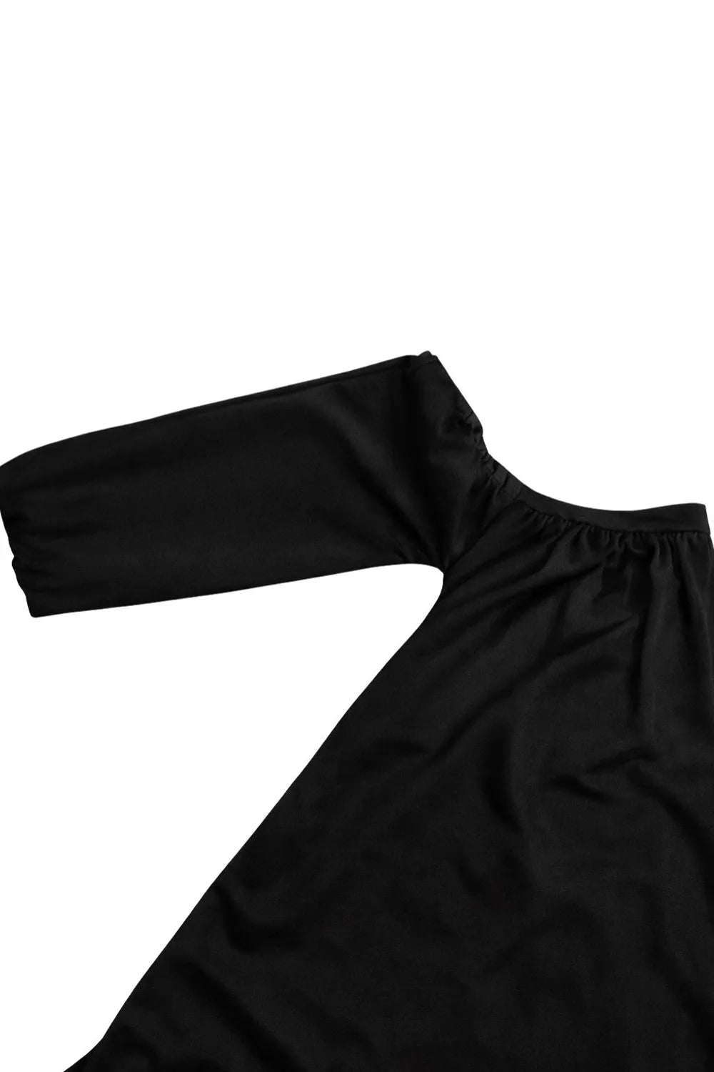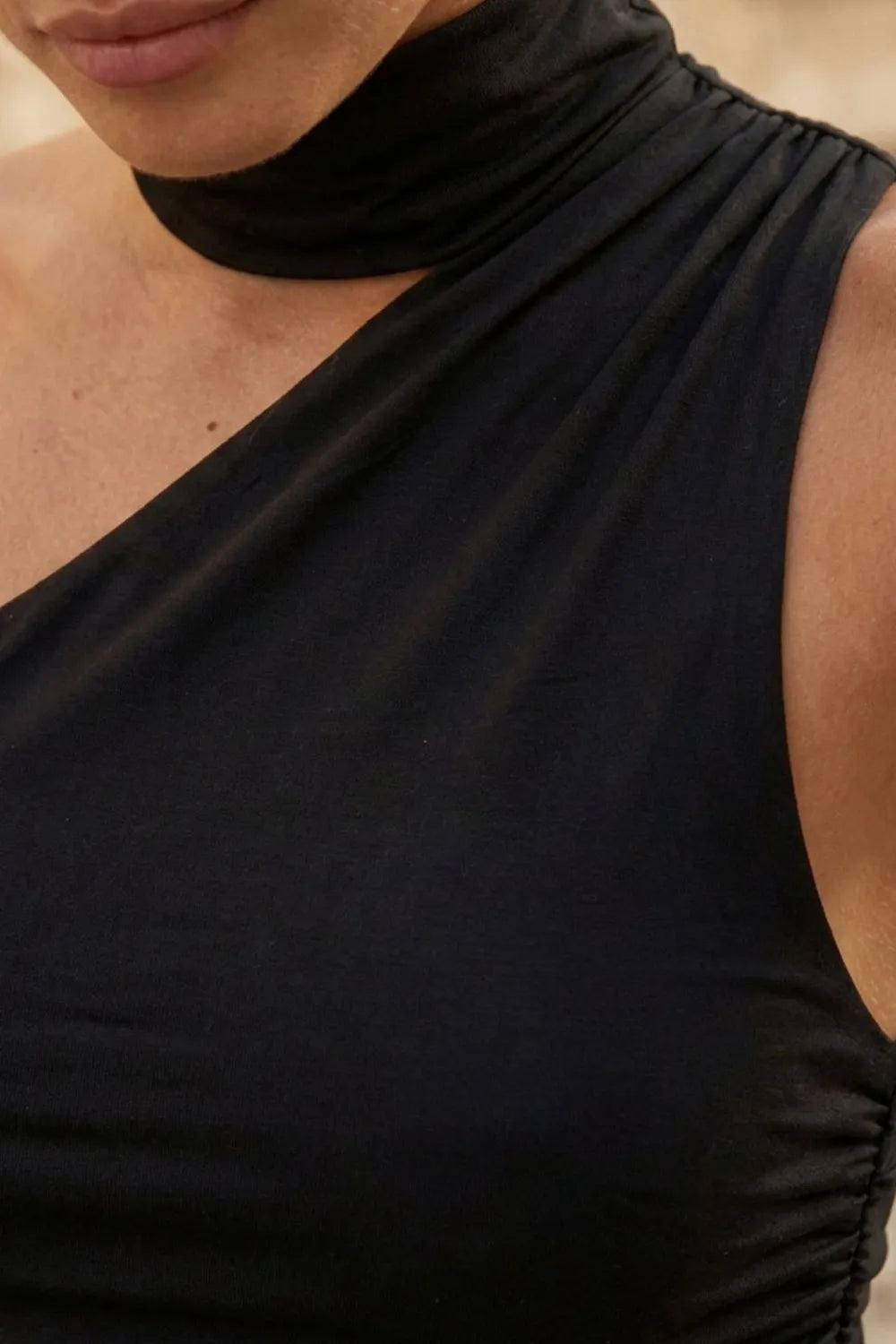Top satinado asimétrico, de fit ajustado, detalles plisados laterales y en hombro, sin mangas, un hombro, escote diagonal y choker con plisados. Cierre posterior con botón y ojal.
