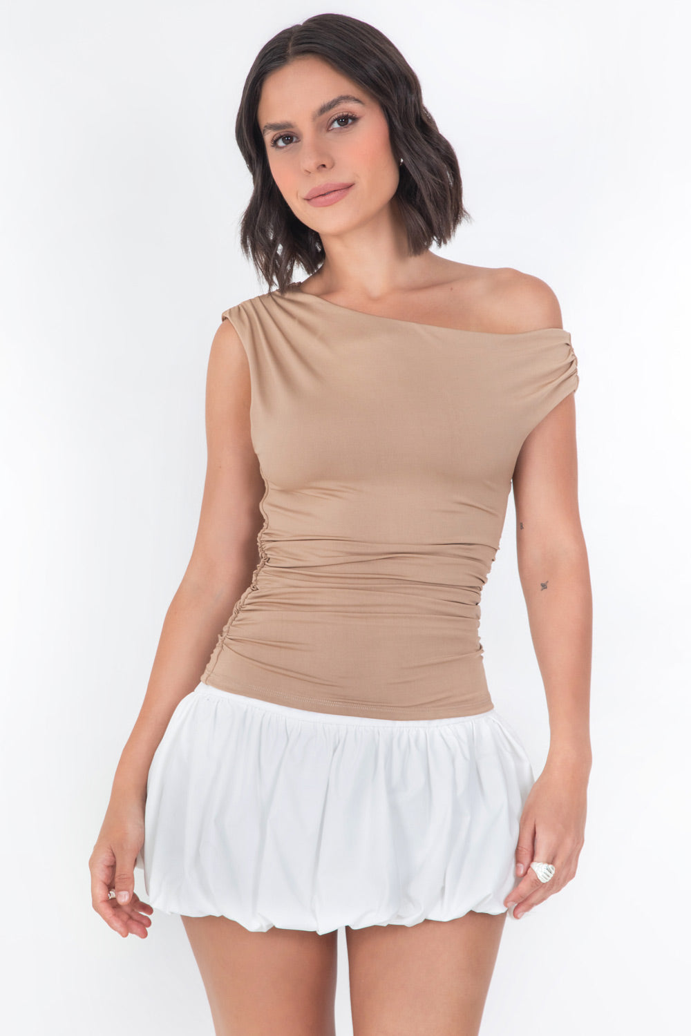 Top ajustado asimétrico de escote diagonal, una manga corta seguida con hombro descubierto, plisados en hombros y costados.