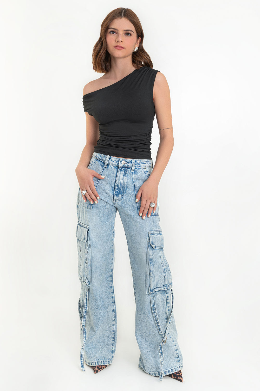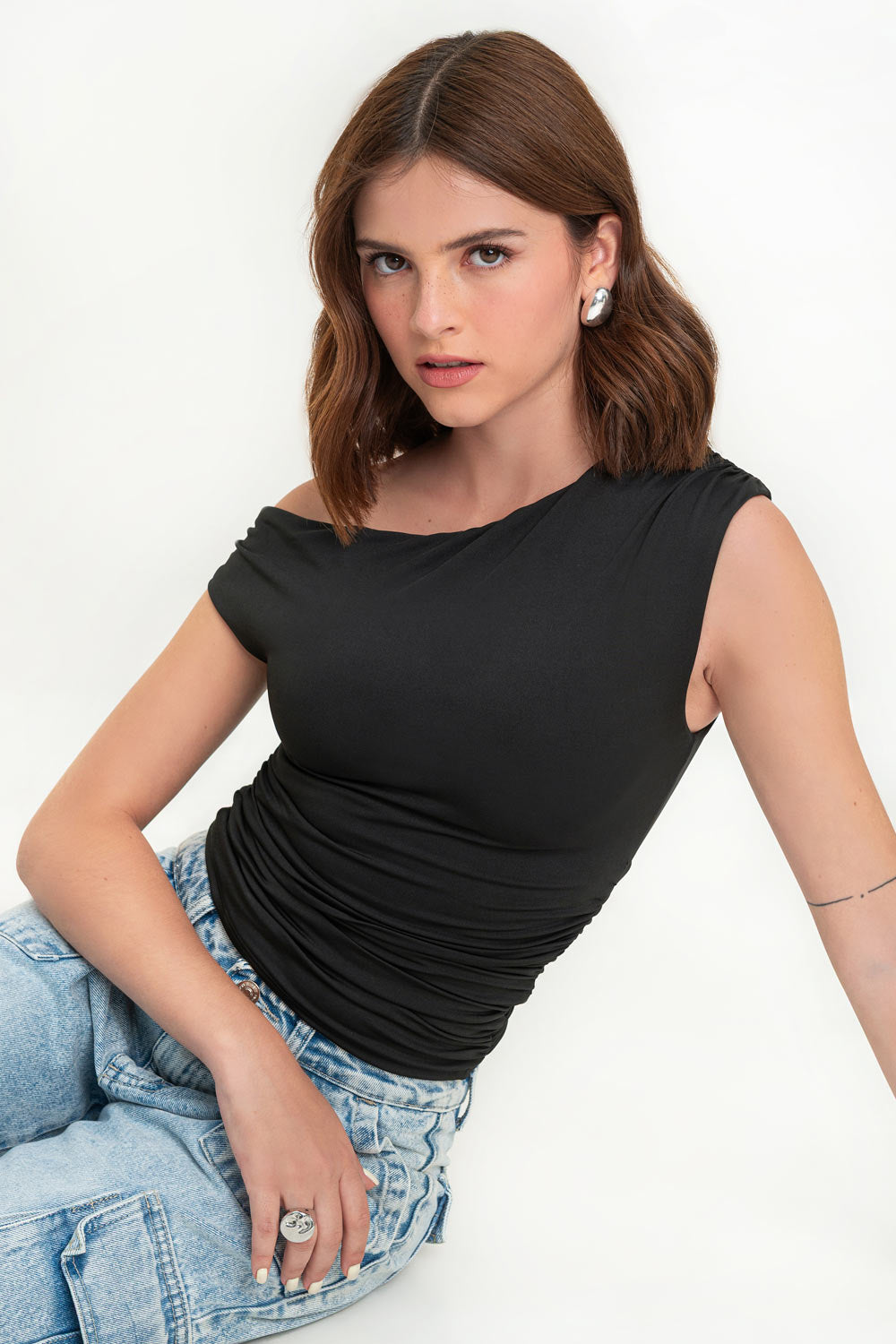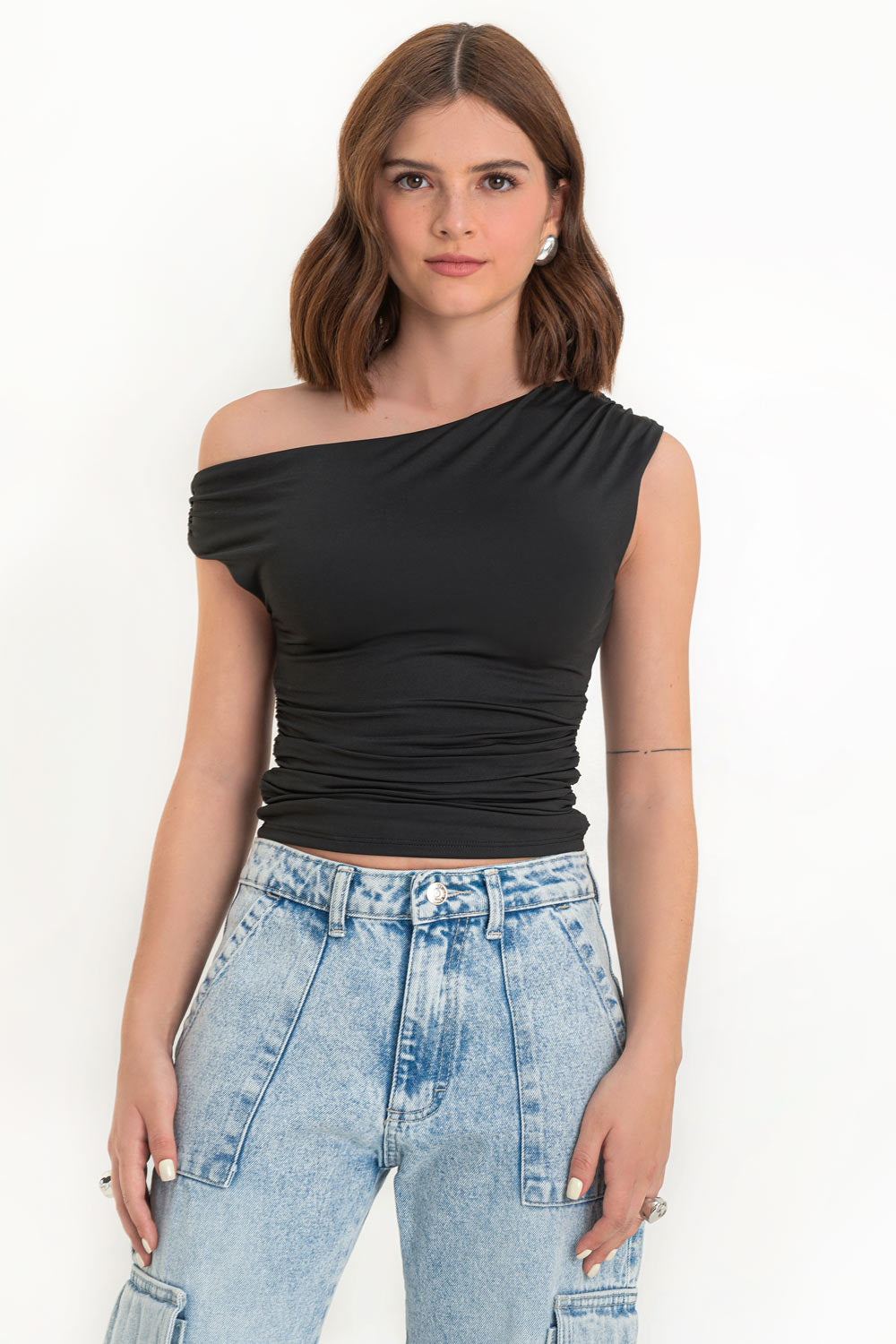 Top ajustado asimétrico de escote diagonal, una manga corta seguida con hombro descubierto, plisados en hombros y costados.