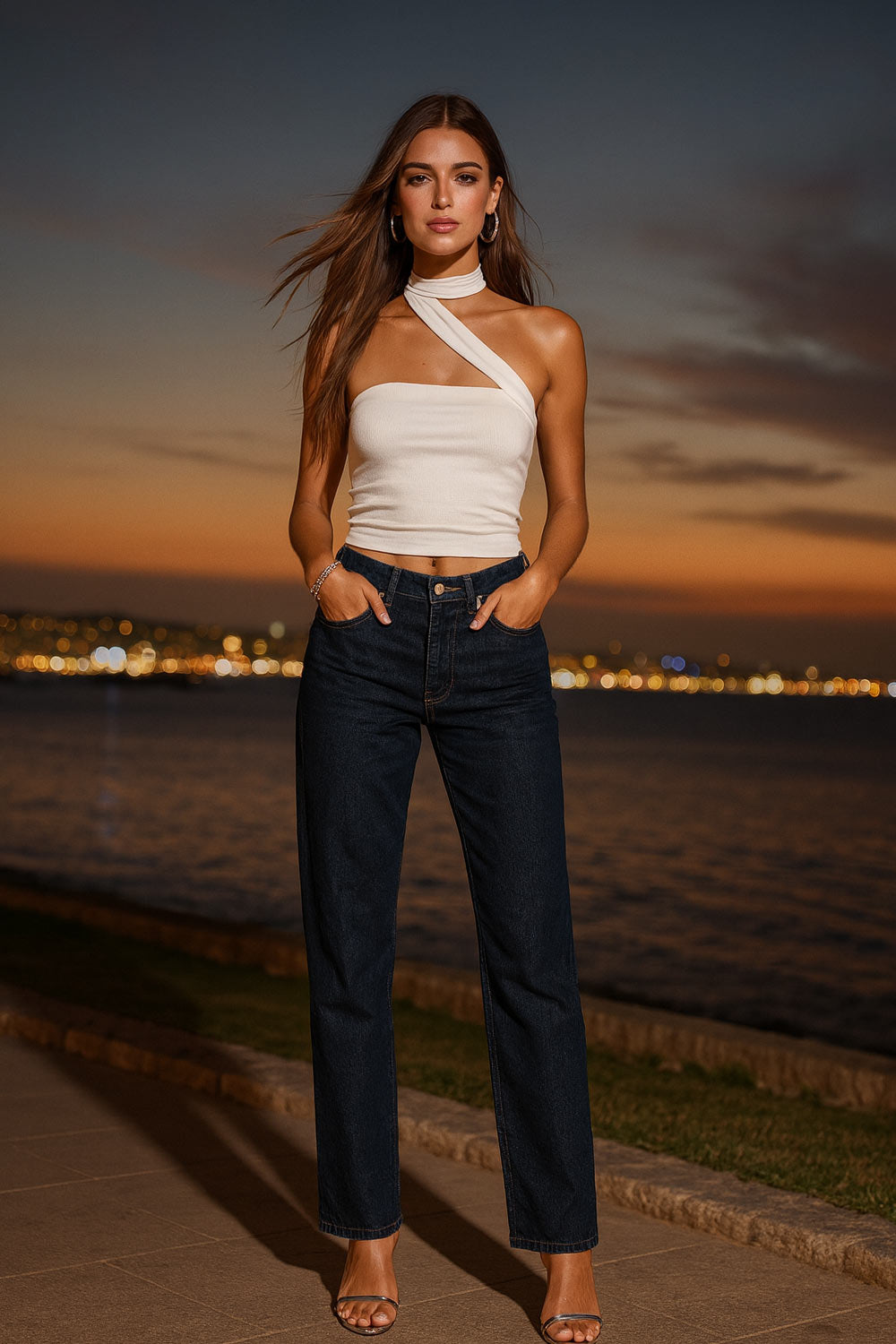 Top tubo de fit ajustado, escote recto, plisados en costados y detalle lateral de choker cruzado.